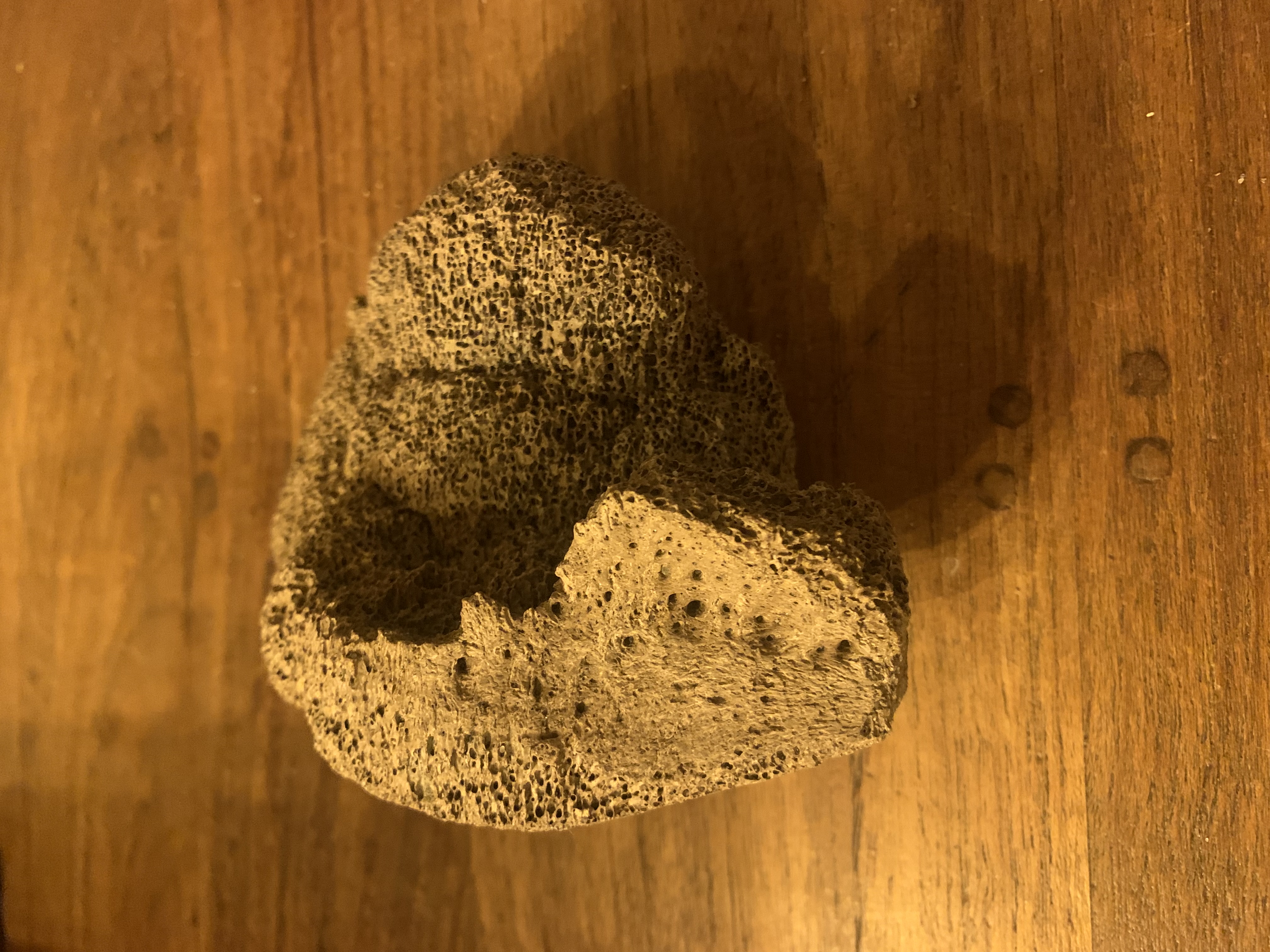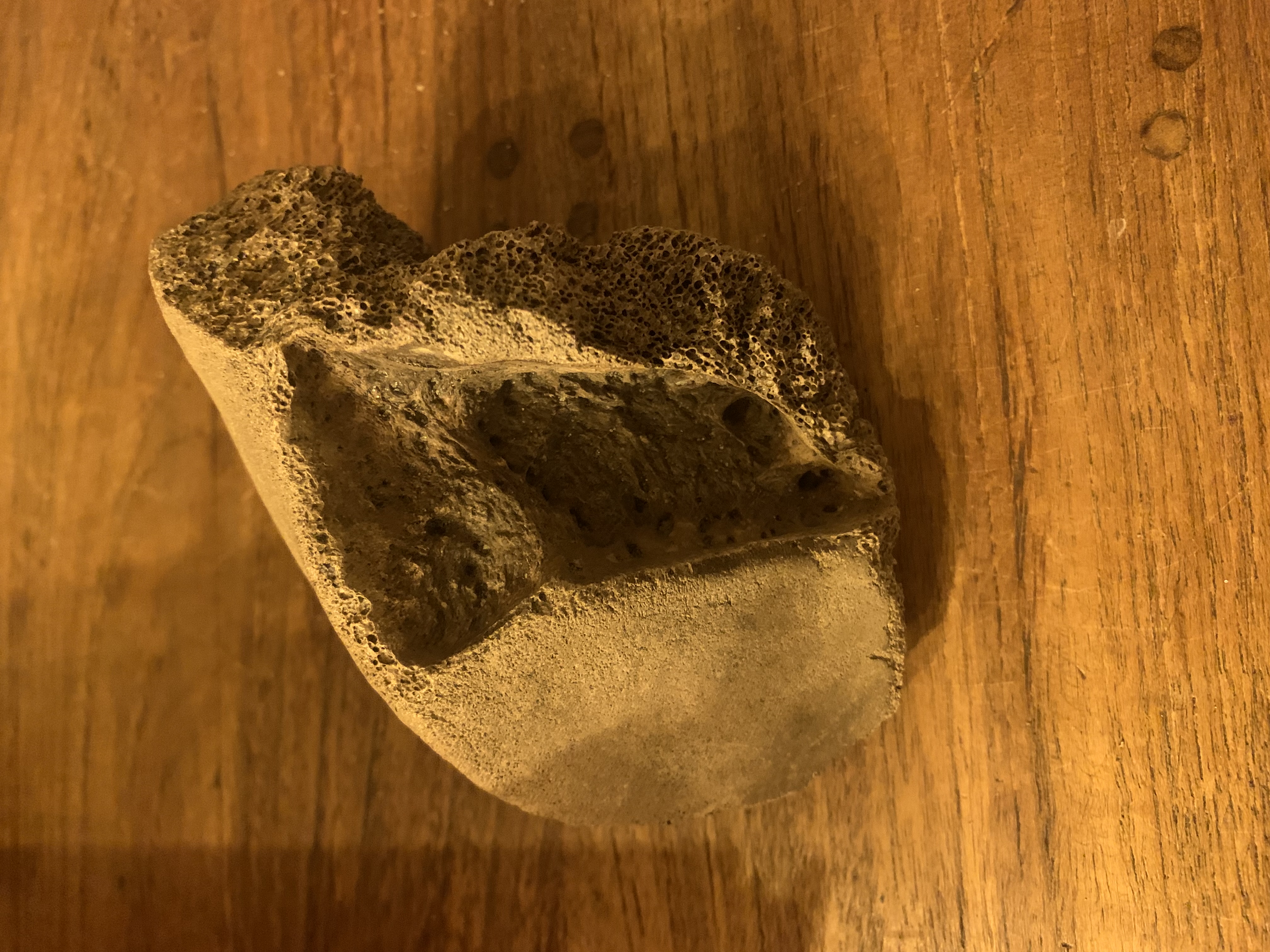 Dit lijkt zo op het eerste gezicht een stuk van een carpale/ tarsale van een mammoet. Maar het is wat lastig van de foto en zonder maatbalk.