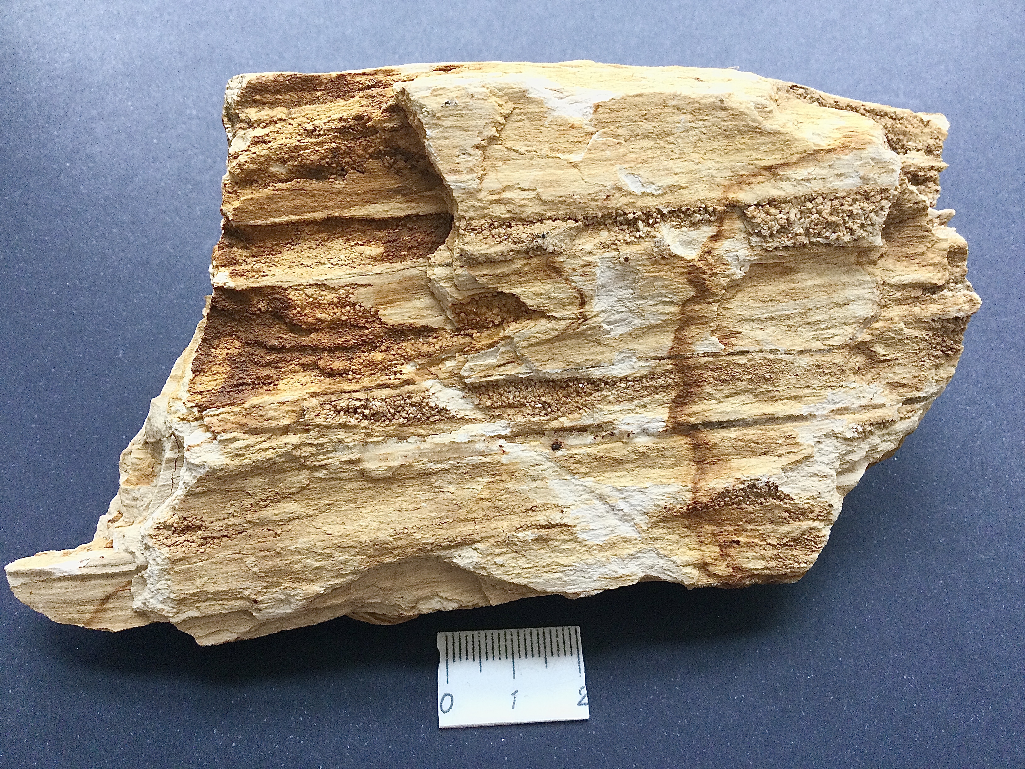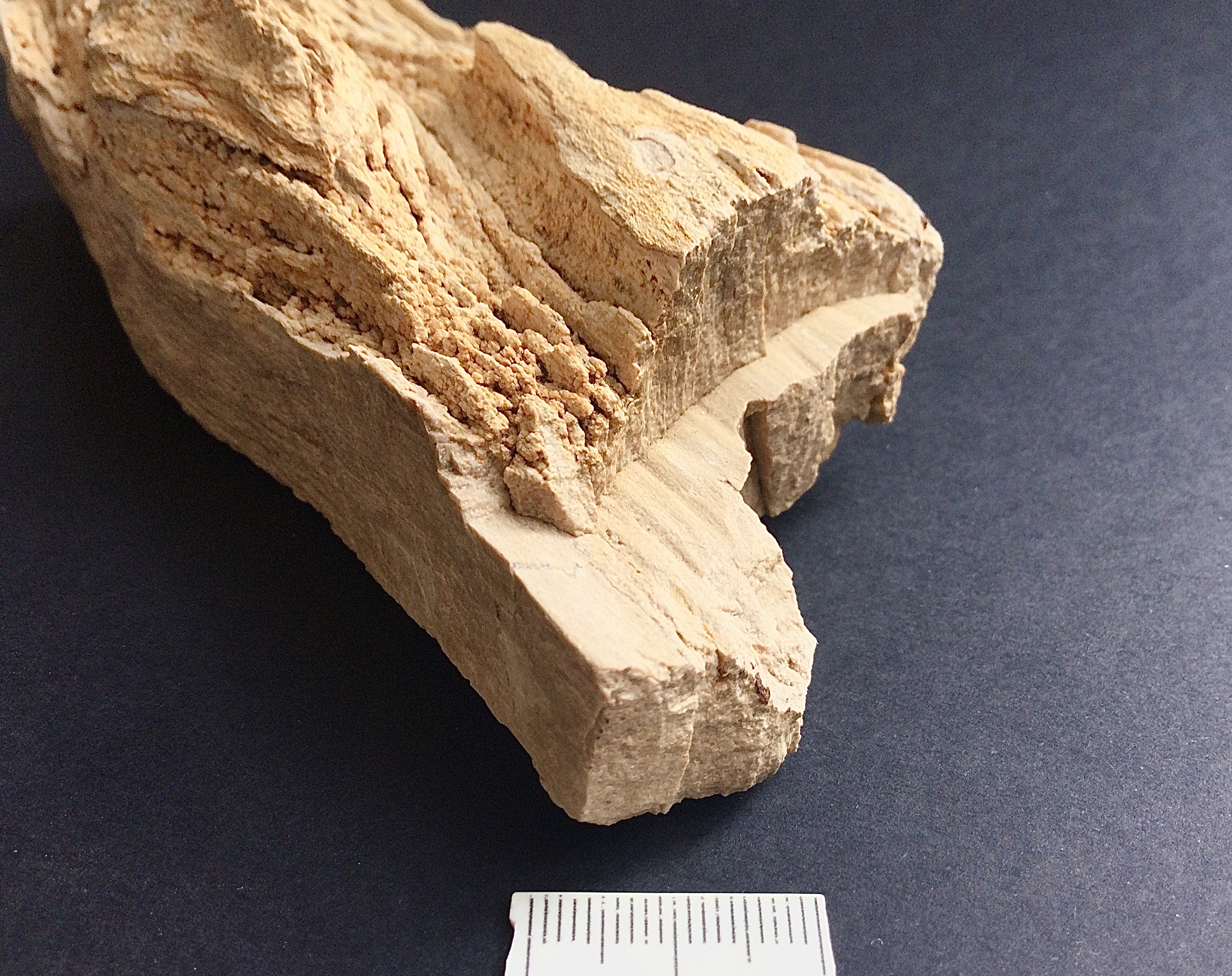 Nieuwe week, nieuwe bijdrage om deze draad in beweging te houden: ditmaal een stuk Woodworthia-type naaldhout met een krans van zijtaklittekens afkomstig uit het Carnien (Late Trias) van de Molteno Fm. rondom Gokwe, Zimbabwe.