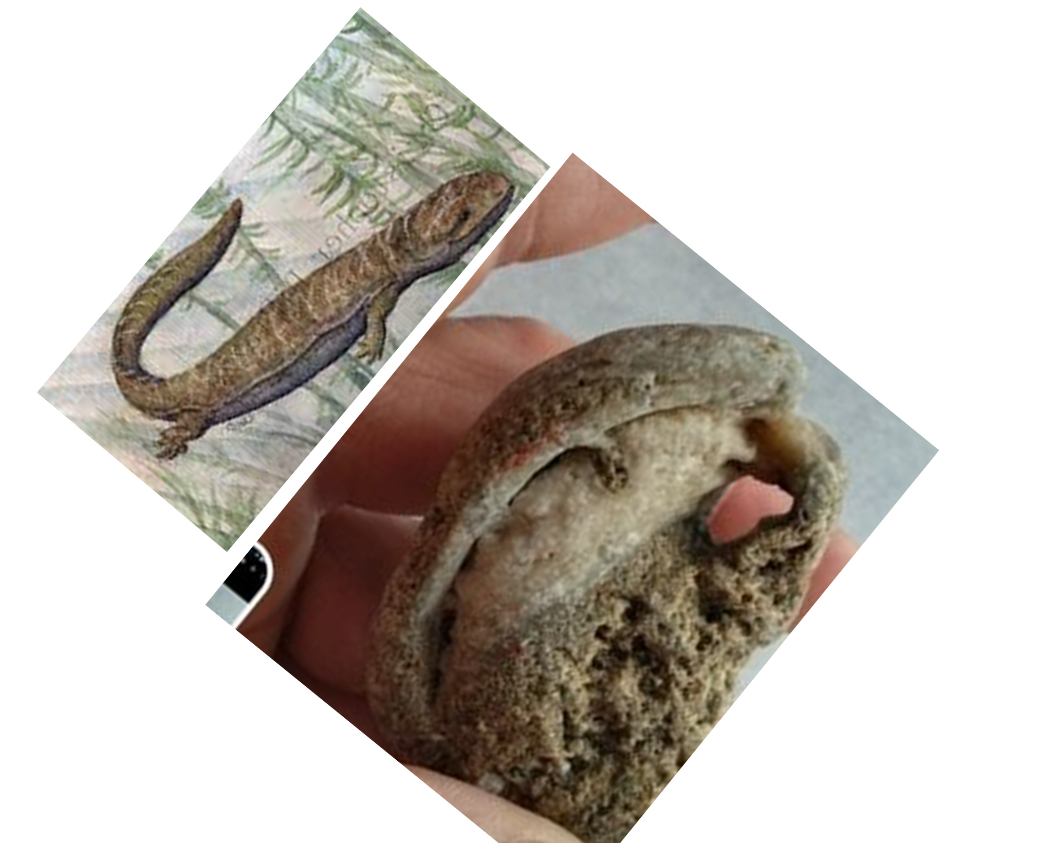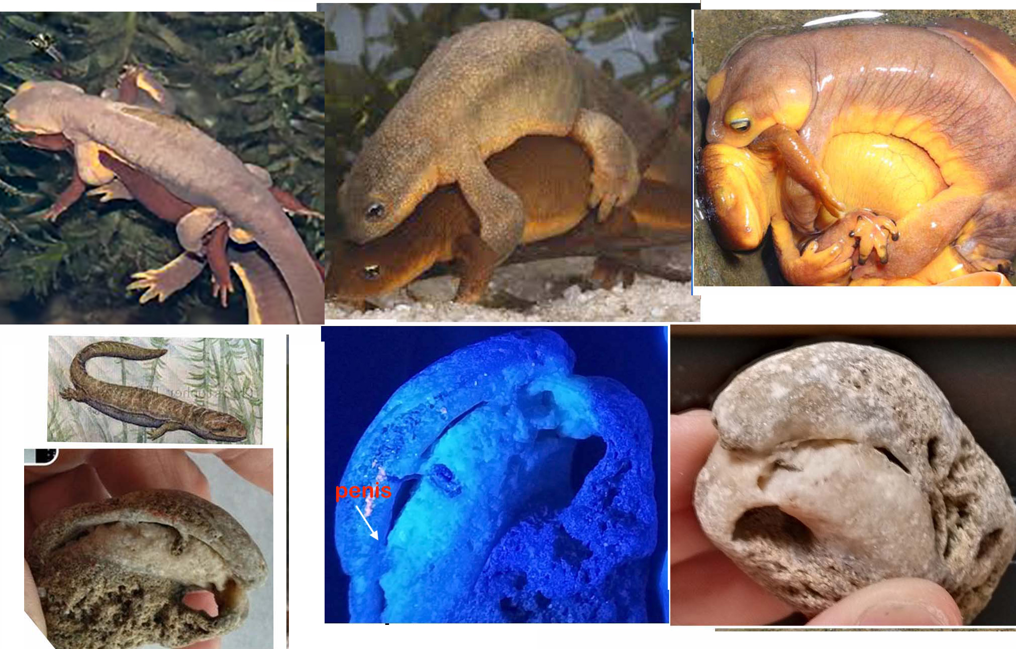 Hi, first of all, i would like to say that i have 45 years, and tens of thousands of hours, hands on experience collecting fossils, both parents were professional paleontologists,.i was literally born in the jungles of Guatemala as my parents were on a dig back in 1959 and got caught up by bad weather had to stay put until eventually my mom was in labor. i spent my whole childhood moving from one country to another living in one makeshift tent after another, never having a solid roof over my head as my parents were always on one excavation after another. I spoke 7 languages by the time i was 9, including Chinese along with numerous dialects....i have been collecting fossils since i was old enough to dig and sift through dirt. finally spending 19 semesters at Berkeley studying earth science. with a major, and undergraduate in geology, and a graduate in paleontology and dendrology. you started your reply with the words, "its extremely rare, if not unheard of" while i understand your skepticism, let me point out a few corrections, the composite mineral in this is not quartzite, it is silica sand. you did exactly what i did when you first saw this, instantly putting it into pareidolia status. after which time, you refused to look closer at the piece. i happen to be very learned in salamanders, and have much experience with the ca newt mating ball act. which you most likely disregarded and did not take the time to actually examine and compare the images i attached for comparison. notice that Quartzite does not react with UV light neither does silica sand, unless there is high levels of carbon. carbon does not bind nor is it found included in either mineral naturally, its only found in these minerals when those minerals have filled in the decomposed empty space of what was once biological organic matter, its left behind during the fossilization process, if you'll notice that the piece is highly reactive to UV light (blue images) i urge you to to take a closer look at the images especially the one under UV light and look at the back foot, compare it with the newt in the image above it that is shown mounted on a female. do a little more research on how silica sand preserves soft tissue, its unlike any other type sand, or mineral, for that matter, so long as rapid burial takes place, and no decomposition has begun before burial, the soft tissue, even the skin will be preserved and filled in exactly as it was upon being byried, thats why i said, incredible fossil in my explanation when posted.