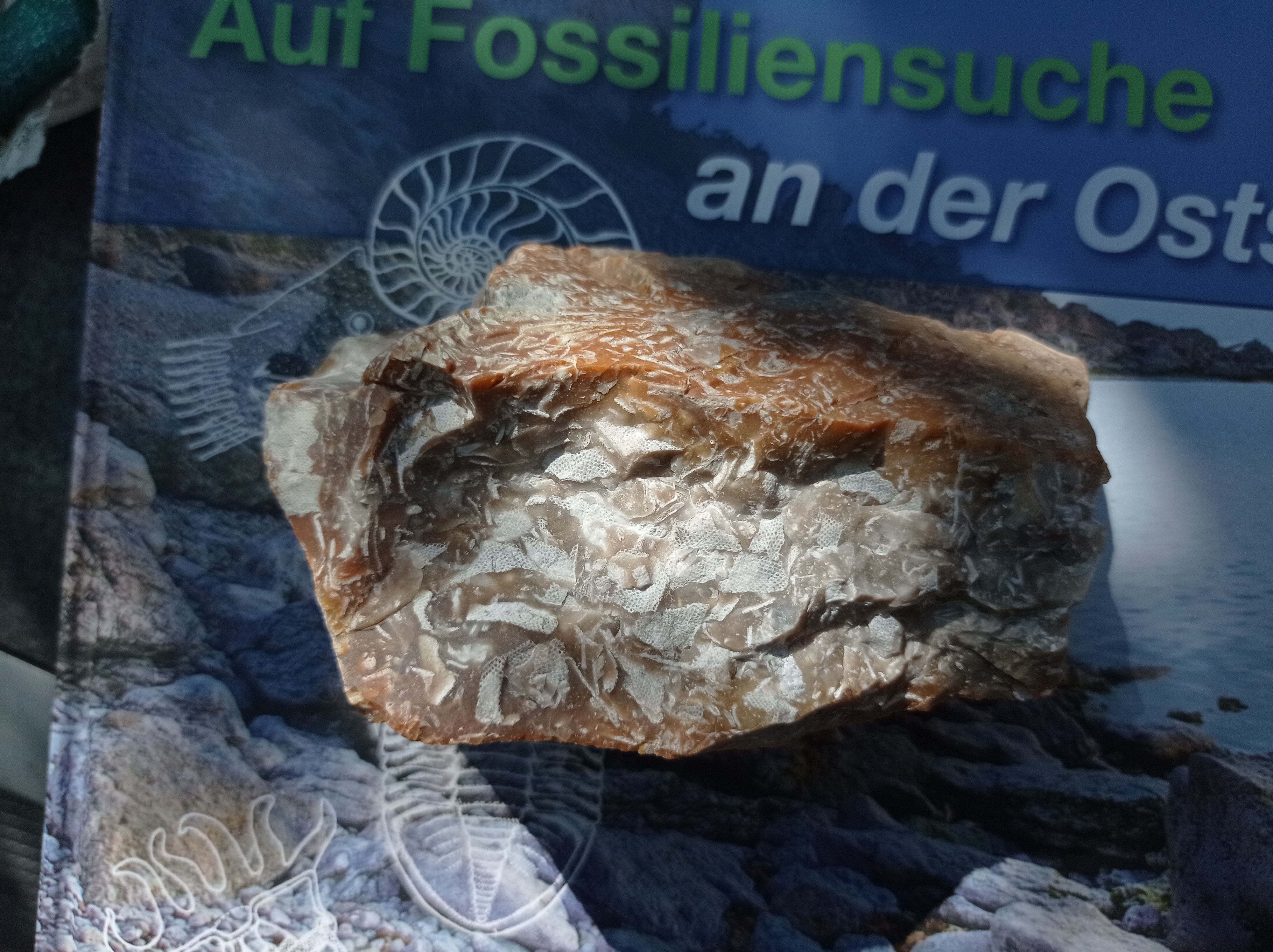 Nadat alle boekingen waren gedaan, besloten we om niet de eerste dag naar de eerste overtocht te racen, maar een dag eerder te vertrekken en een nacht te bivakkeren op de camping bij Katharinenhof op het schiereiland Fehmarn. Zo konden we de volgende morgen zonder file-leed meteen aansluiten in Puttgarden voor de veerboot naar Denemarken. De overgebleven beschikbare tijd gingen we het nabijgelegen strand op om te zoeken naar zwerfsteenfossielen. Met name zgn. ‘grünlichgraues Graptolithengestein’ had daarbij onze aandacht. Die vonden we ook wel, maar helaas lieten de graptolieten verstek gaan. Hier een exemplaar dat ik hier in 1991 heb gevonden: