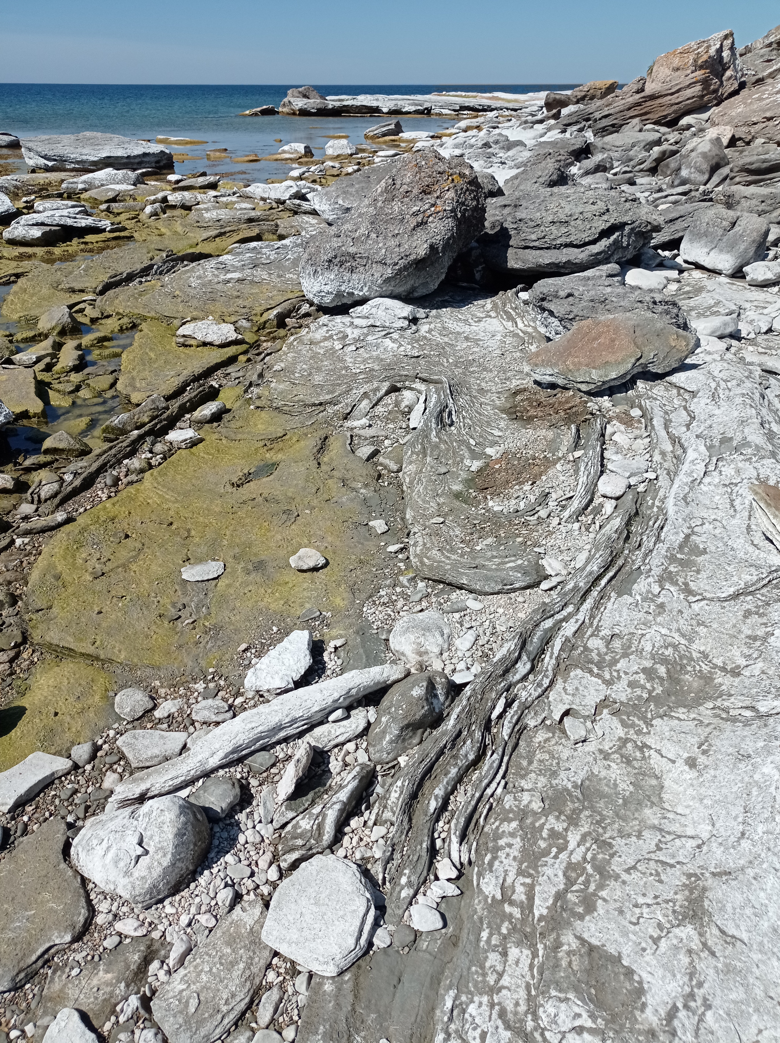 De zgn. Burgsvikformatie is één van de jongste afzettingen van Gotland, heeft een totale dikte van wel 50 meter en is alleen aan deze smalle kuststrook bij Kettelvik goed ontsloten. Mooi zijn hier de zandsteenlagen te zien; gelijkmatig afgezet onder rustige omstandigheden. Er zijn hier fossiele visresten, fossielen van kwallen en zeesterren en zelfs van (zeer vroege) landplanten gevonden (https://www.cbc.ca/news/science/oldest- ... -1.3474248), maar die waren voor ons niet weggelegd. Wel is het gelukt om in het losse materiaal van de iets jongere Burgsvik-ooliet de schelp Pteronitella te vinden en levenssporen, mogelijk van grondelende vissen en dat is toch ook leuk.