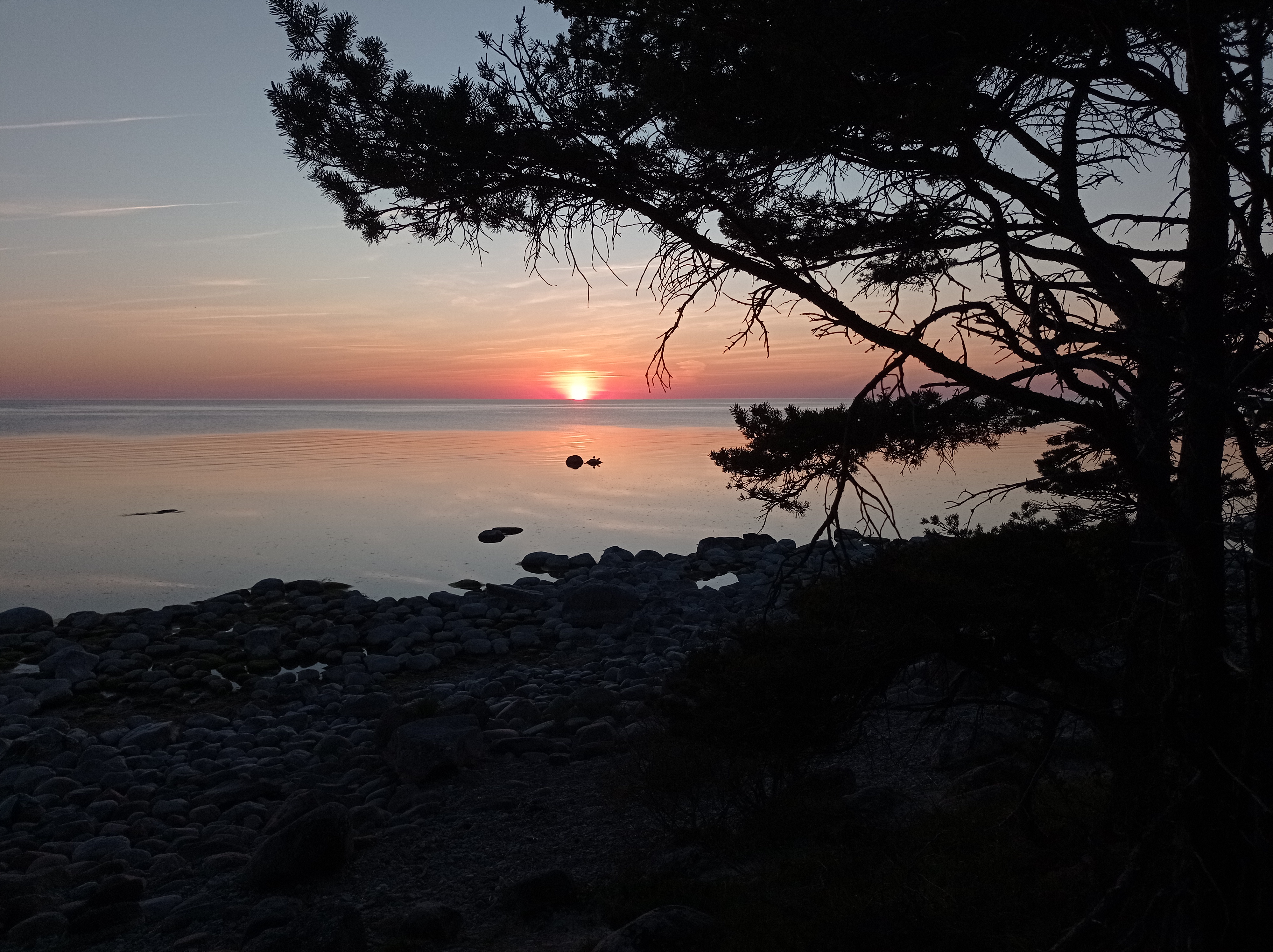 's Avonds na het eten nog even gewandeld aan het strand. Zomaar weer een aardige Ordovicische spons kunnen oprapen en daarna genoten van de zonsondergang. (Let op de rustige 'spiegelzee'!)