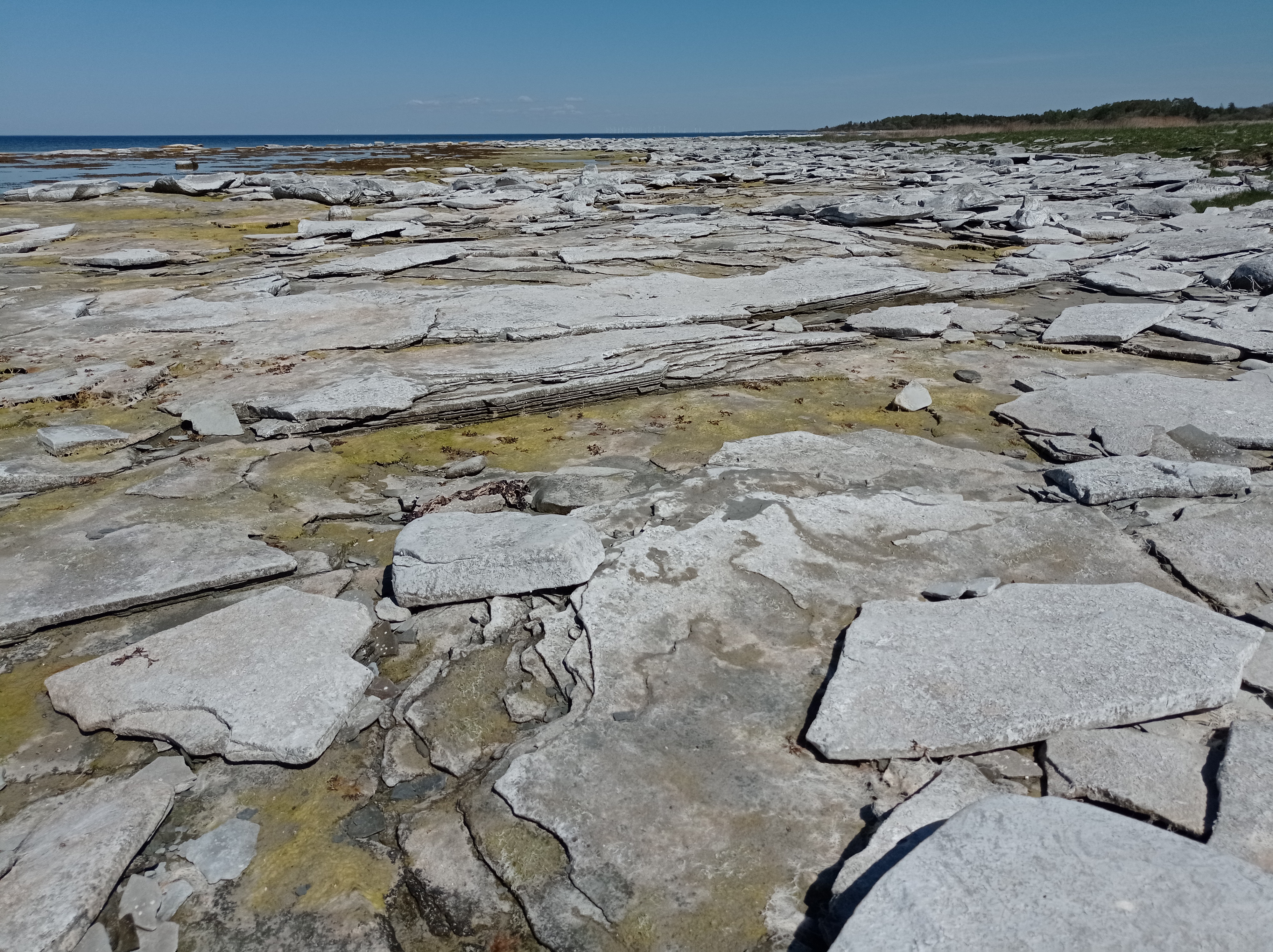 De zgn. Burgsvikformatie is één van de jongste afzettingen van Gotland, heeft een totale dikte van wel 50 meter en is alleen aan deze smalle kuststrook bij Kettelvik goed ontsloten. Mooi zijn hier de zandsteenlagen te zien; gelijkmatig afgezet onder rustige omstandigheden. Er zijn hier fossiele visresten, fossielen van kwallen en zeesterren en zelfs van (zeer vroege) landplanten gevonden (https://www.cbc.ca/news/science/oldest- ... -1.3474248), maar die waren voor ons niet weggelegd. Wel is het gelukt om in het losse materiaal van de iets jongere Burgsvik-ooliet de schelp Pteronitella te vinden en levenssporen, mogelijk van grondelende vissen en dat is toch ook leuk.