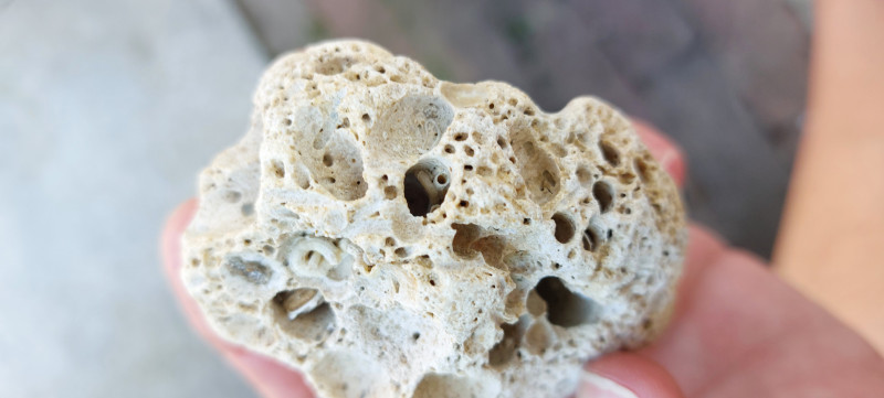 Er valt niet zo heel veel voor te stellen. Ik zoek niet hobbymatig of zo. Heel af en toe loop ik bij toeval tegen iets leuks aan omdat mijn blik er dan op valt. Vorig jaar een heel mooi stuk versteend hout gevonden bij het Drielanden punt. Daar ben ik hier goed mee geholpen. En nu deze, waarvan ik via Google niet kon uitvinden of het oud koraal was of gewoon steen. Kans is groot dat ik volgend jaar weer mijn inloggegevens niet meer weet