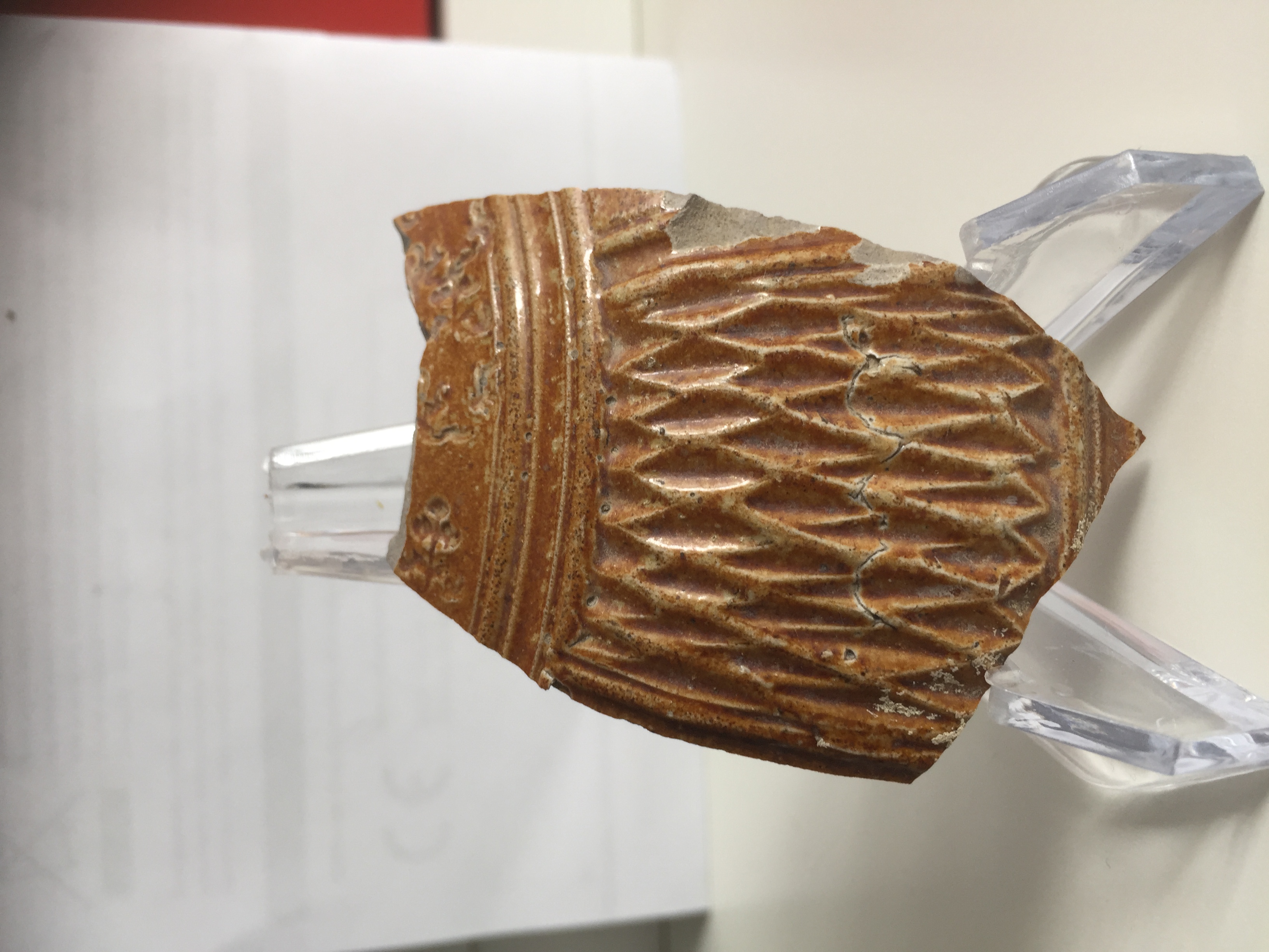 Zulk soort fragmentjes zijn natuurlijk lastig te determineren, maar even online kijkend lijkt het wel ietswat op aardewerk uit Raeren (16e eeuw), maar het kan ook goed iets anders zijn, het is namelijk een klein fragment en ik ben verre van expert.