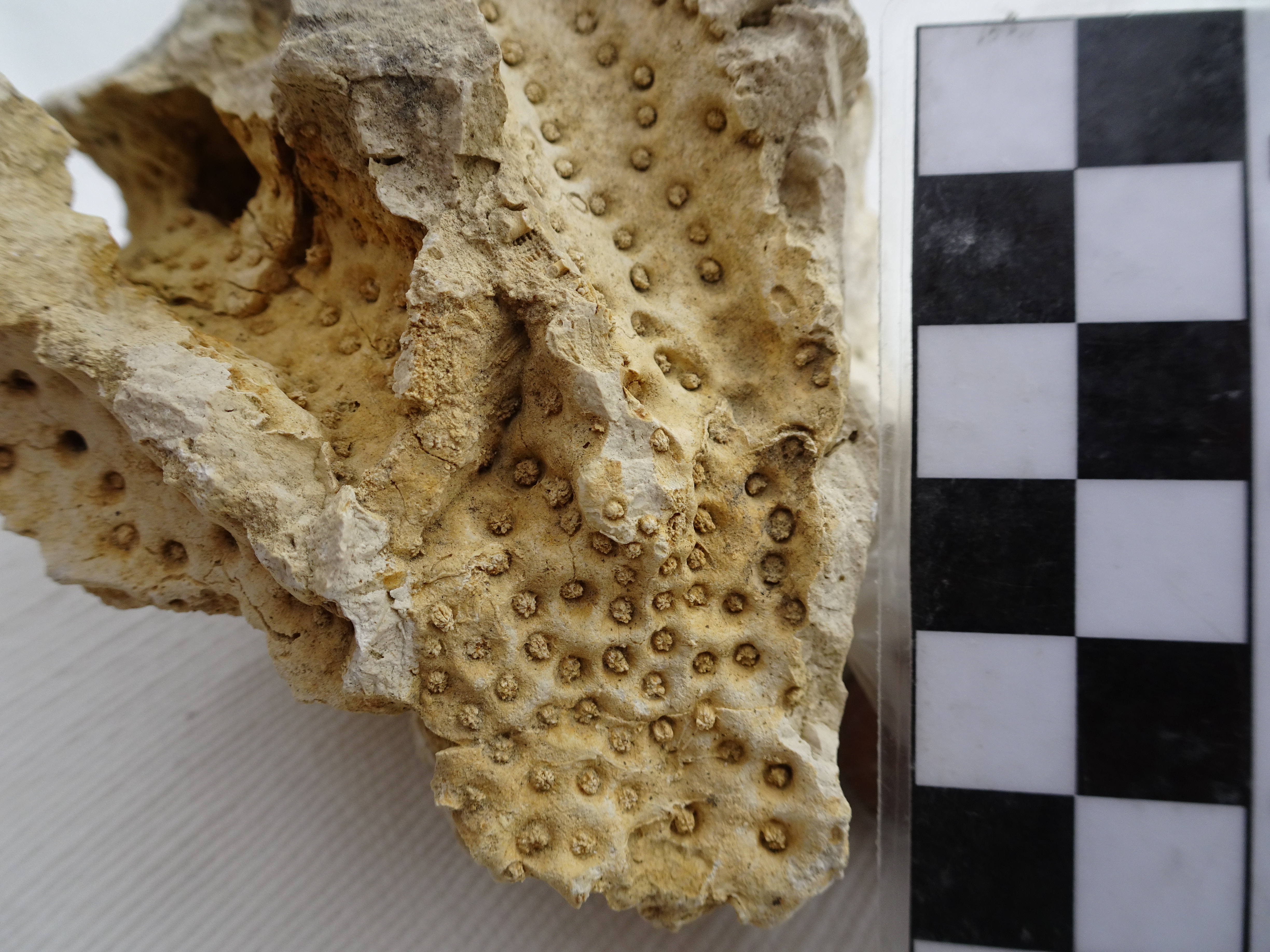 Een paar weken geleden heb ik bijgaand brok kalksteen gevonden in noord-Frankrijk aan de rand van de Maasvallei tussen Verdun en Stenay, tegenover het dorpje Sivry-sur-Meuse. De geologische kaart geeft voor dit gebied boven-Jura aan. Het blok(je) is doorsneden door gangen met kleine koraalkelkjes van ca 2 mm. Ik neem aan dat de oorspronkelijke koraalmassa op enig moment is opgelost, en dit dus een afdruk is van een dendroïde koraalkolonie. Ik dacht dat deze (enigszins afwijkende) koraal wel makkelijk te vinden zou zijn in algemene literatuur en/of op internet, maar dat viel wat tegen. Ik kom uit bij het geslacht Enallhelia, maar daar houdt het een beetje op, en ik kan ook geen echt goed gelijkende afbeelding vinden. Zit ik op de goede weg, en kan iemand mij meer uitsluitsel geven over dit fossiel ?