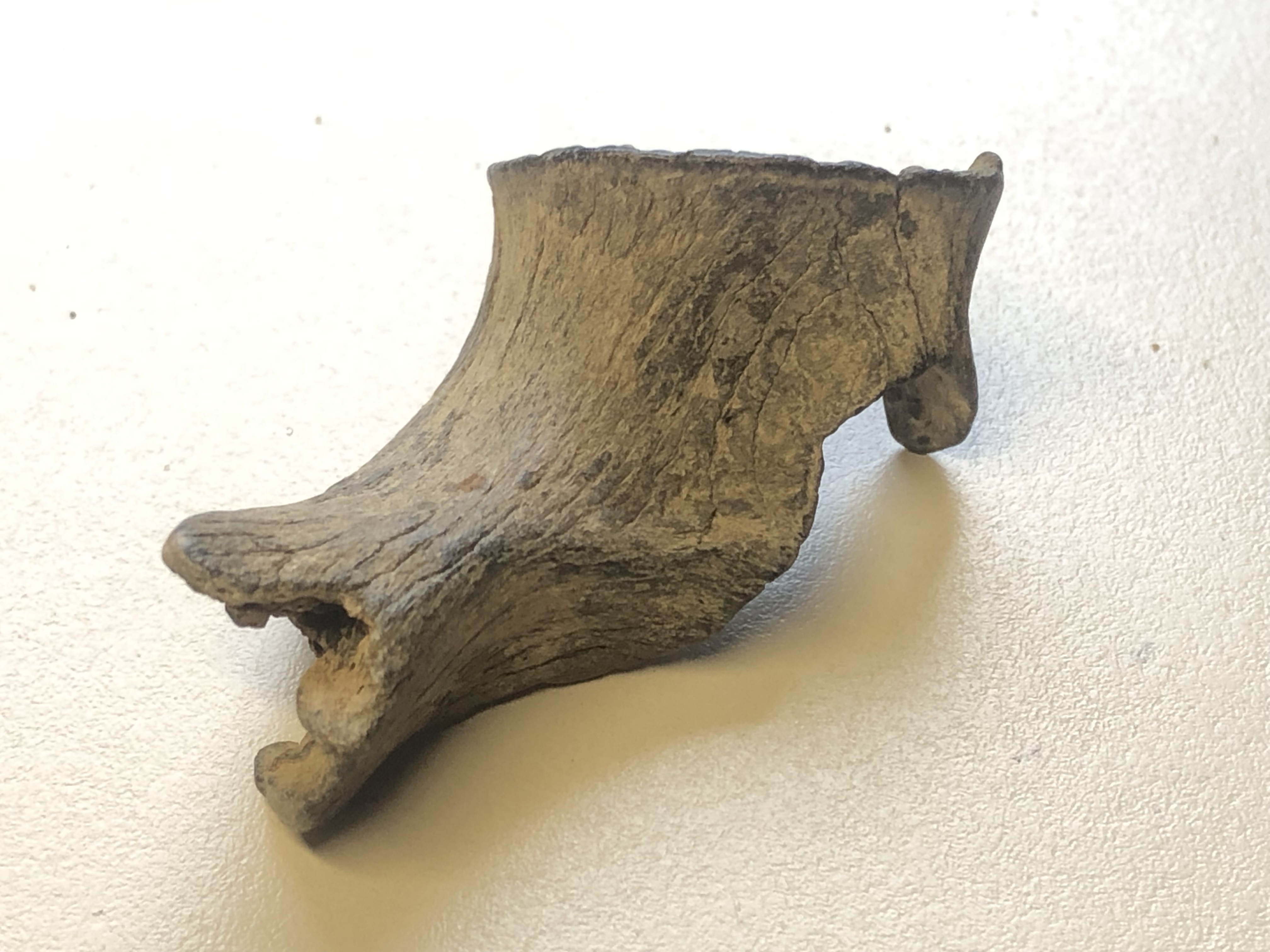 stukje gewei? Het stukje waar de ronding zit die wat zwart van kleur is zou dan de aanhechting kunnen zijn op de schedel.