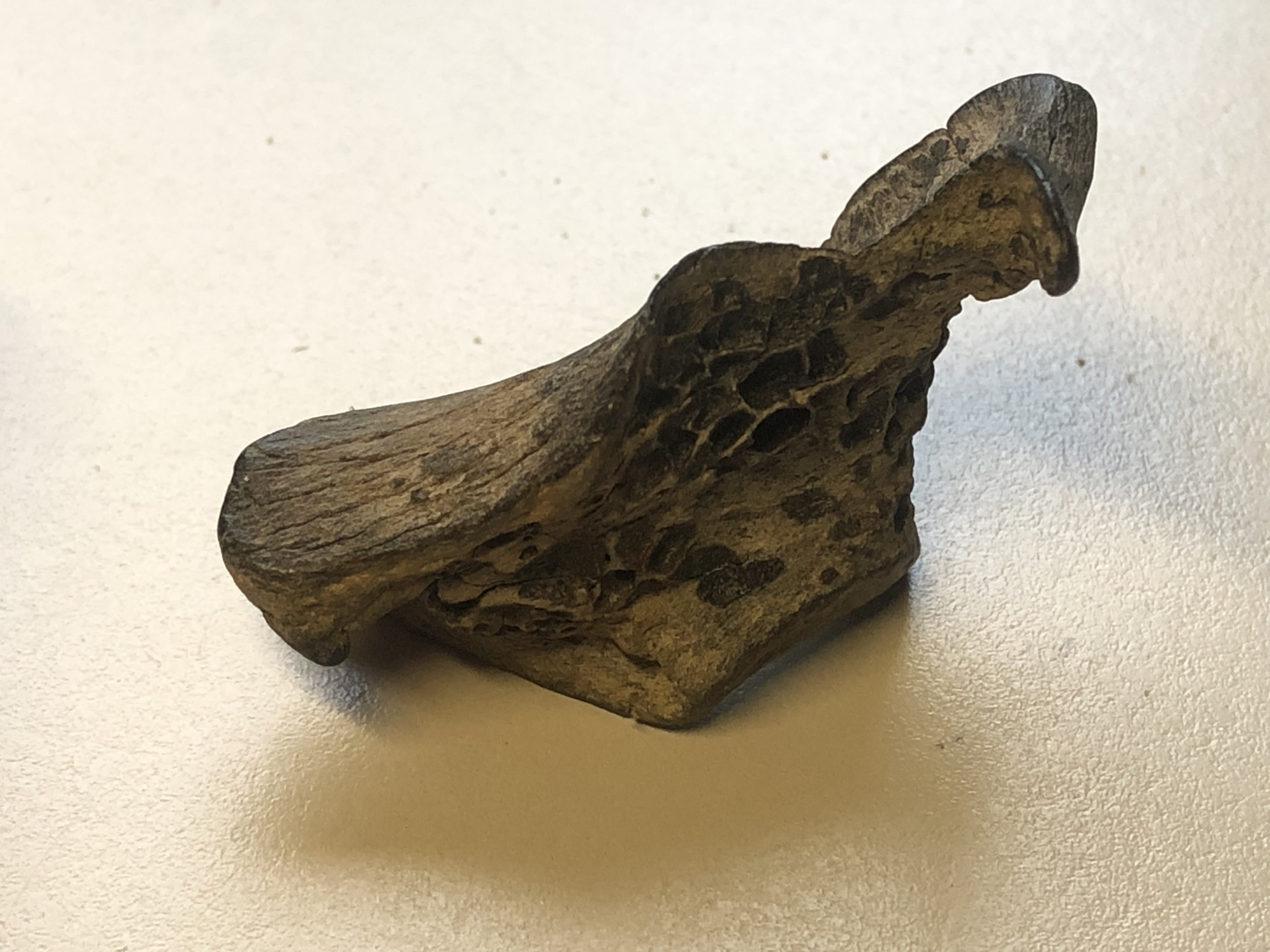 De luchtkamers in dit stuk doen eerder aan een bot denken. Gezien de vorm kun je denken aan een fragment van een bekken. Een stuk dat je naast een referentiecollectie moet houden.
