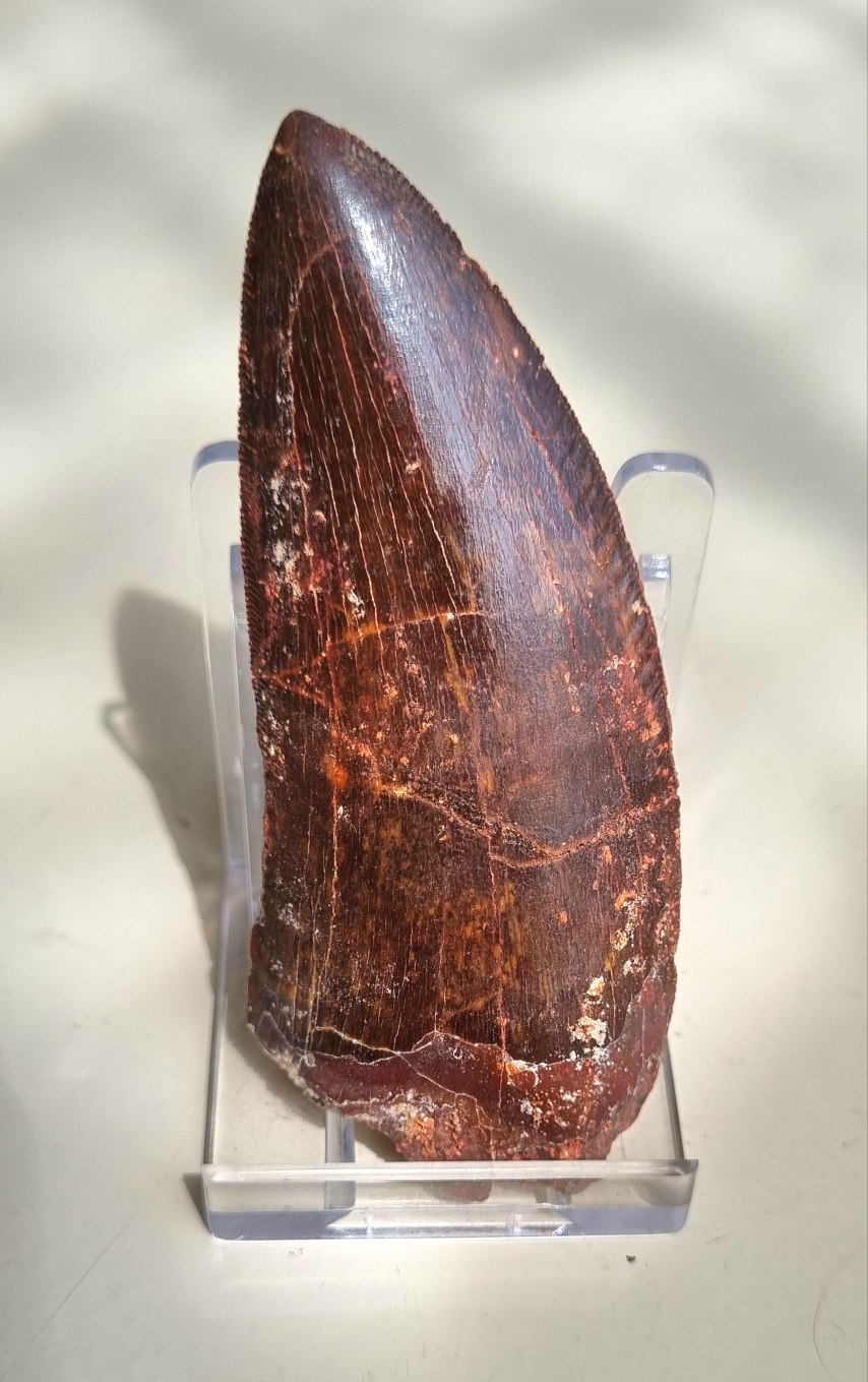 Spectaculair rood gekleurde 9cm grote Carcharodontosaurus saharicus tand uit de Kem Kem van Marokko. Bijzonder goed behouden karteling. €550 VERKOCHT