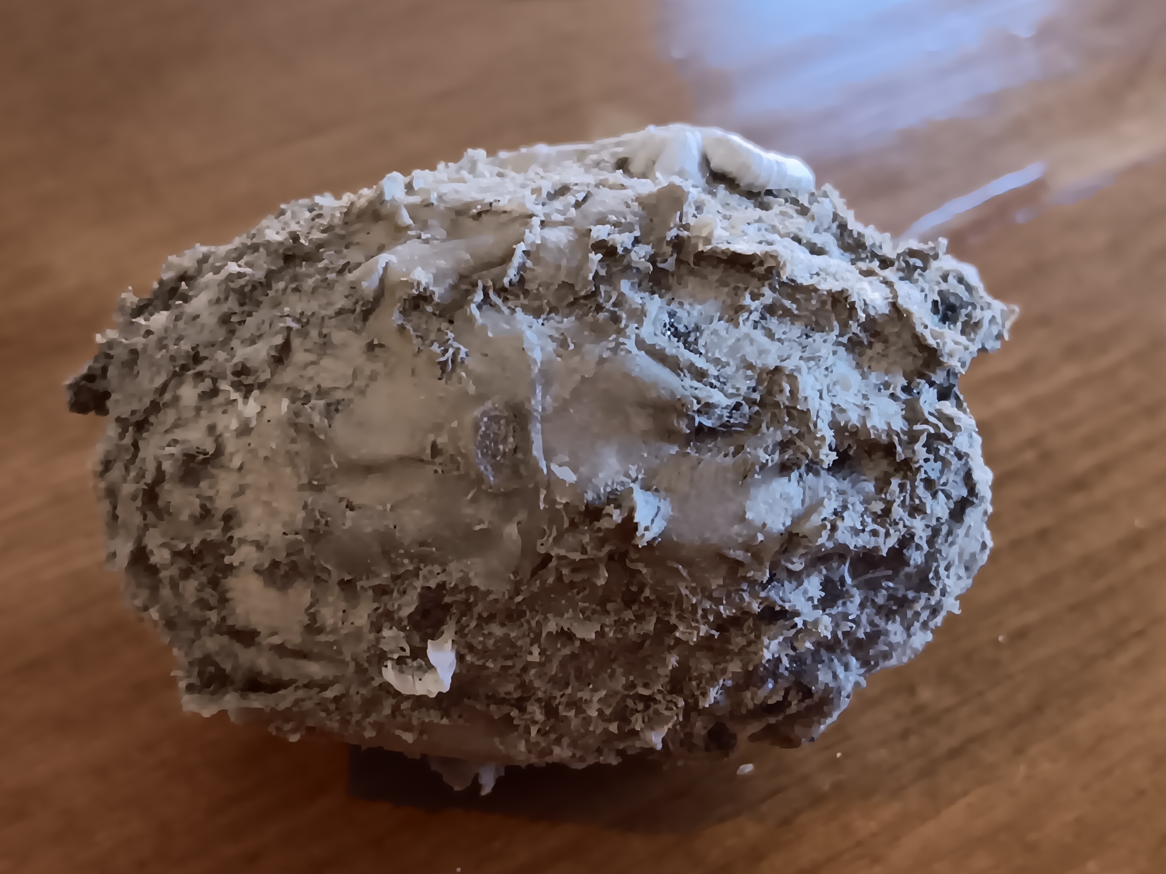 Ik heb het ding nog iets beter bekeken, met een loepje, en onder de begroeiingslaag zie ik een witte, wat vetachtige substantielaag. Zou dit een eivorm van paraffine zijn dat flink is begroeid?