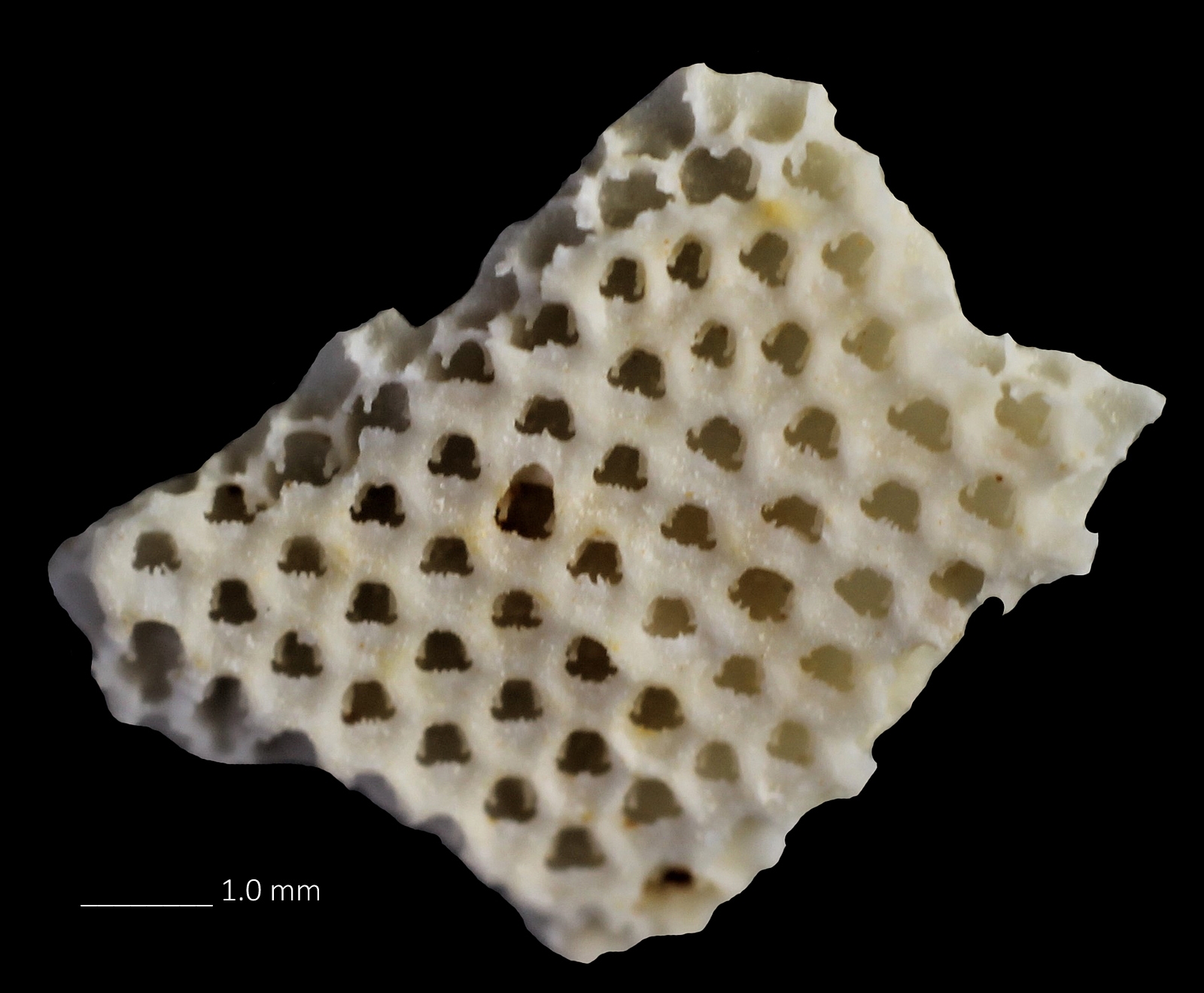 De eerste afbeelding van mijn specimen laat de frontale zijde van de kolonie zien en dan zie je de doosachtige structuren waarin de mosdiertjes leefden.