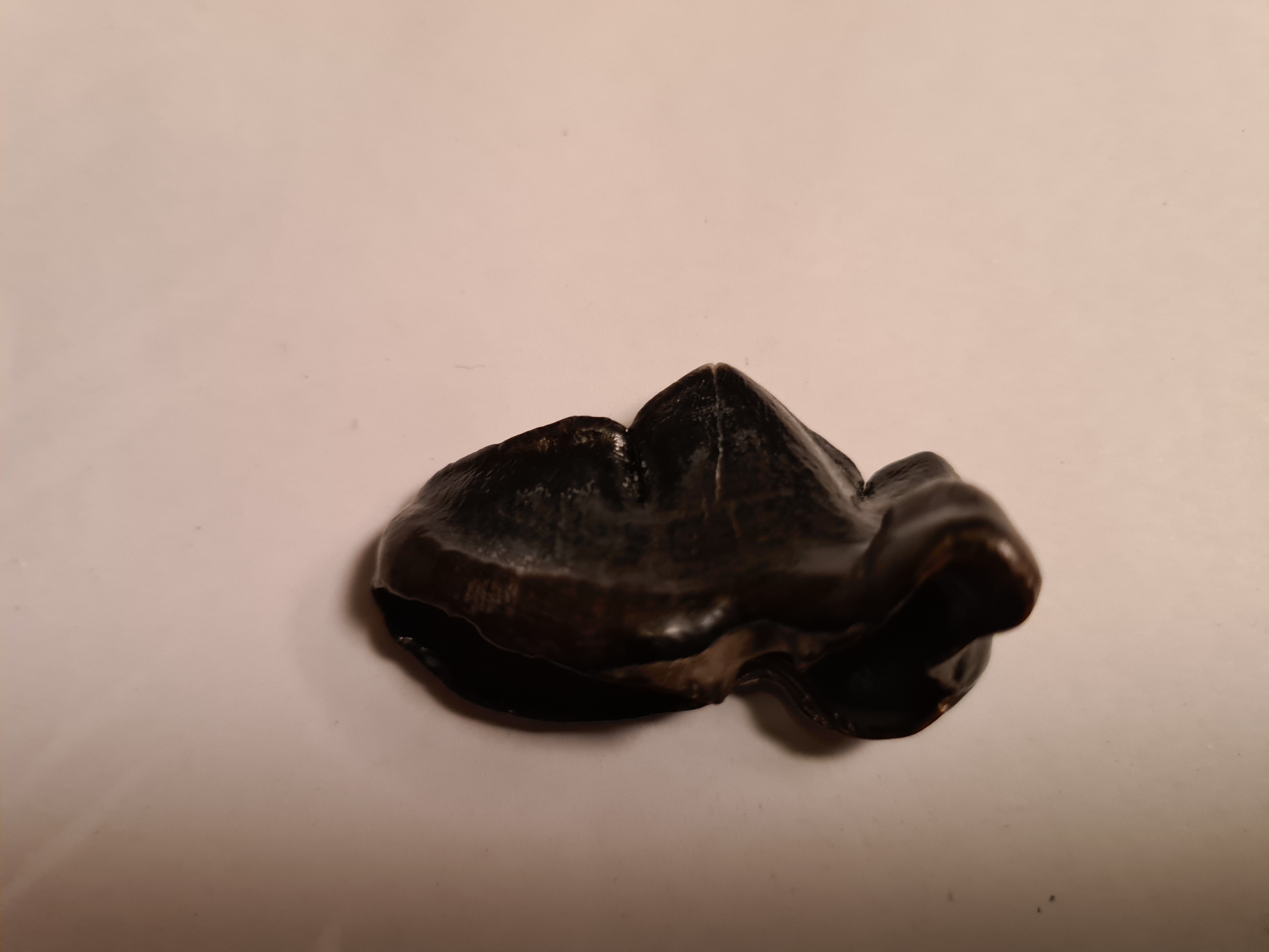 Mooie vondst! De vorm doet me aan iets hondachtigs denken. En hoewel eer ook in Scheveningen jaarlijks tal van honden verdrinken, doet de kleur me vermoeden dat dit toch een wat ouder exemplaar is. Dat zou dan uit de Romeinse tijd kunnen zijn, maar ik vermoed dat dit wel degelijk een fossiel is.