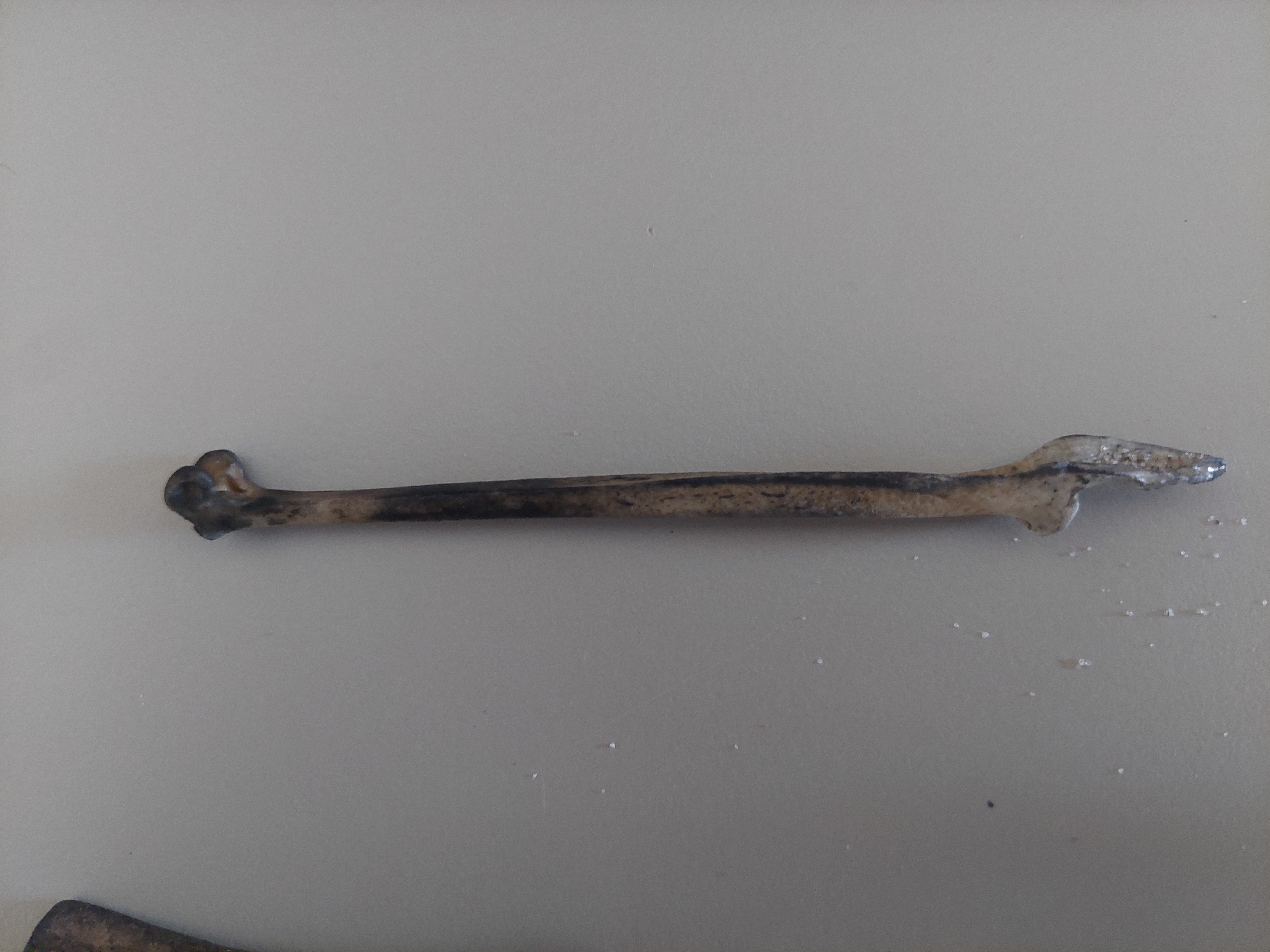 Ik denk dat dit een dolfijnwervel is: kun je me helpen de soort en de periode te identificeren? Deze lijkt mij een vogel tibiotarsus: is het een fossiel? Zou ik van Podilymbus podiceps kunnen zijn? Is dit een fossiel? Dit lijkt op een stuk rib: is dat zo? Van welk dier? Dit is duidelijk een bot: maar welke? en van welk dier?