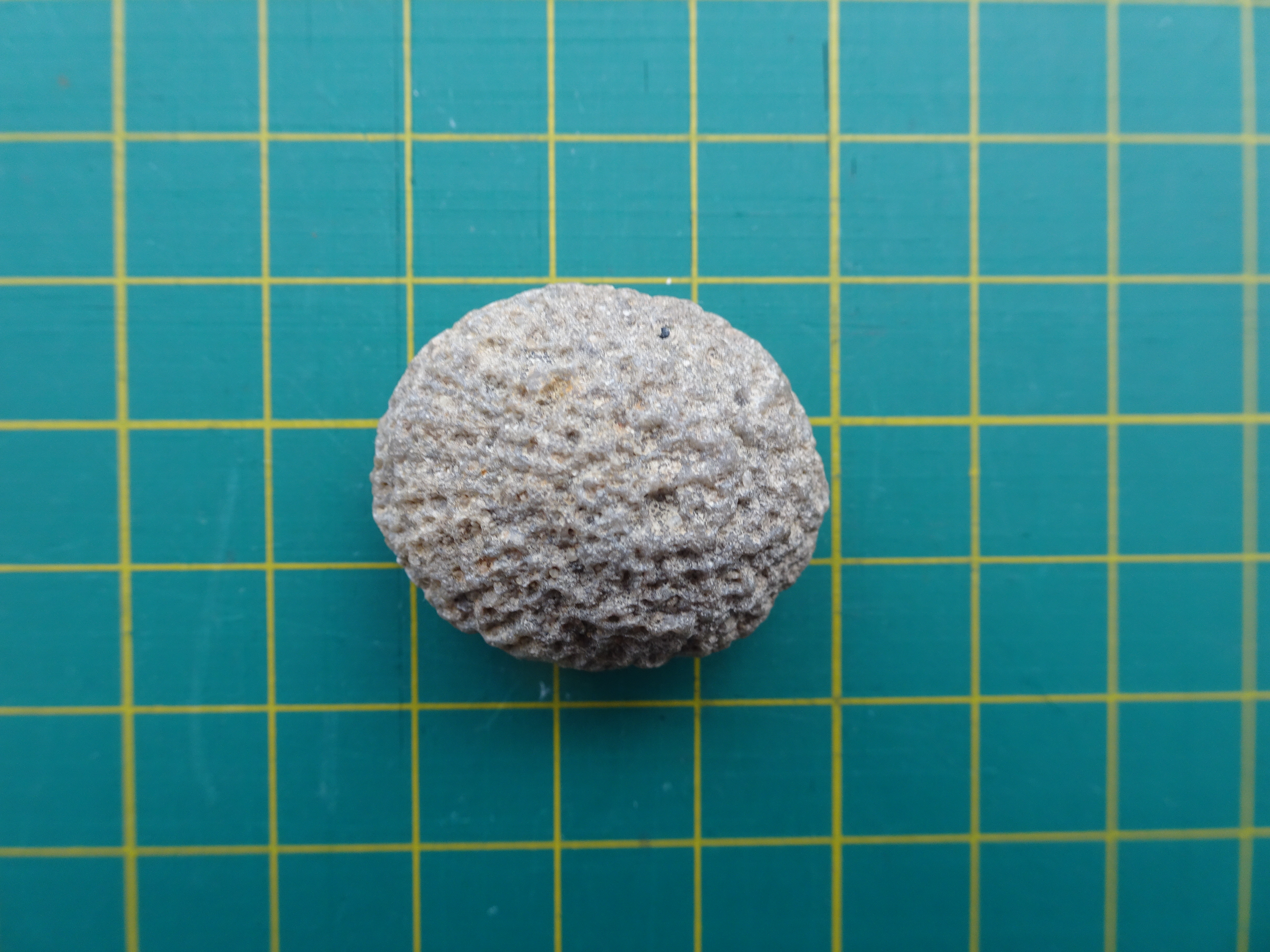 Een klein sponsje, dat ik onlangs vond toen ik (tegen beter weten in) nog even ging kijken bij een al jaren niet meer in gebruik zijnde zandgroeve in het WWW-gebied (= Noordoost Twente en aangrenzend Duitsland). Hij ziet er nog vrij gaaf uit, maar hij is wel flink verkiezeld. Hij doet in de verte een beetje denken aan een van pool tot pool scheefgedrukte Caryospongia juglans maar met een kleine inzinking aan de ene pool. Maar dat is misschien een beetje erg speculatief. Afmetingen 29 x 23 x 15 mm (lxbxh)
