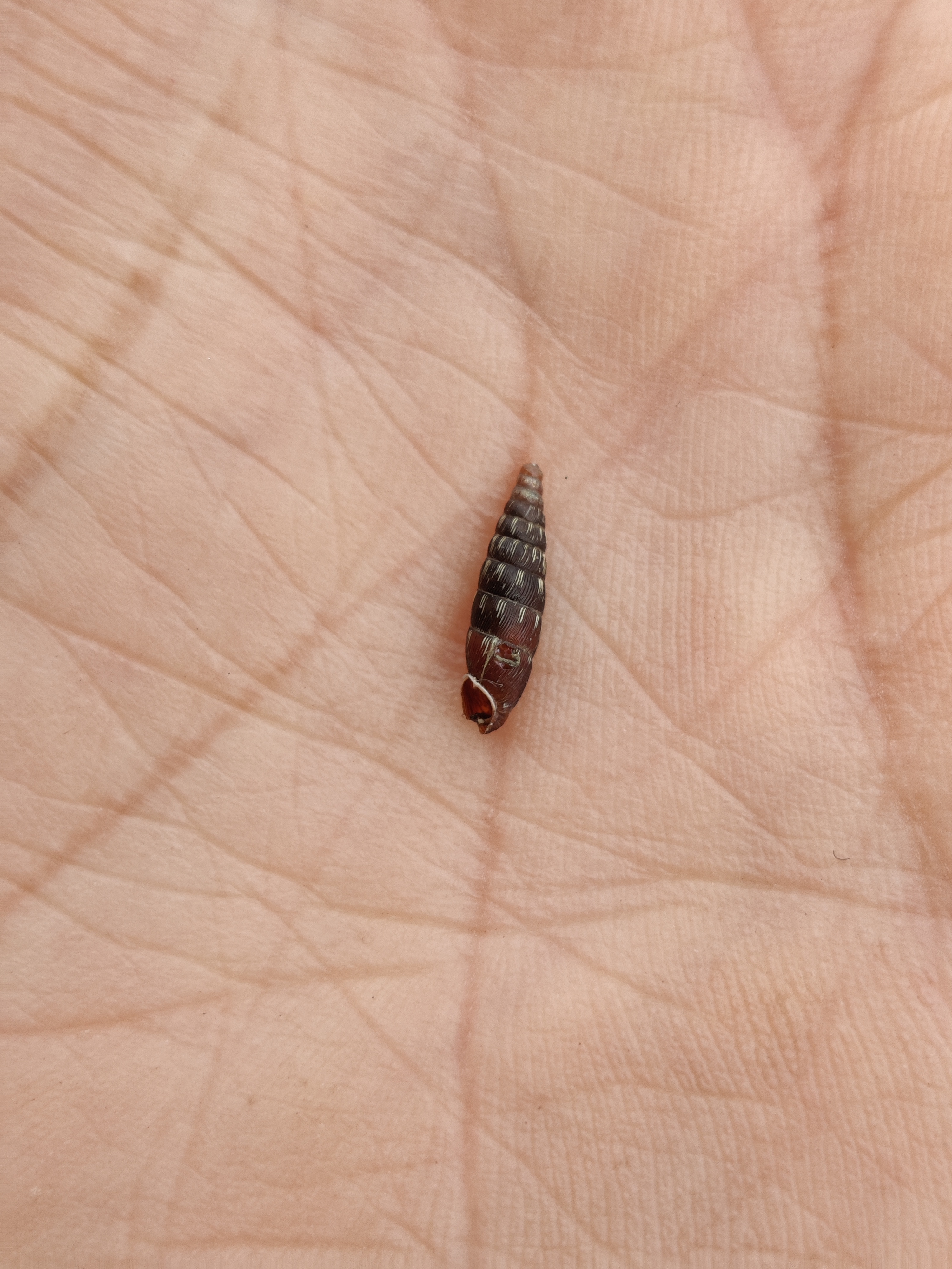 Wat het schelpje betreft: dat is inderdaad best recent, sowieso uit de familie Clausiliidae. Jammer dat de mondopening niet heel is, dat had de determinatie iets makkelijker gemaakt. Weet je nog ongeveer hoe lang het schelpje was? Ongeveer 10 mm of groter richting de 15 - 20 mm?