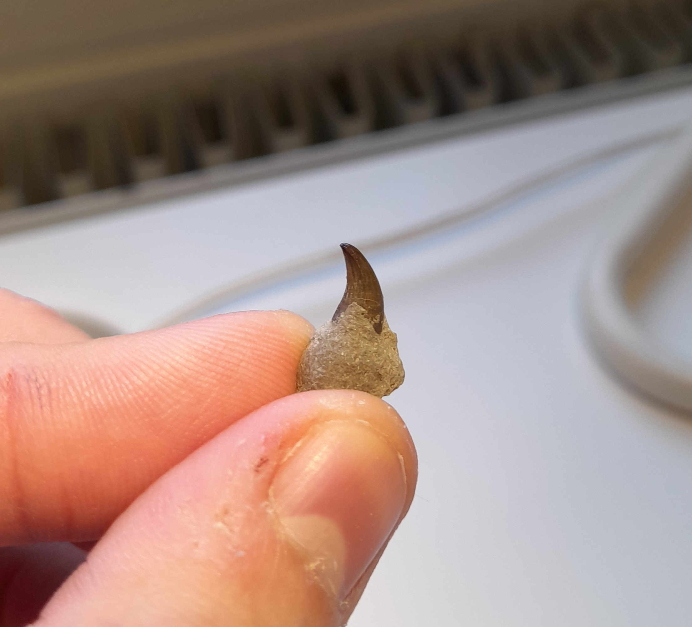 Een mogelijke Dolichorhynchops plesiosauriër tand gevonden in de Smoky Hill Chalk, Niobrara formatie, Kansas, USA - Krijt, Campaniaan, 86 - 80 mya
