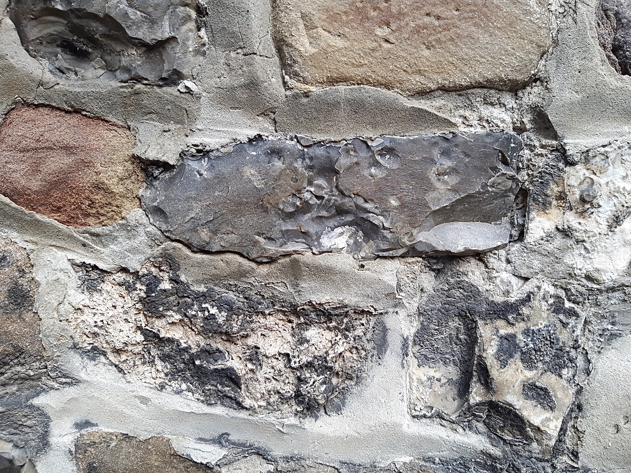 Muur bestaande uit verschillende gesteentes, hier een vuursteen ertussen.