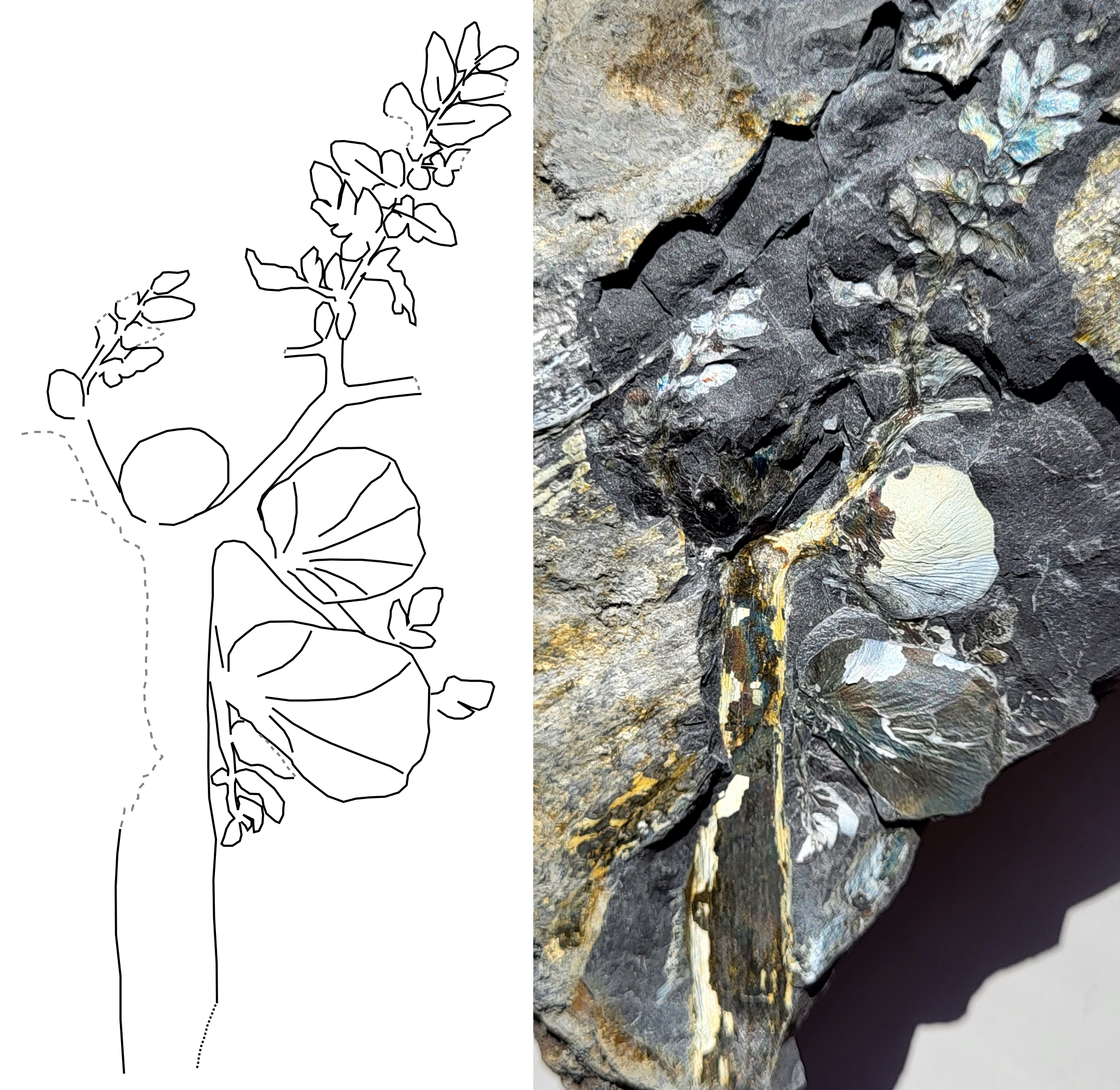 Die laatste drie heb ik hier nog niet eerder op het forum getoond, geloof ik. Eerst een foto van het "miniblad": De beeldbreedte is slechts 9 cm, maar toch kun je in dit fossiel een vrijwel compleet composietblad herkennen, inclusief basale dichotomie en meerdere Cyclopteris-blaadjes (zie interpretatieschetsje). Mogelijk zit meer van het blad nog verstopt onder het gesteente links, maar ik heb de moed nog niet verzameld om dit verder te prepareren. Misschien in 2025?...