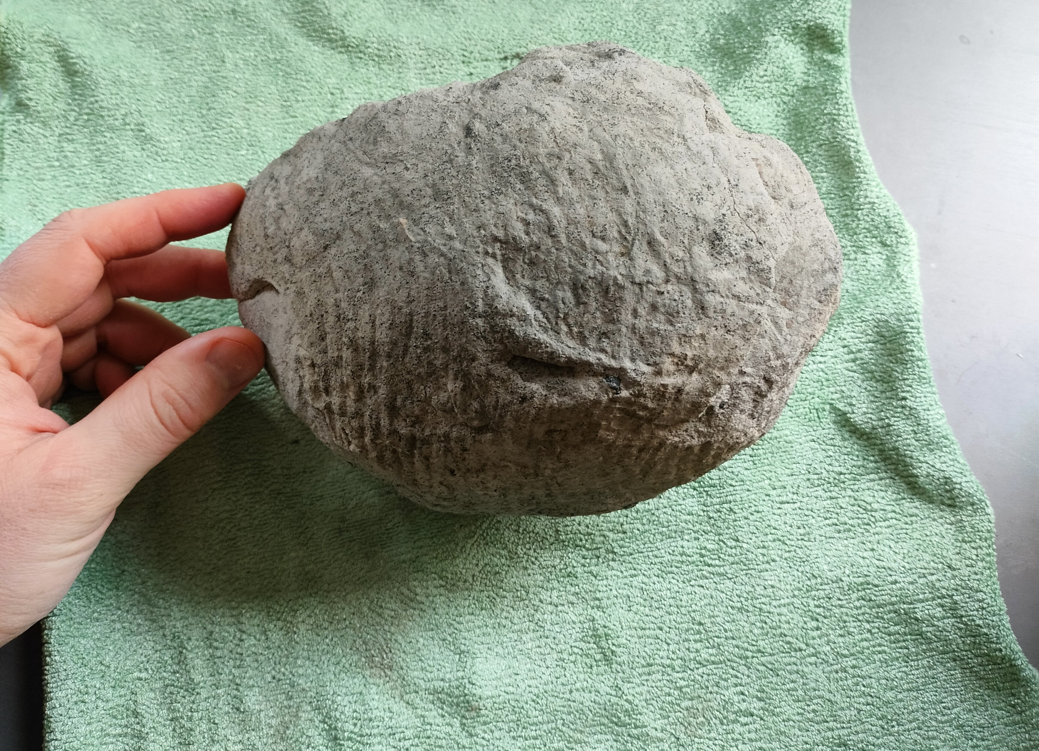 Ik vond onlangs deze bolvormige schelp aan de Cap Blanc Nez, ter hoogte van Strouanne. De golvende ribbels doen mij denken aan een nautiloide, zoals bijvoorbeeld Cymatoceras. Zou dat kunnen kloppen?