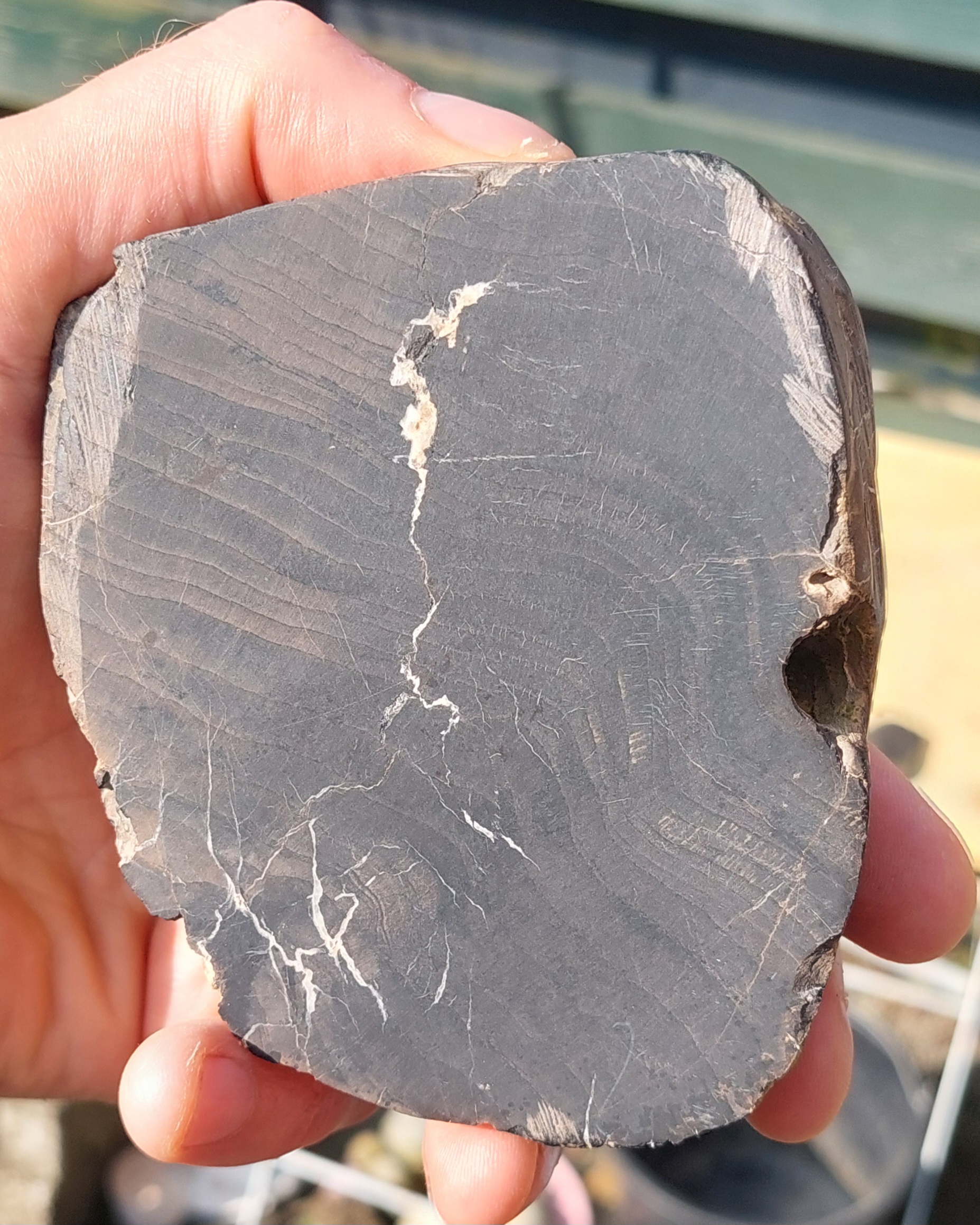 Ik ben ook wat aan het slijpen en polijsten geslagen. Een stuk hout uit het Kimmeridgien van Schotland. Ik denk een soort conifeer. Helaas geen hele mooie kleuren, maar de groeiringen en de met calciet gevulde barsten zijn goed zichtbaar.