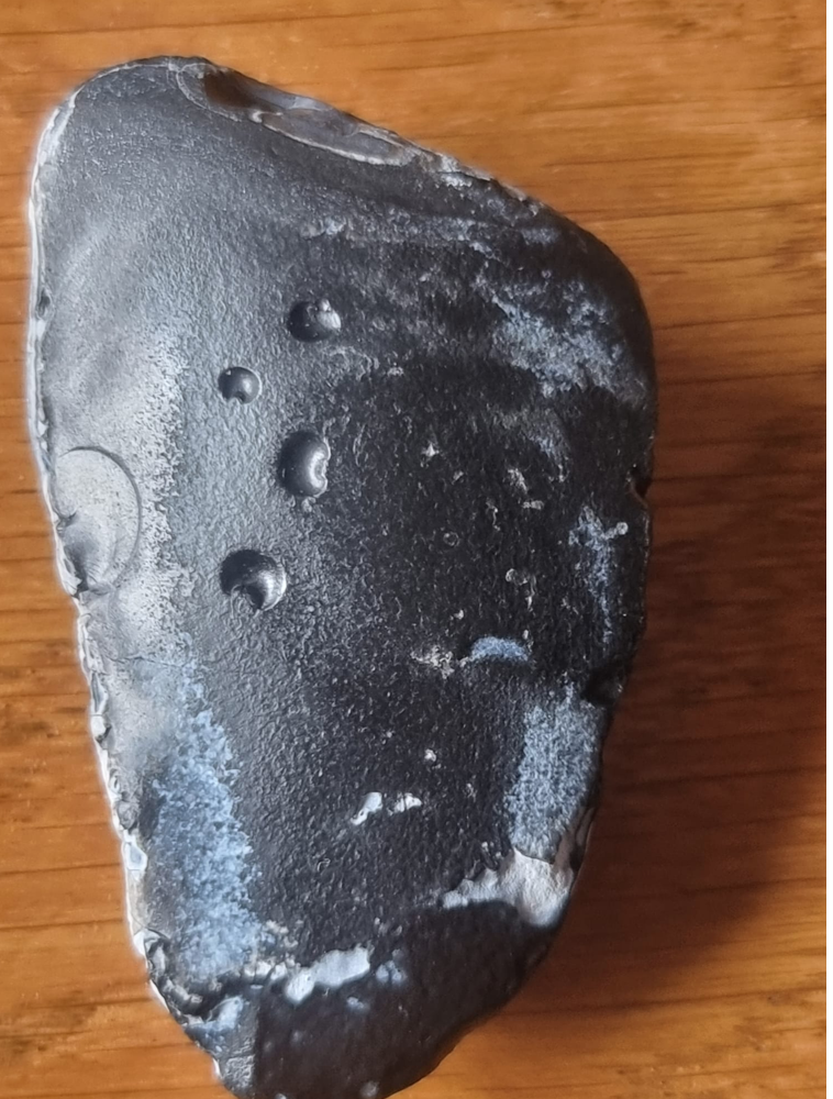 Dit is een stuk vuursteen, waar in het verleden ook wel werktuigen van gemaakt zijn. Ik zie hierop echter geen sporen van bewerking, al kan zo'n stuk wel snel die indruk geven. Dat komt echter doordat als zo'n stuk vuursteen in de branding rolt, het op andere harde objecten kan stuiten, die, in feite, hetzelfde doen als wat een vuursteensmid zou doen, namelijk er stukken afslaan. Alleen omdat de natuur dit veel minder systematisch doet kun je het verschil alsnog herkennen. Zo ook hier... Desondanks nog steeds een leuke vondst!