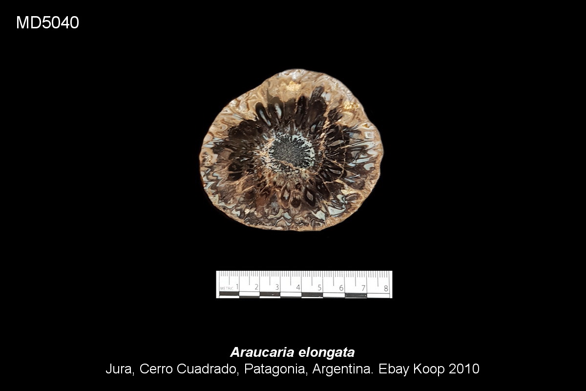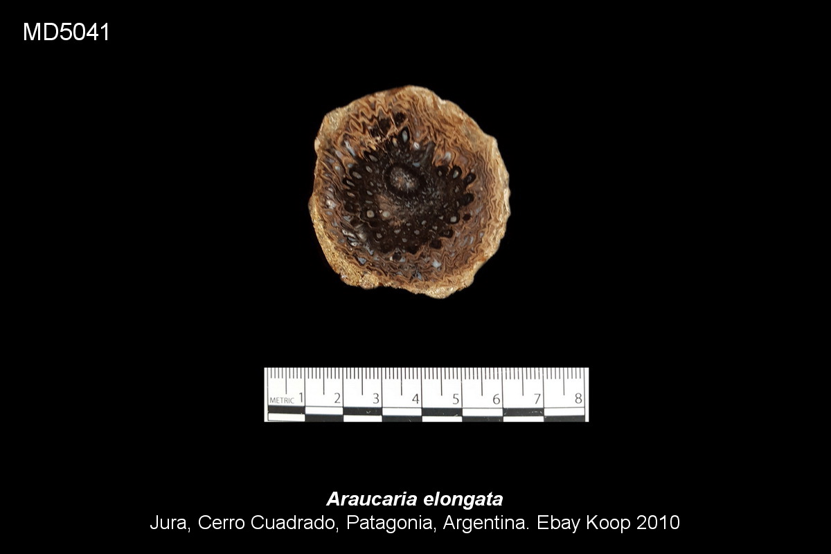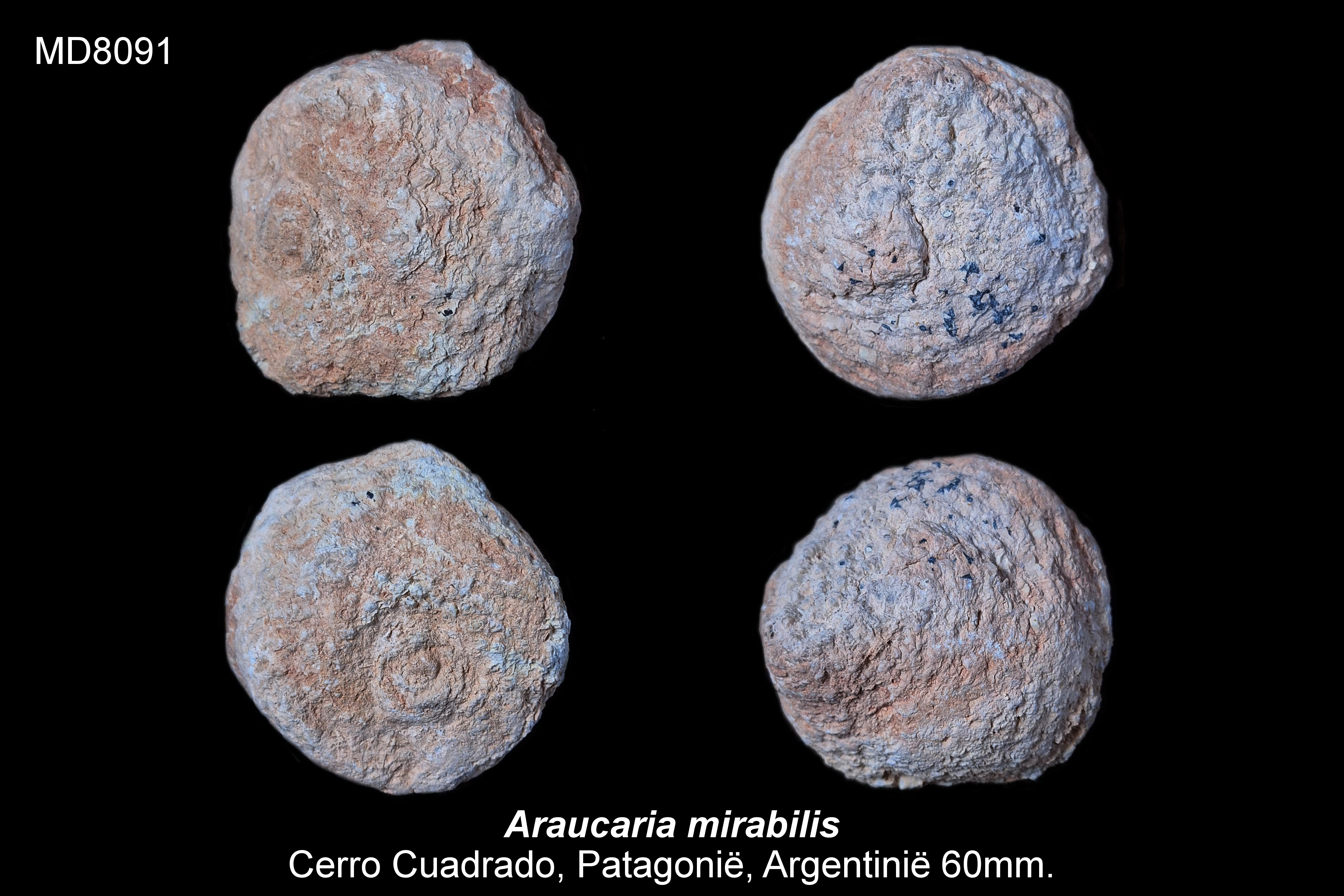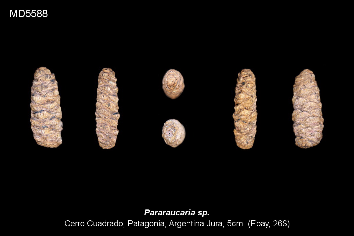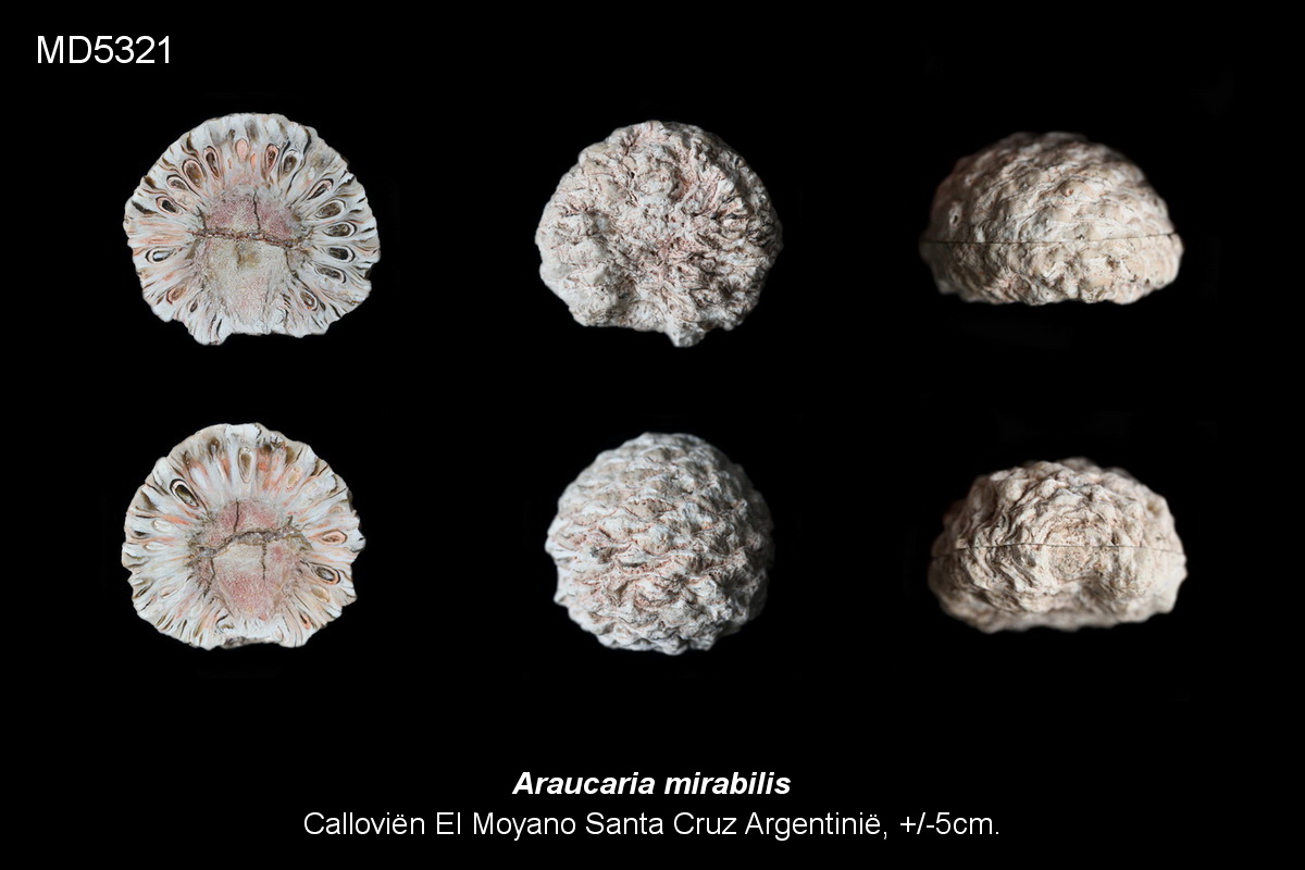 Hierbij mijn bescheiden bijdrage, met een schijf versteend hout, een juveniele kegel op steel, en een doorgezaagde volwassen kegel van Araucaria mirabilis (Spegazzini) Calder 1953, afkomstig uit het midden Jura van de La Matilde Formatie (Bahía Laura Groep) van de Santa Cruz provincie in Patagonië, Argentinië.