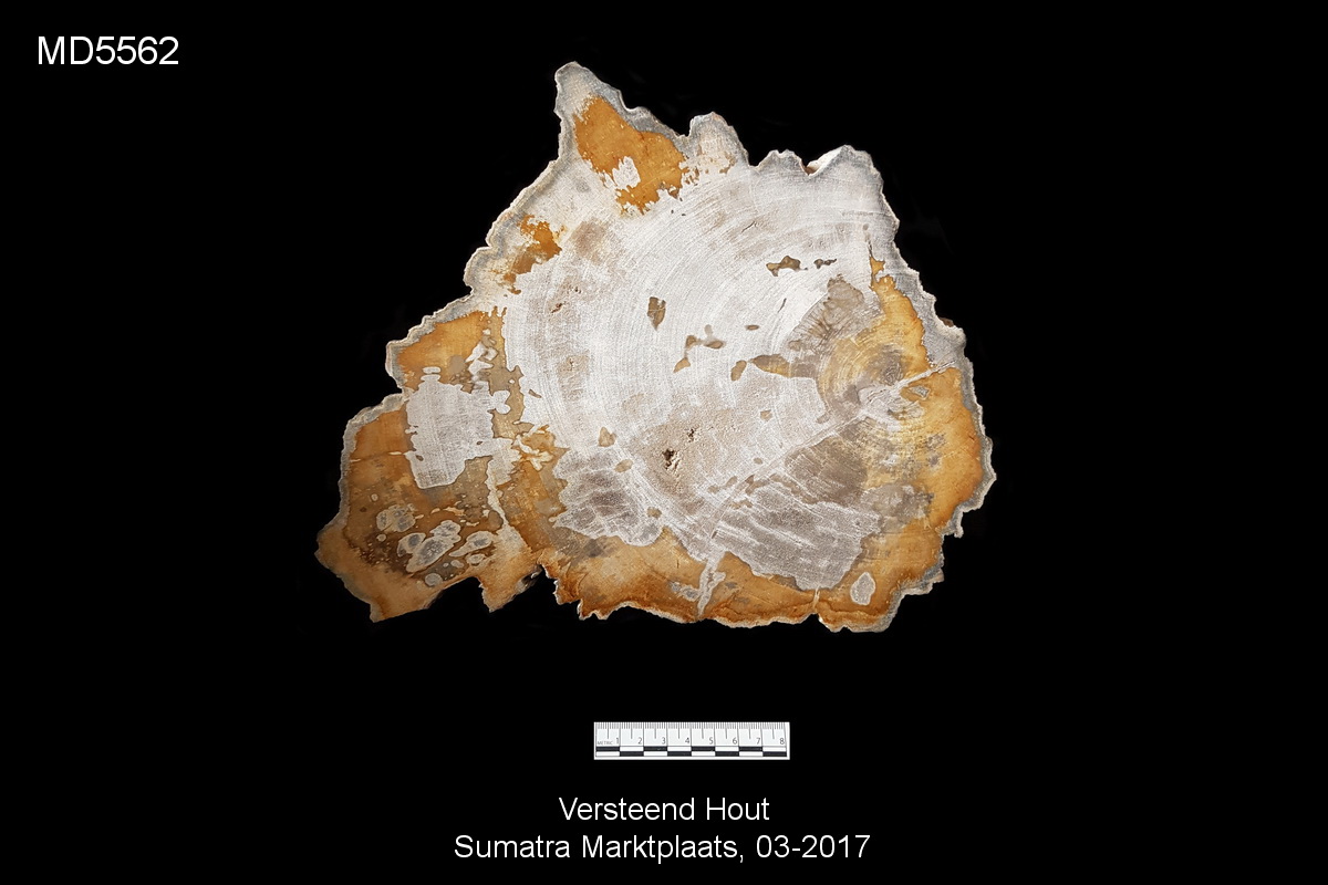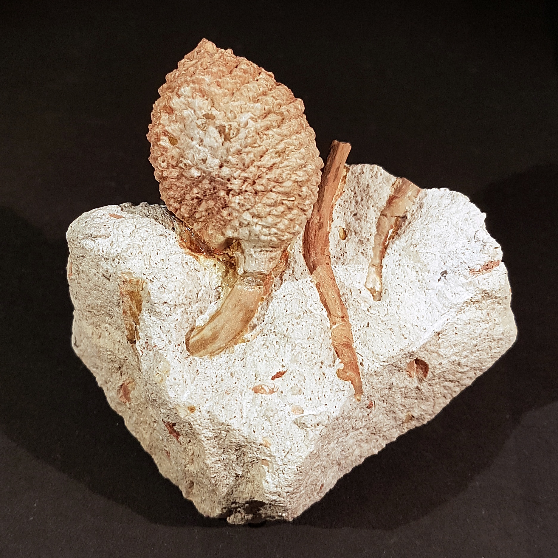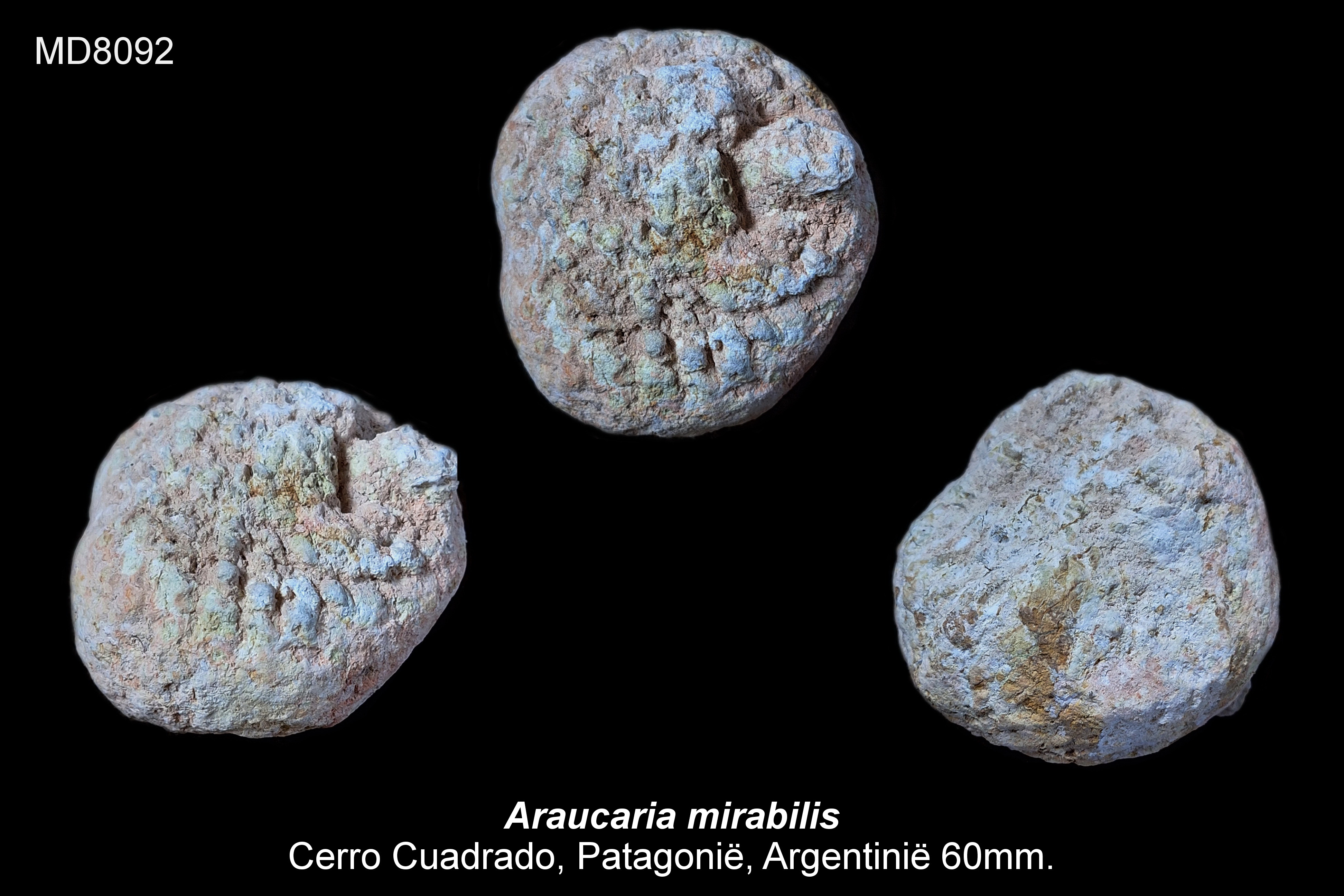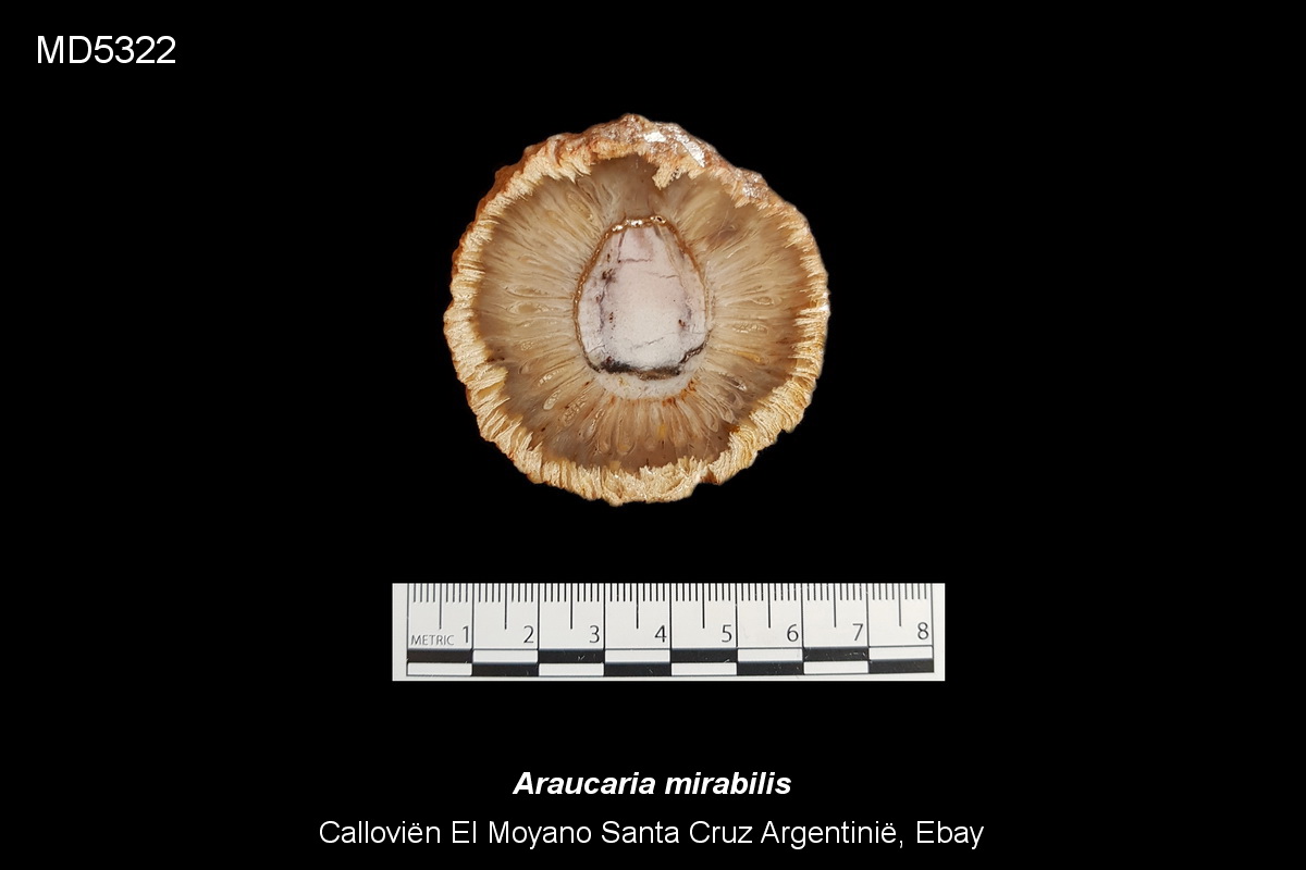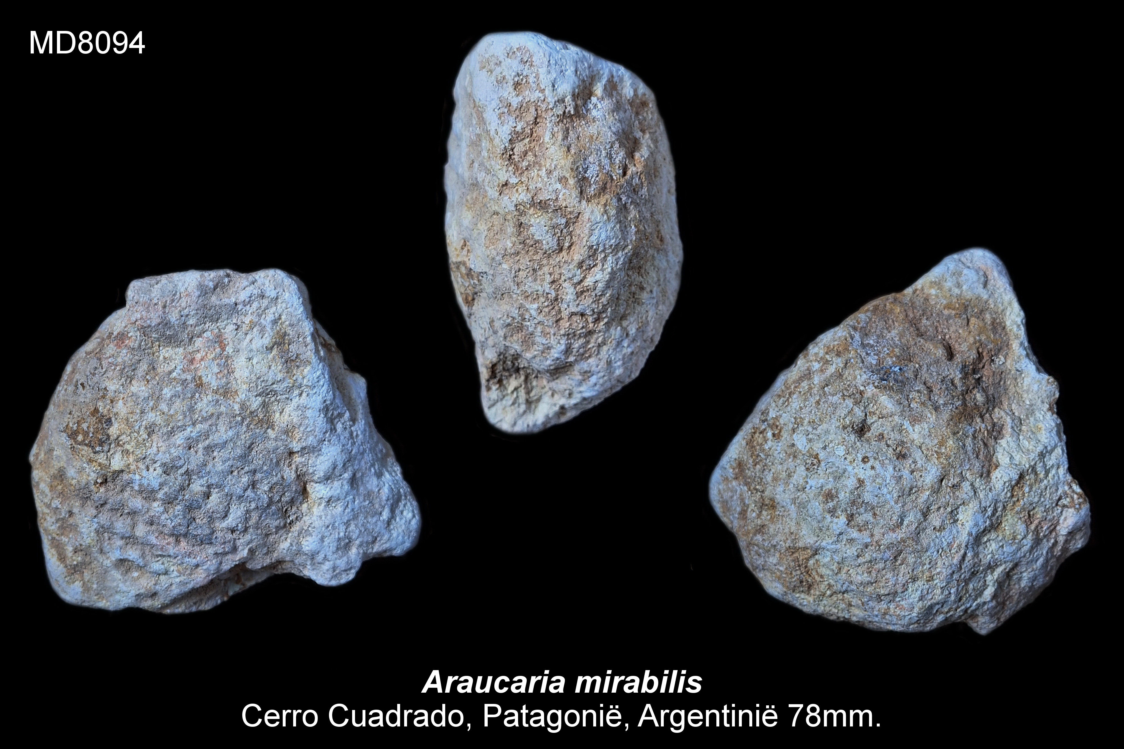 Hierbij mijn bescheiden bijdrage, met een schijf versteend hout, een juveniele kegel op steel, en een doorgezaagde volwassen kegel van Araucaria mirabilis (Spegazzini) Calder 1953, afkomstig uit het midden Jura van de La Matilde Formatie (Bahía Laura Groep) van de Santa Cruz provincie in Patagonië, Argentinië.