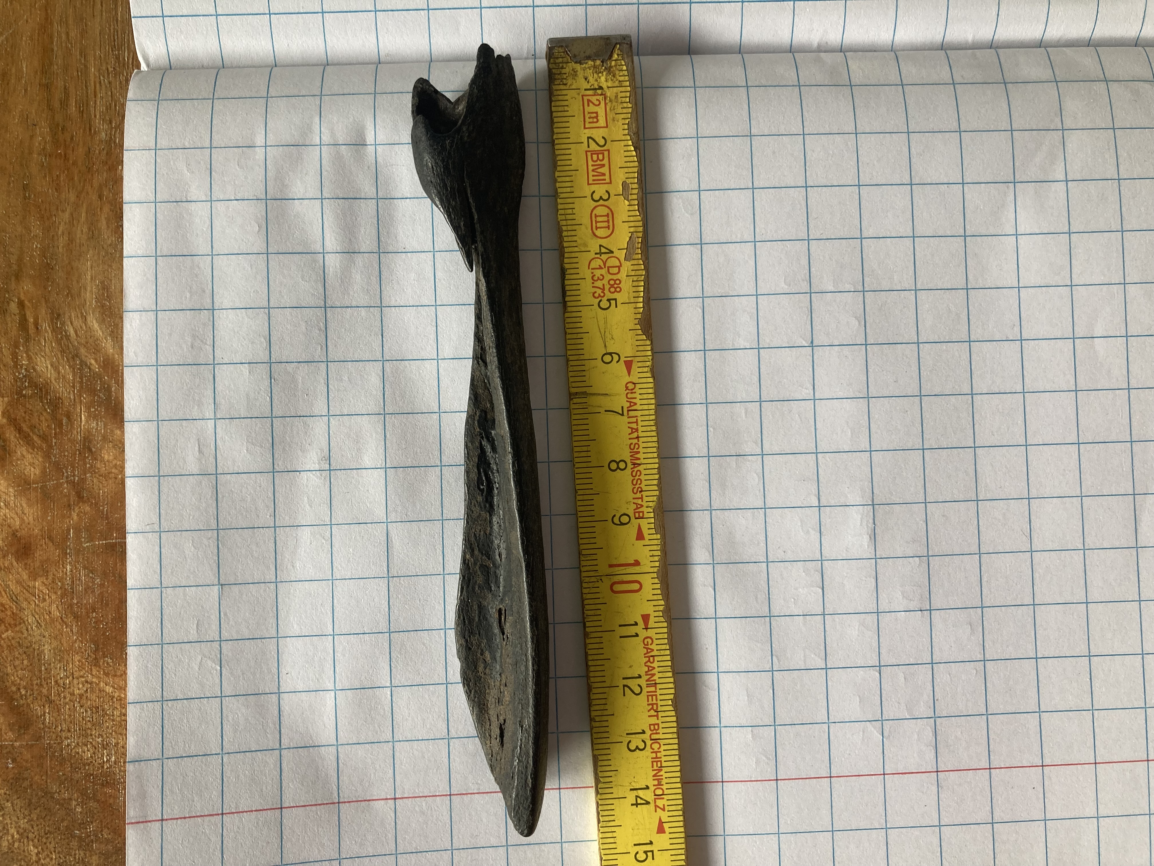 Het lijkt (met nadruk op lijkt) op een fragment van een onderkaak van een hoefdier. Het bredere stuk is dan de voorkant en het lange deel is de onderkant van de onderkaak. Typisch een stuk dat je naast een aantal botten moet houden om eruit te komen.