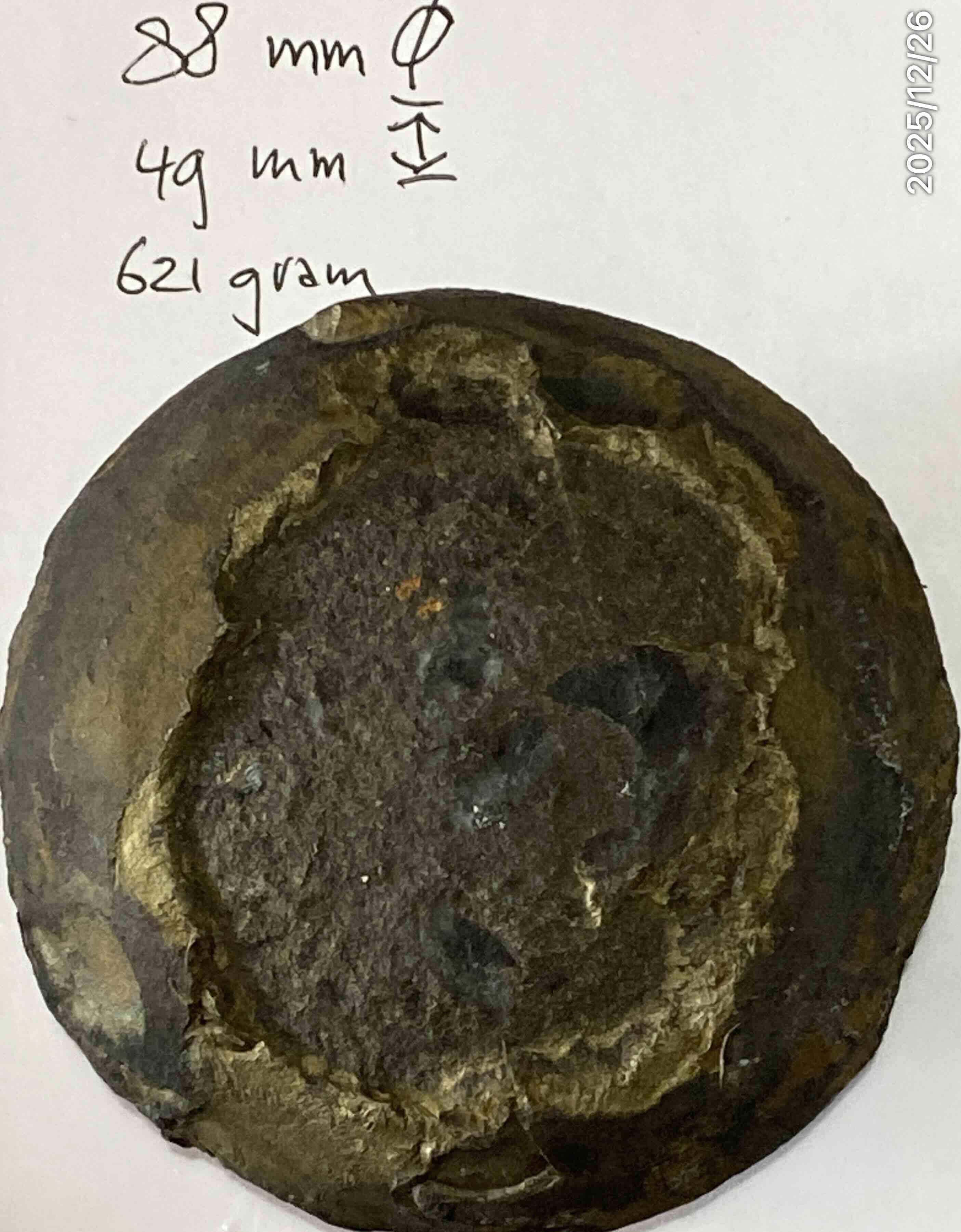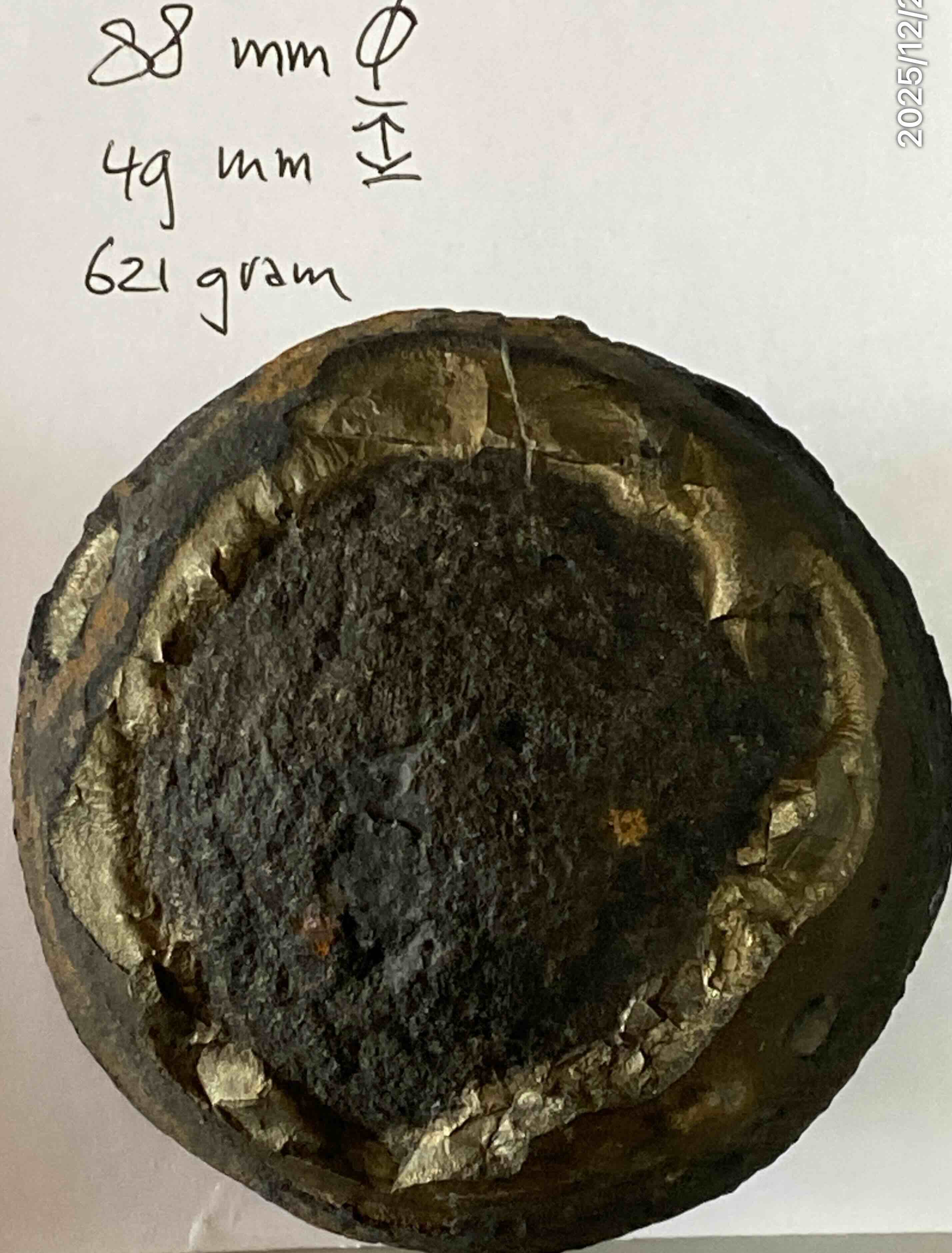 Heel zwaar 621 gram 88 mm doorsnede.Ik heb het laten zien en sommigen zeggen dat het pyriet is?