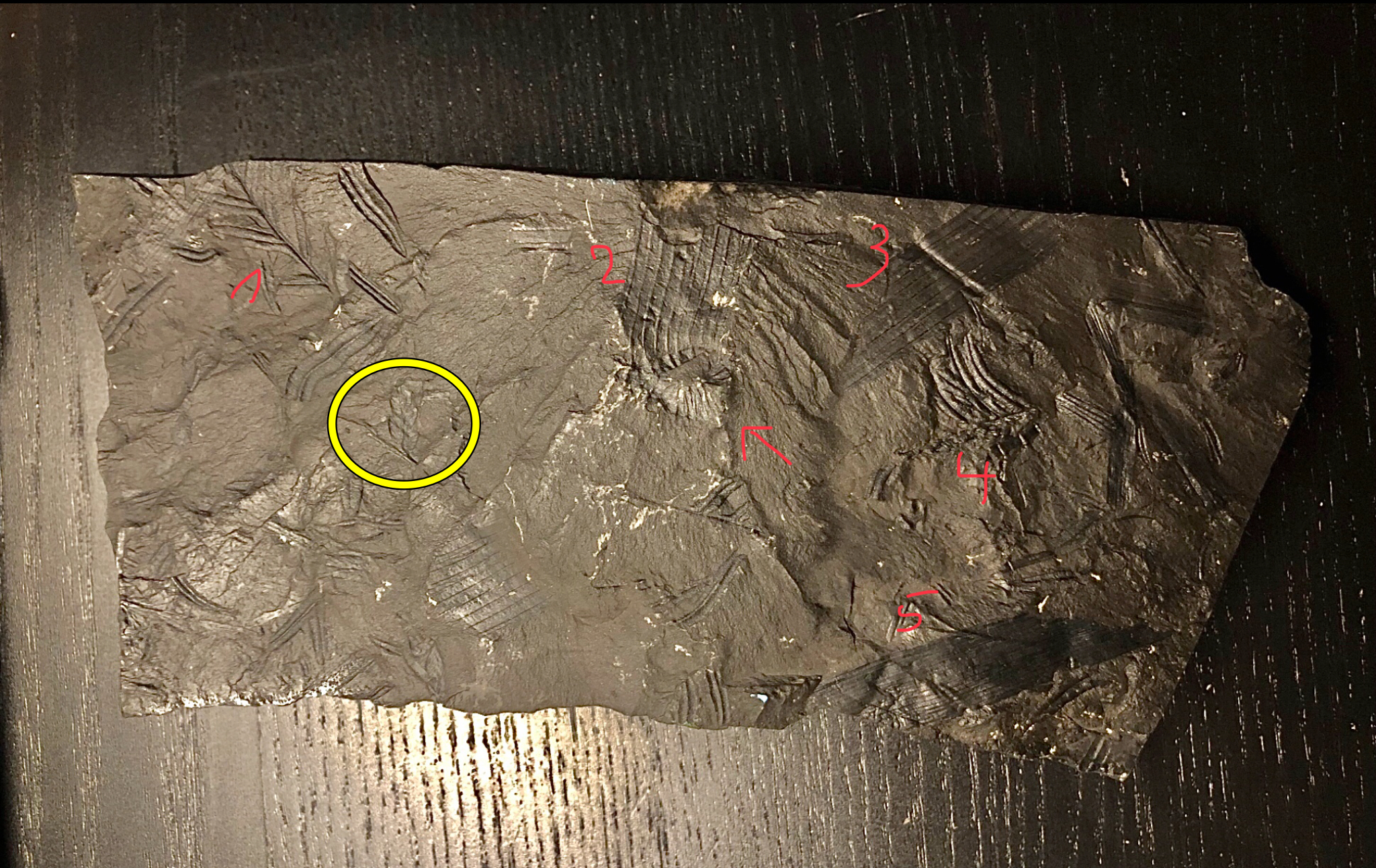 Mooi stuk. Zoals Felicia reeds aangaf, zijn "1" en "4" mooie fragmenten van Alethopteris cf. decurrens. Let wel, dit is géén varen, maar het blad van een vroege naaktzadige plant die je eerder met de cycaspalm zou kunnen vergelijken. Bij paardenstaart "2" op het overzichtje van Felicia kun je waarschijnlijk wel Calamites carinatus schrijven. Deze soort is te herkennen aan z'n grote zijtaklittekens (zie pijltje van Felicia). De meeste losse pinnulae zijn van Alethopteris, maar in de gele cirkel is ook nog een mariopteride blaadje te herkennen. Zou om een vorm als Karinopteris cf. daviesii kunnen gaan, maar zulke kleine fragmenten blijven altijd lastig, zeker vanaf foto...