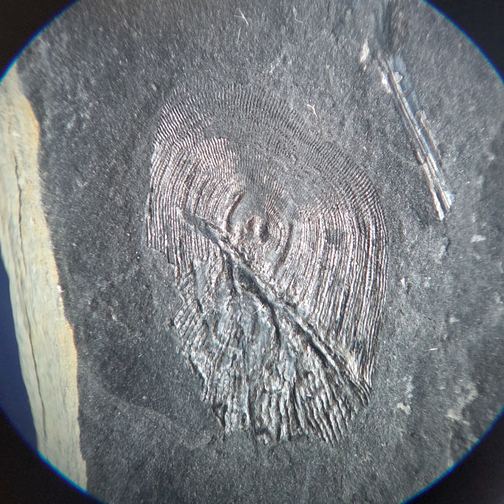 Wilde deze draad updaten met een nieuwe visschub die ik afgelopen weekend heb gevonden. Dit exemplaar is net onder een centimeter lang. Qua uiterlijk komt deze nauw overeen met voorbeelden van Rhizodopsis-schubben, maar ik durf die naam er niet met zekerheid op te plakken.