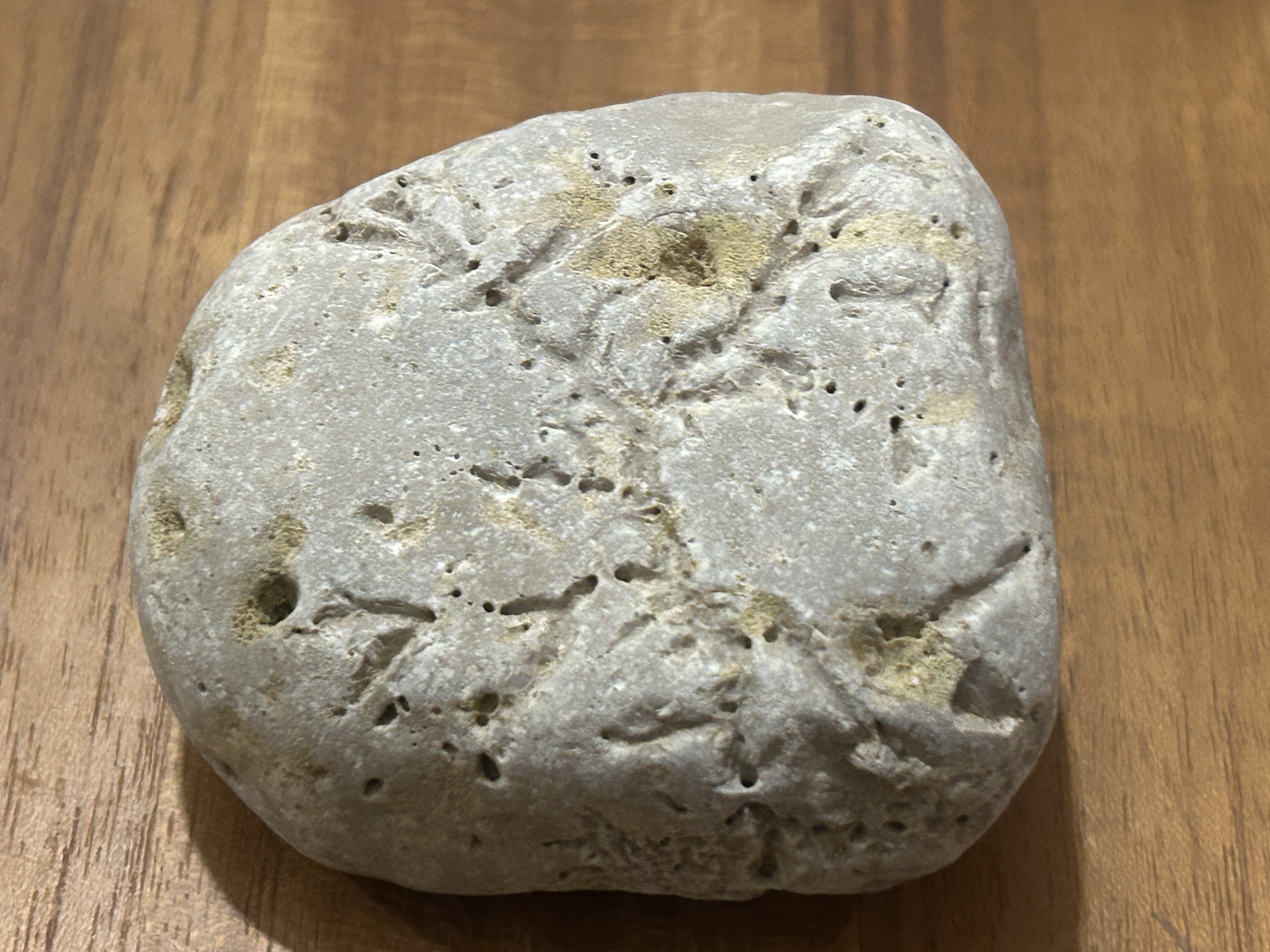 Hallo allemaal. Ik heb deze steen met wat mij een fossiel van iets lijkt gevonden op vakantie op het strand bij Sagres. Hij lag tussen honderden andere stenen en viel erg op.