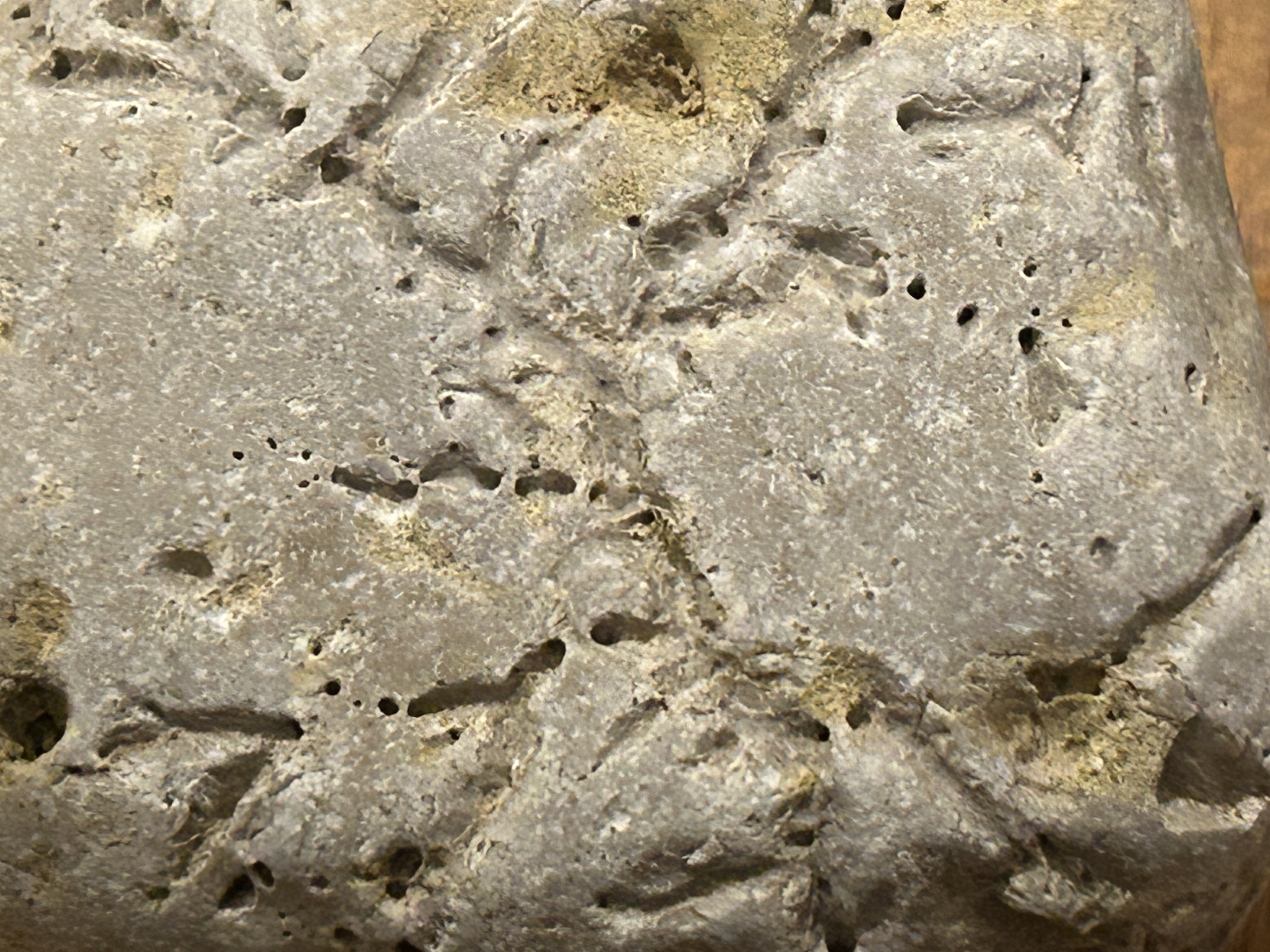 Ik denk niet dat dit een fossiel is. Misschien zijn de sporen van schelpdieren of planten die hun voedsel uit de steen halen.