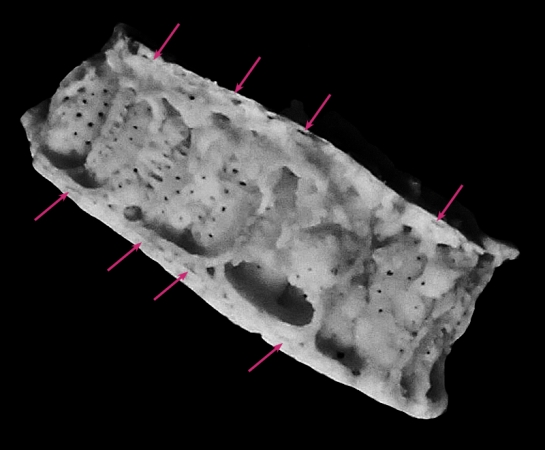 Maar als ik jouw eerste foto goed bekijk, zijn deze buitenste wanden niet echt verbonden met het binnen liggende gedeelte. Op mijn foto 2 heb ik via pijlen diegene plekken gemarkeert, waar ik een scheidingsvlak zie. Nu is het moeielijk vanaf de foto's te bepalen, of de oppervlaktes tot het fossiel zelf behoren of tot een ander organisme, dat opgegroeid is. Het zou ook kunnen, dat de buitenste wanden tot een ander organisme behoren, op dat zich het dier (de kolonie) vastgehecht heeft. Mogelijke kandidaten zouden bvb. kalkafscheidingen van algen, schelpen of dergelijke kunnen zijn.