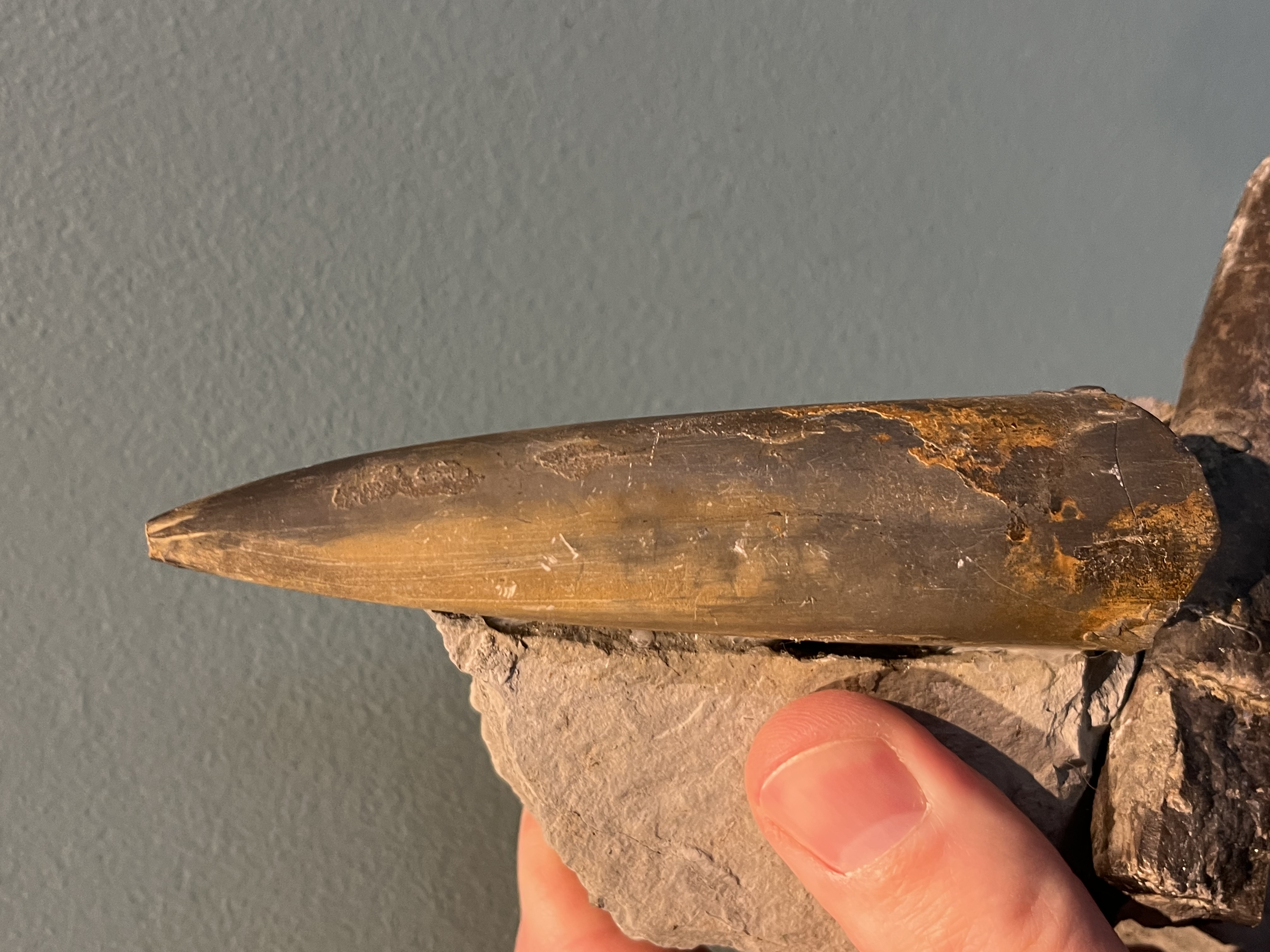 De lichtere belemniet met geel/oranje vlekken komt mij bekend voor. Deze kleur in combinatie met de verkleuring ken ik alleen van belemnieten uit de omgeving van Lotte (D). Het gesteente daar is zwart, wat niet past bij jouw stuk. De belemniet is in elk geval nog groter geweest, bij deze ontbreekt de alveole.