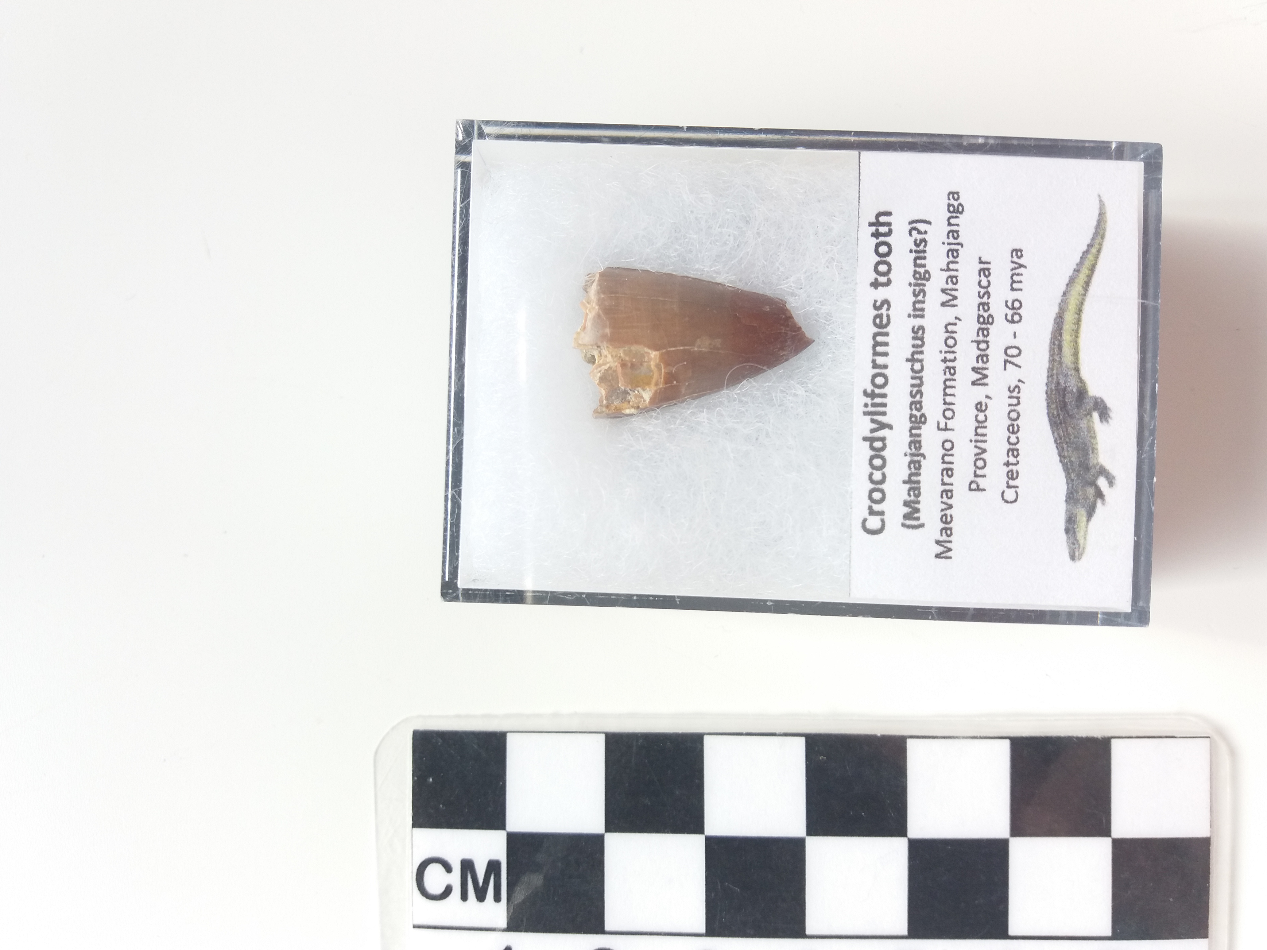 Krokodil tand gevonden in de Maevarano Formatie, Berivotra, Mahajanga Province, Magagaskar (Krijt, Maastrichtiaan, 70 - 66 mya)