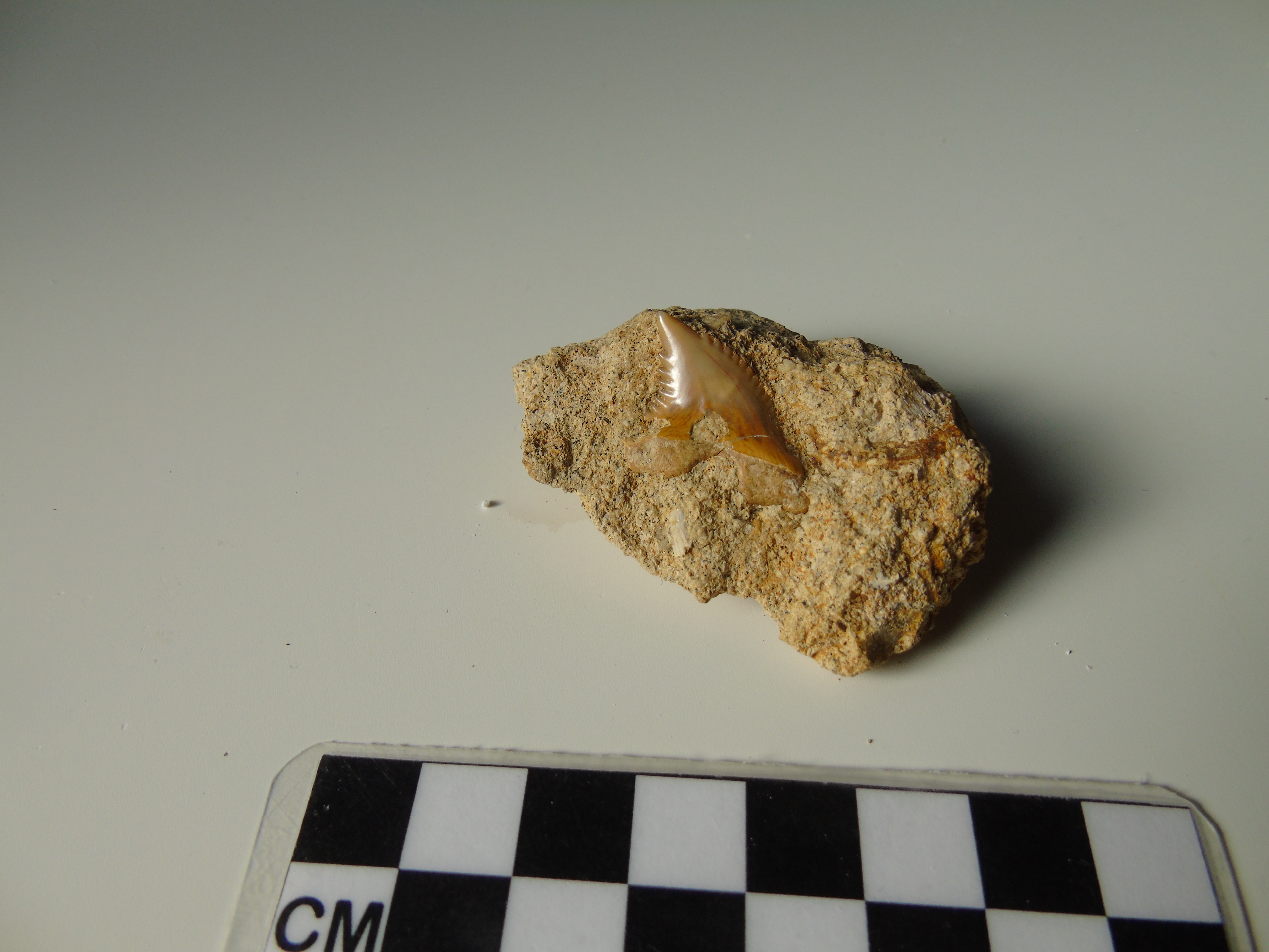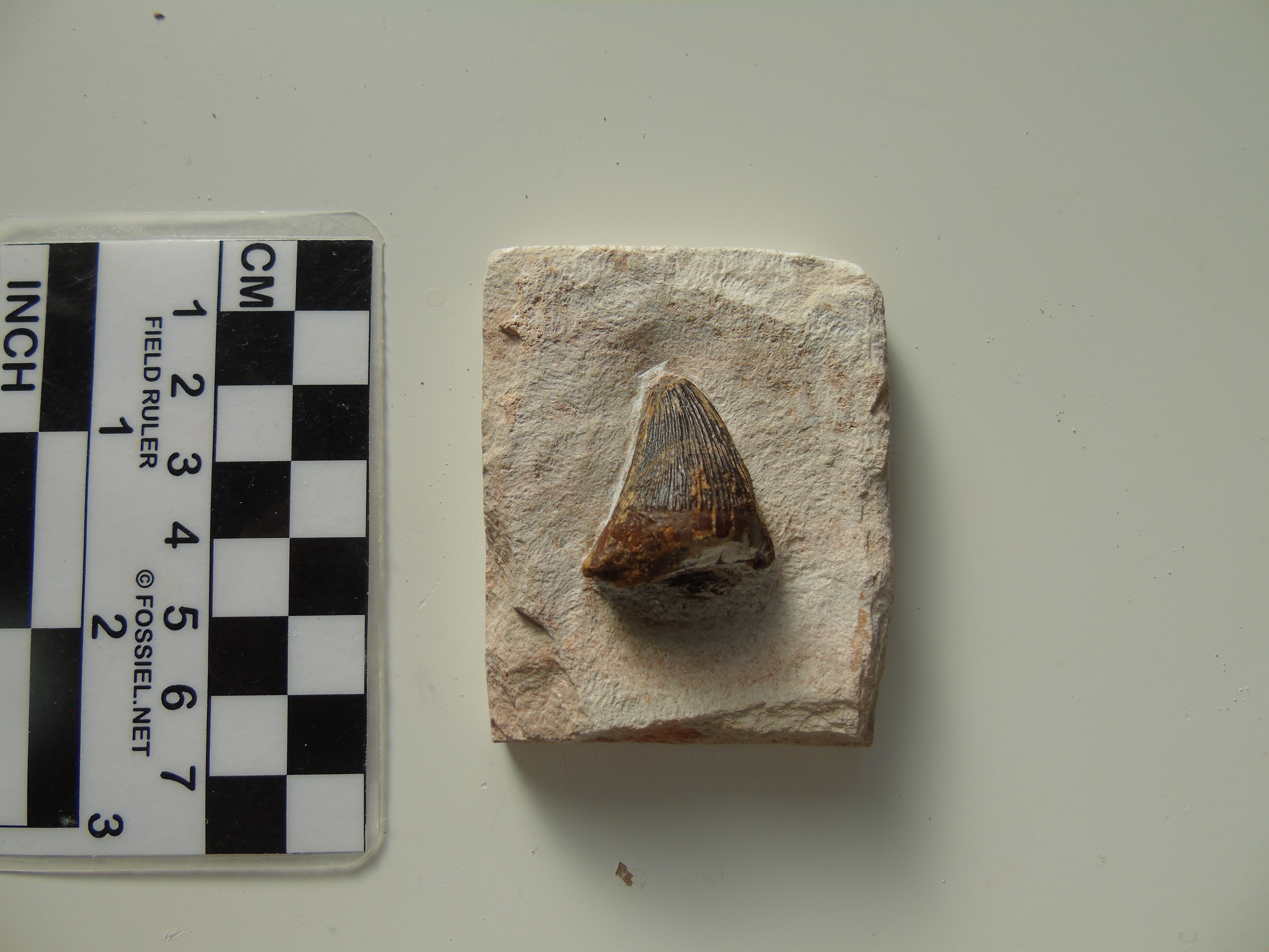 Pristis sp. rostral tand gevonden in Kallo, België (Mioceen)