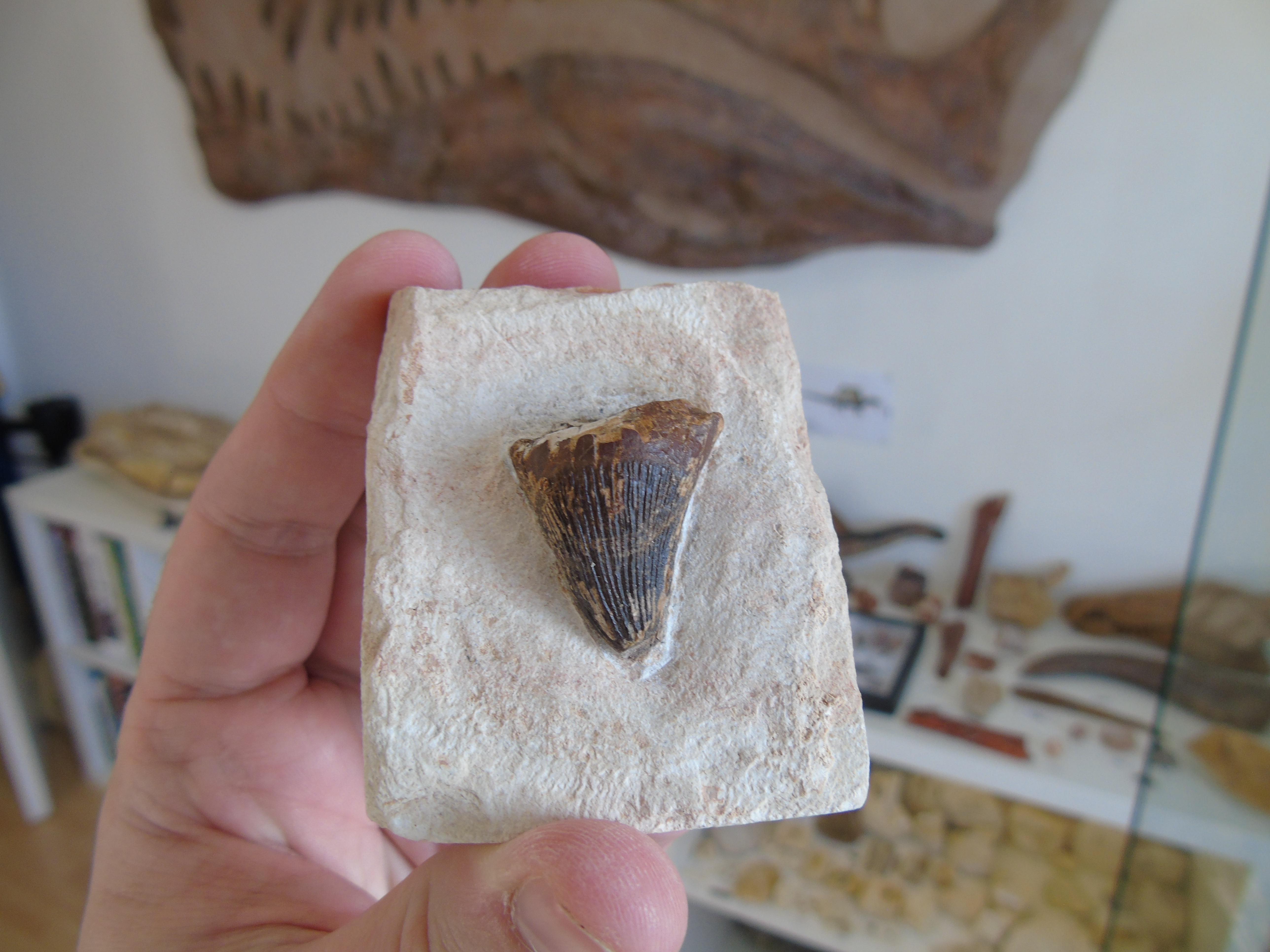 Carcharodontosaurus tand gevonden in Taquiz, Kem Kem Beds, Marokko (Krijt, Cenomaniaan, 95 mya)