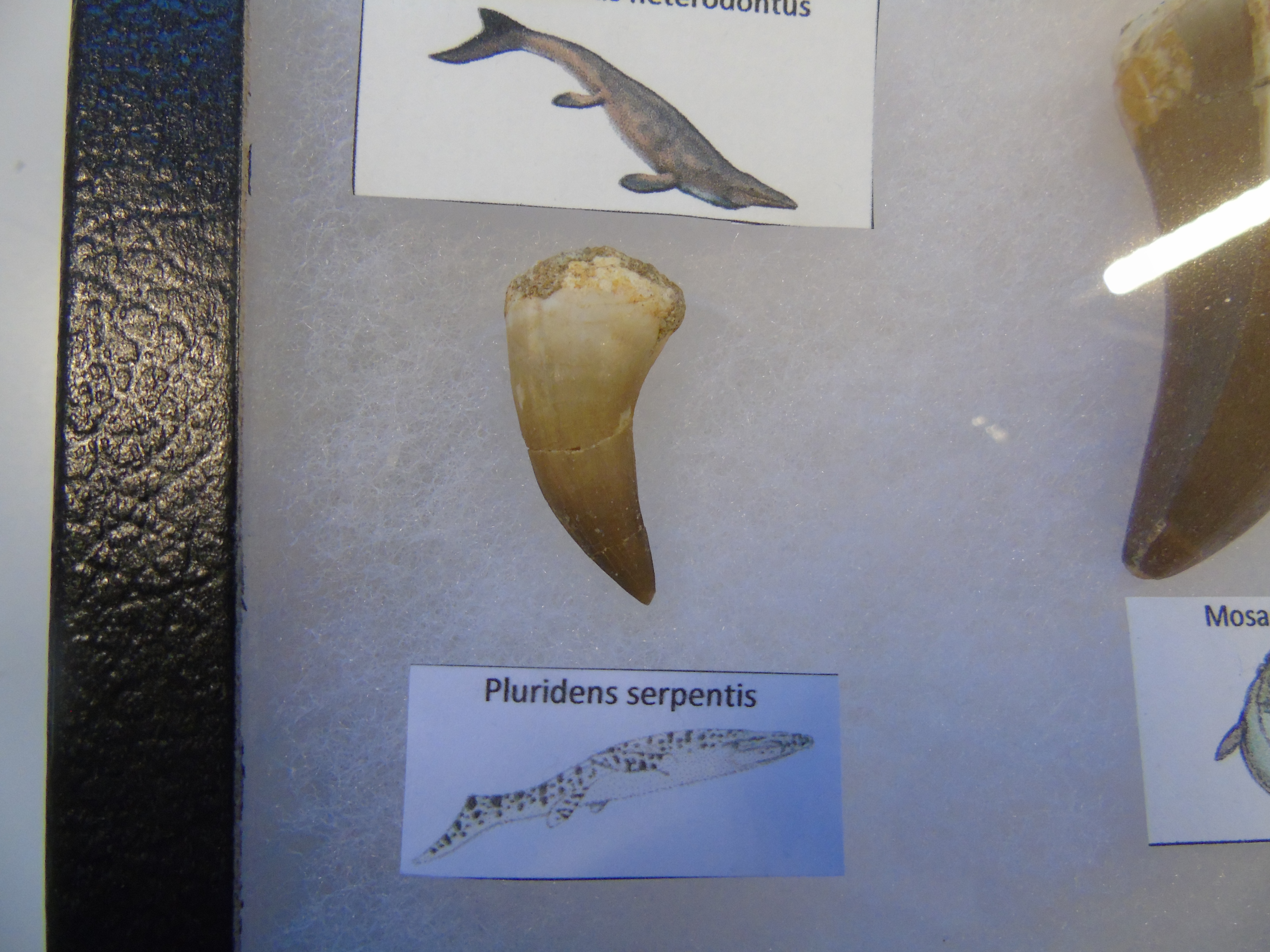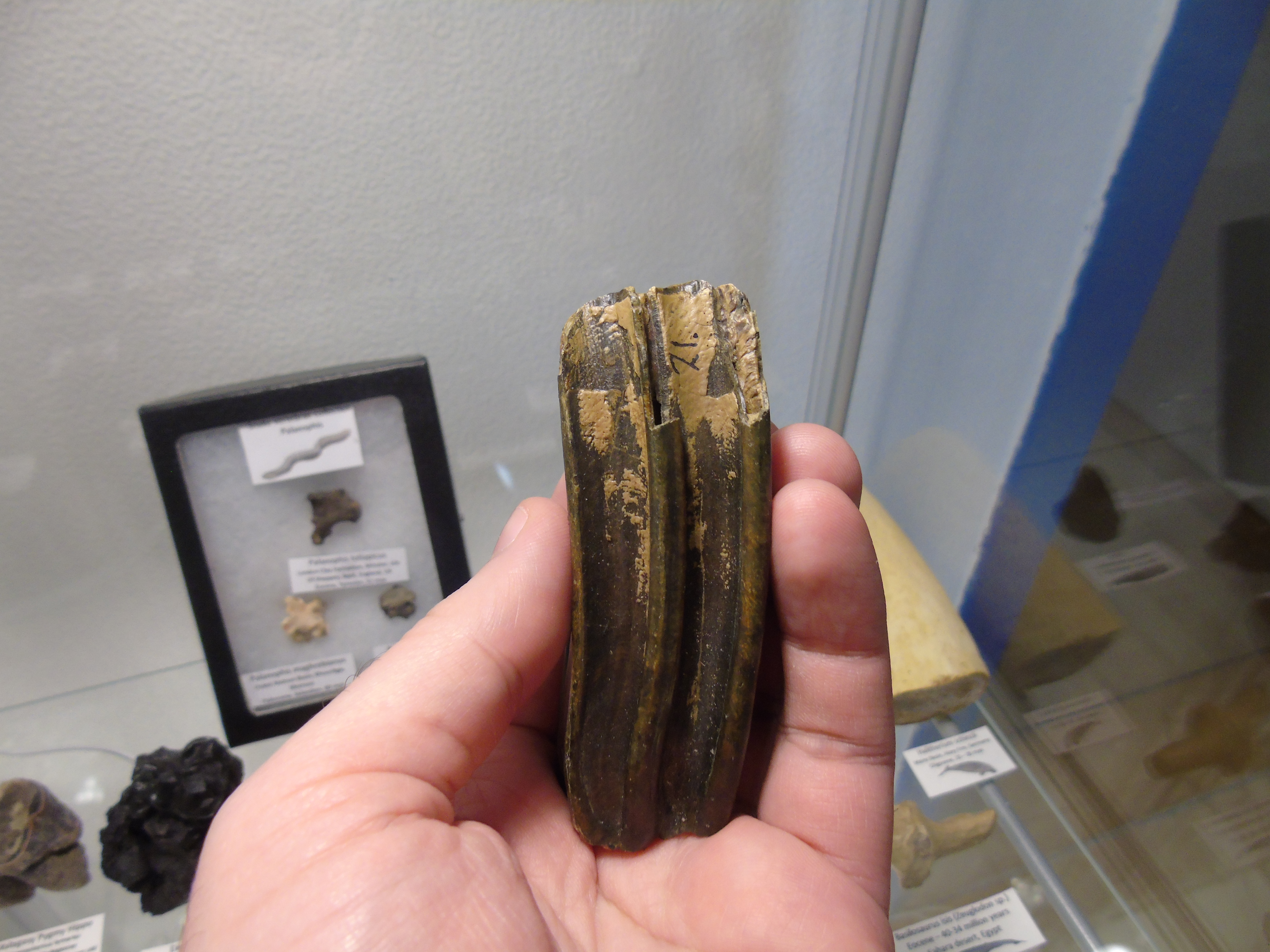 Een Mosasauriër tand gevonden in de North Sulphur River, Ozan Formation, Fannin Country, Texas, USA (Krijt, Campaniaan, 77 miljoen jaar oud)