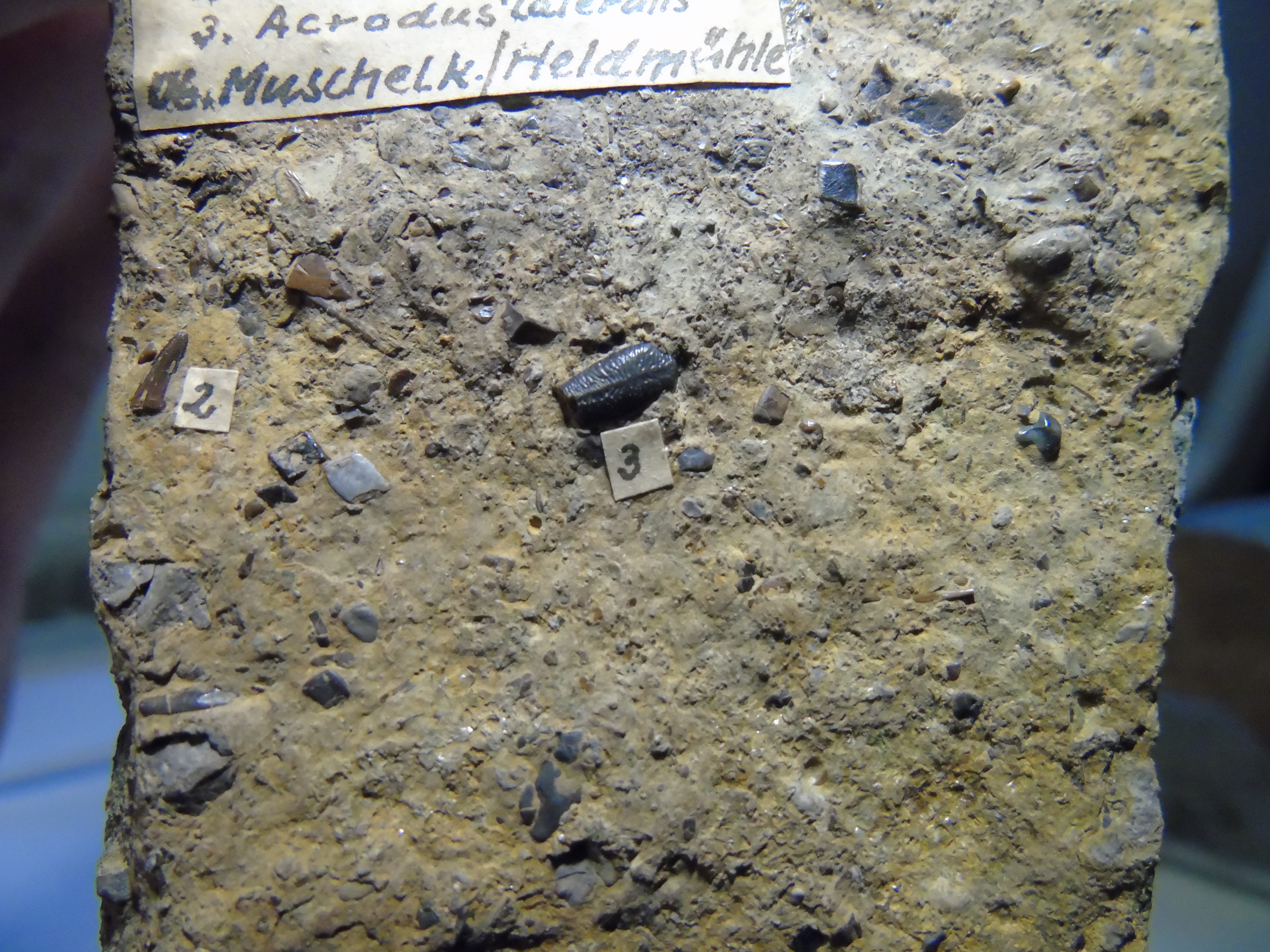 Acrodus lateralis gevonden in de Upper Muschelkalk, Heldmühle,Zemmer, Rheinland-Pfalz, Duitsland - Trias, Ladiniaan, 235 mya