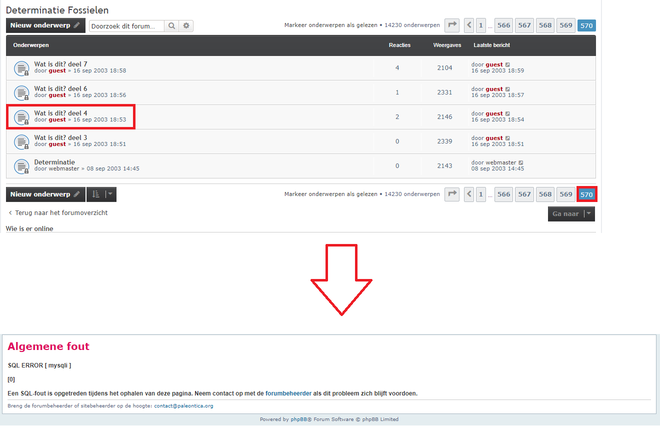 Determinatie fossielen -> De laatste pagina (momenteel 570) -> Klik op de post 'Wat is dit? Deel 4' -> daarna komt er een pagina naar voren met een database foutmelding.