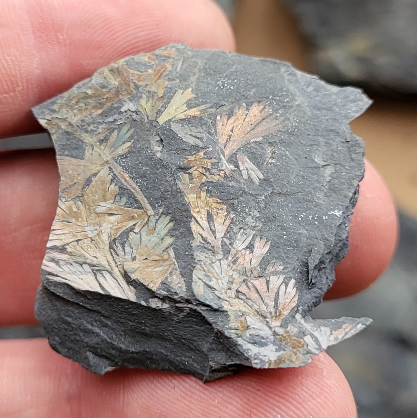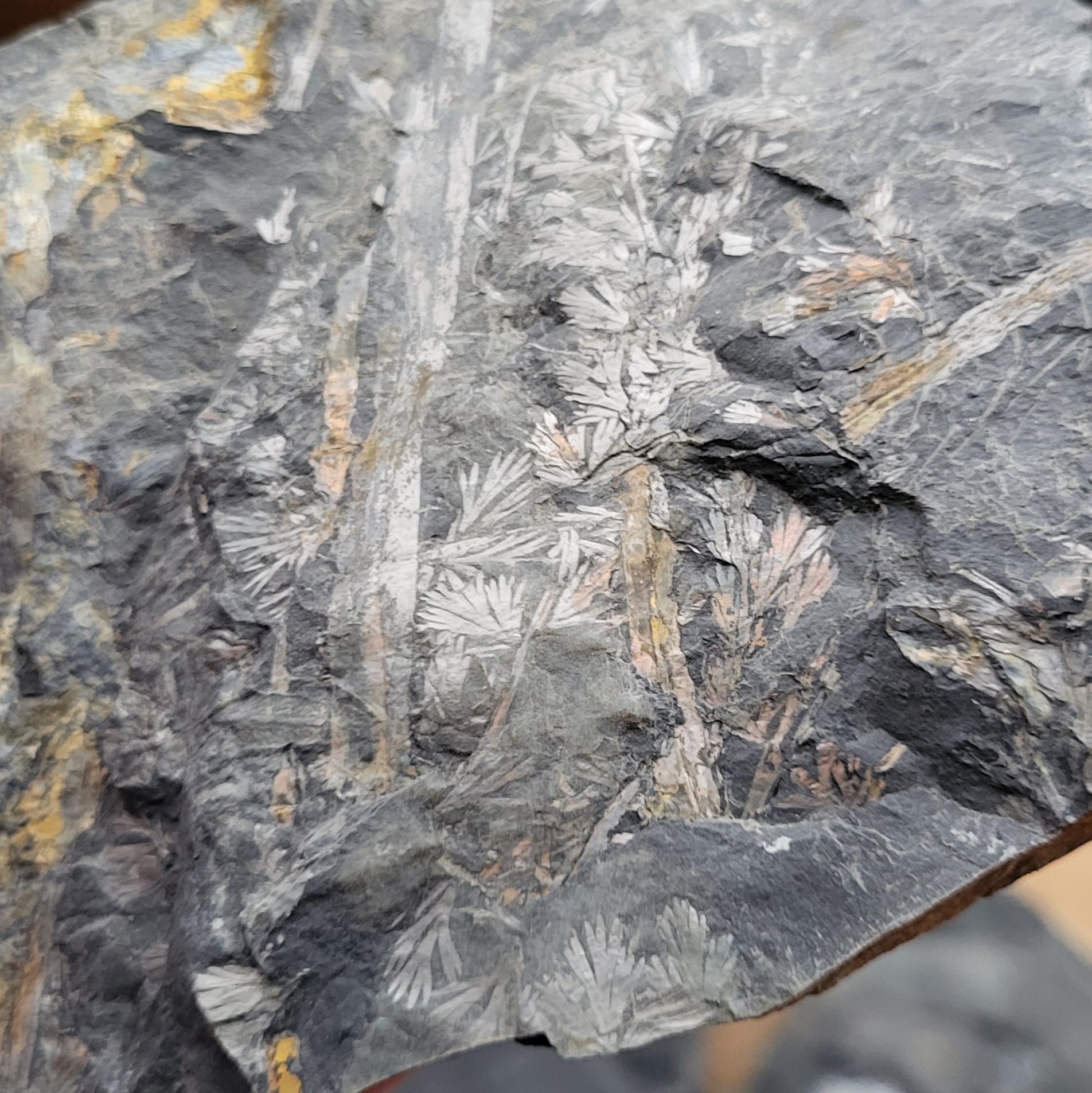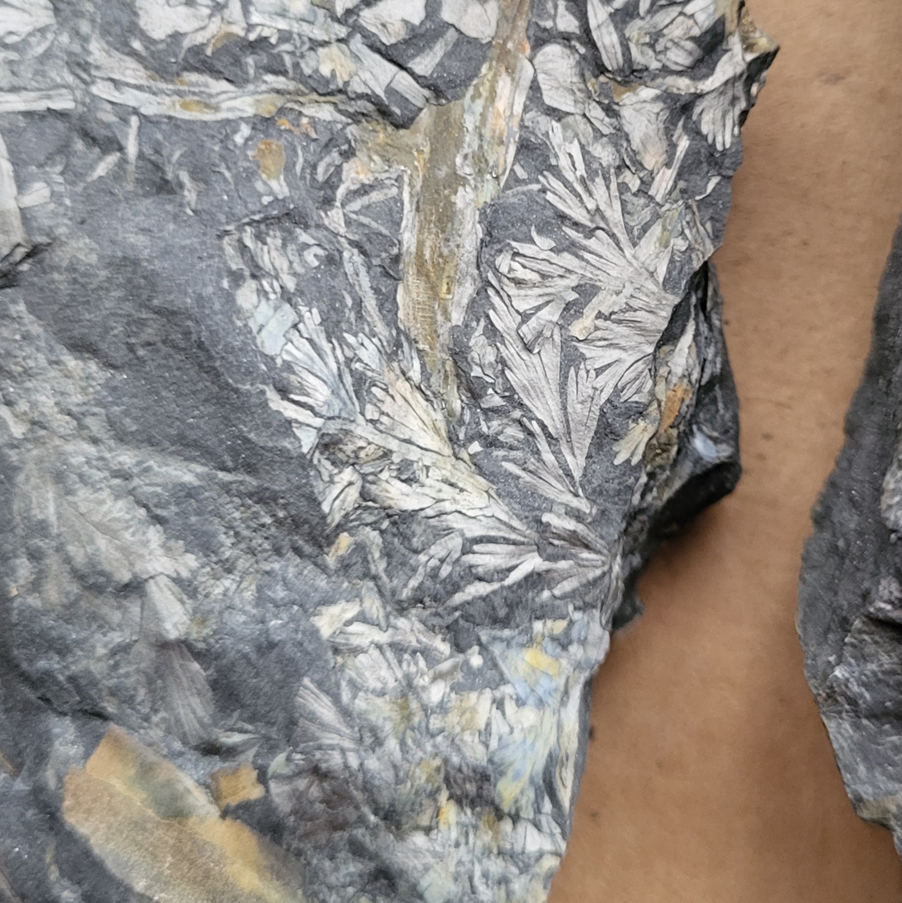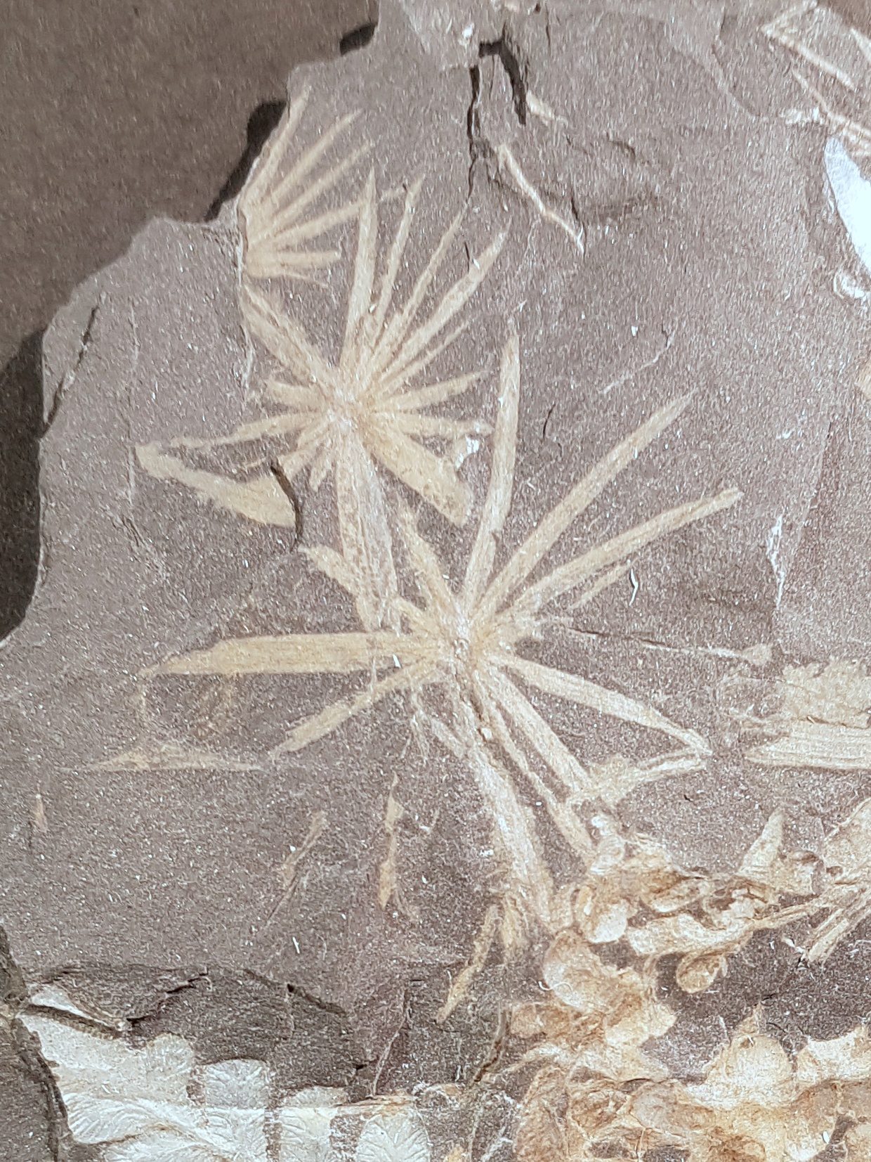 Hierbij nog wat Piesberg-planten. Het gaat om meerdere soorten loof van paardenstaarten zoals Calamites. Het vormgenus Annularia kan van Asterophyllites worden onderscheiden op basis van de vorm van de bladkransen. Bij Annularia zijn deze straal/stervormig (blaadjes uitgespreid in een cirkel of ellips), waar de blaadjes bij Asterophyllites allen omhoog wijzen en meer een waaiervorm maken. Determinatie op soortniveau is over het algemeen best lastig, maar sommige soorten hebben een karakteristieke, duidelijk herkenbare bladvorm.