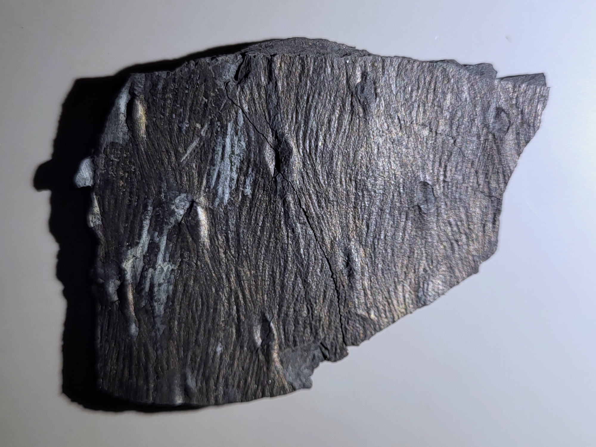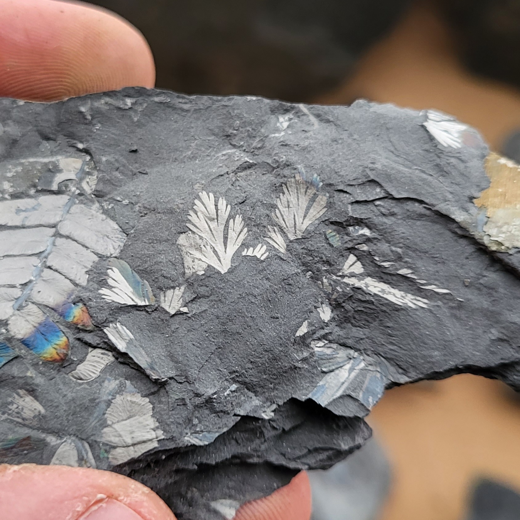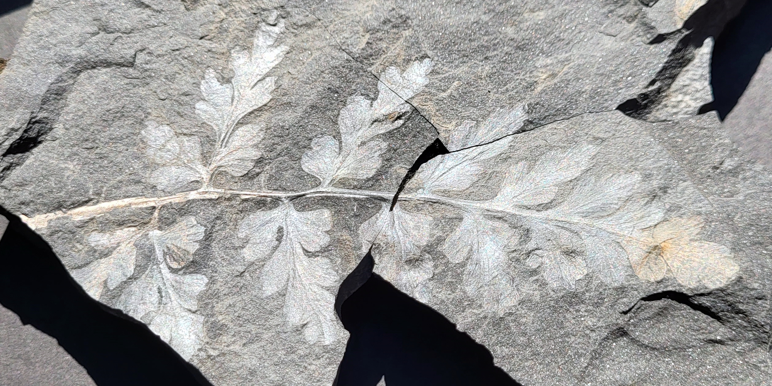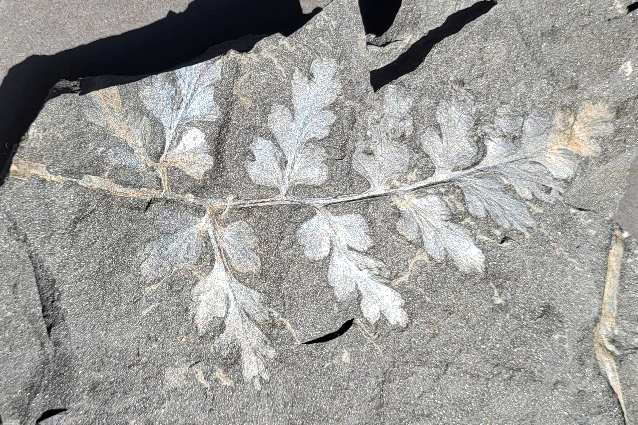 Het is dankzij een gulle gift van @petersburghoed dat ik vandaag een nieuwe soort kan toevoegen aan deze draad. Peter, nogmaals bedankt voor de mooie verzameling Carboon-planten! Het gaat hier om twee exemplaren van Sphenopteris artemisiaefolioides Crépin 1881. Hoe zeldzaam deze soort is valt lastig te zeggen, maar ik heb haar in ieder geval nooit zelf mogen vinden in de Piesberg-groeve. De eerste foto toont een 6 cm lange veer met lobvormige pinnules. Van het tweede exemplaar was slechts de basis van de rachis en een klein deel van een enkele pinnule te zien, maar toen ik het stuk steen voorzichtig verder spleet kwam zowaar een zeer fraaie tweede veer, compleet met terminale pinnule tevoorschijn! Deze tweede veer (Foto 2-3) heeft een lengte van ongeveer 13 cm en laat vrij goed de vorm en nervatuur (geen middennerf) van de pinnules zien. Op het eerste gezicht vertoont S. artemisiaefolioides misschien enige gelijkenis met Sphenopteris spiniformis Kidston 1893 (een Piesberg-plant die al eerder aan deze draad is toegevoegd), zeker in gevallen waar de stekelvormige structuren van de laatstgenoemde niet zichtbaar zijn. Voor zover ik nu kan beoordelen heeft S. artemisiaefolioides echter wat groter uitgevallen en minder diep ingesneden pinnules, alsook een beduidend minder stevige rachis. Voor meer informatie, zie Gothan, W. (1929) Die Steinkohlenflora der westlichen paralischen Steinkohlenreviere Deutschlands, Lieferung 1.