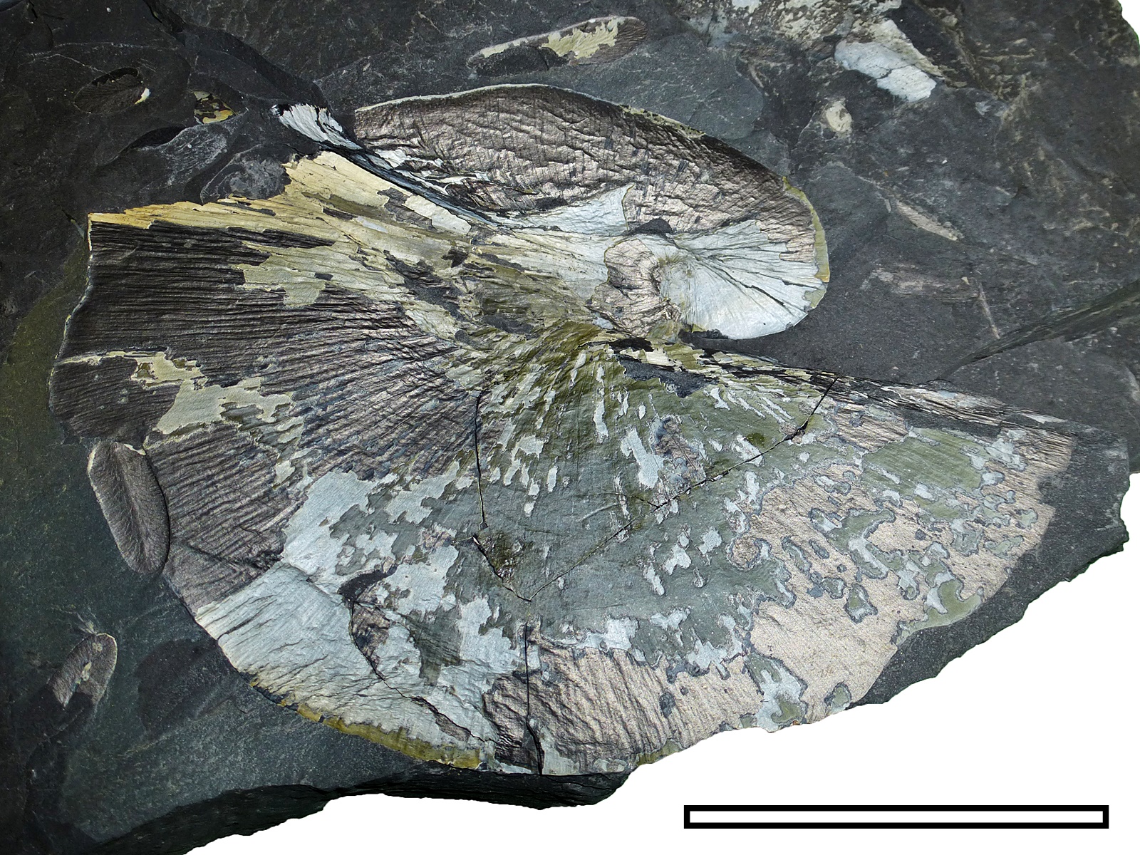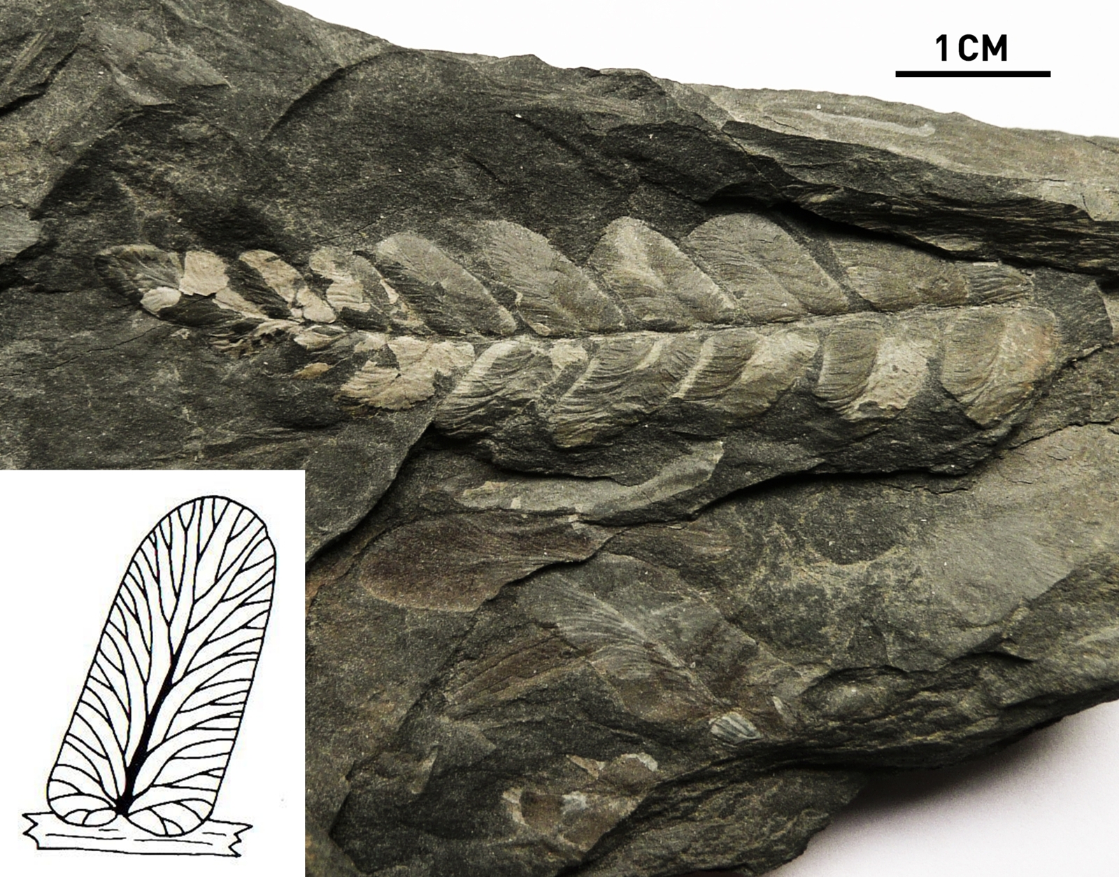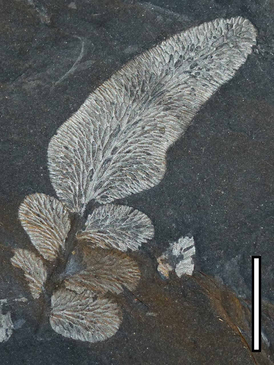 Voorbeeld van een Cyclopteris-blad (schaalbalk = 5 cm). Degelijke bladeren komen ook in connectie met L. rarinervis pinnules voor.