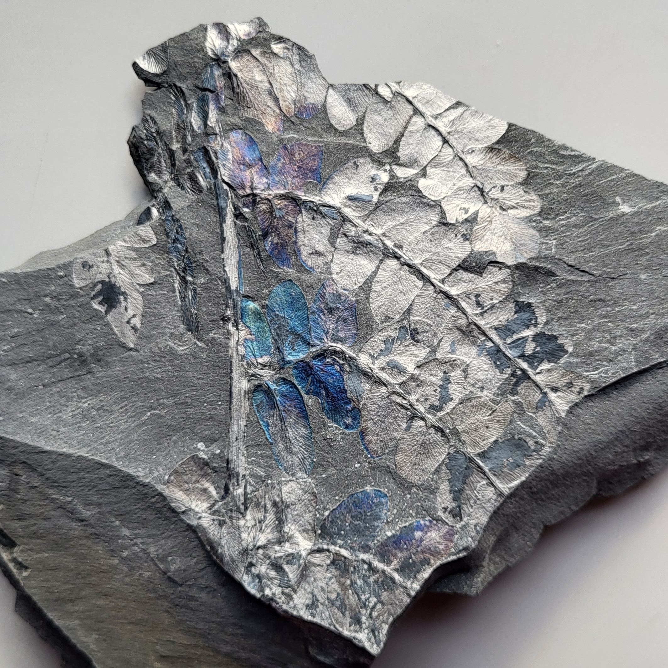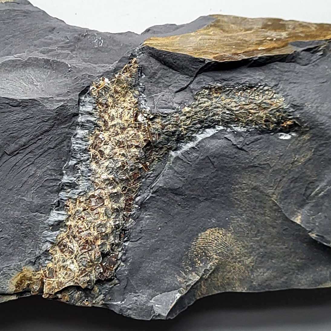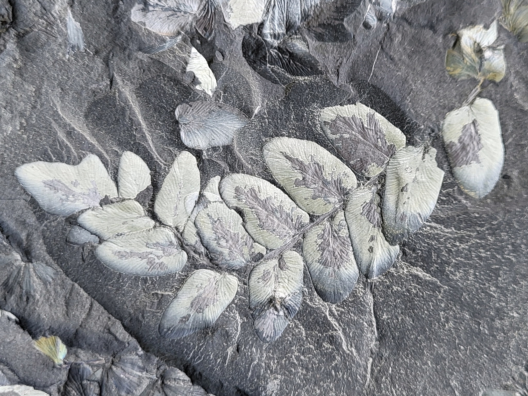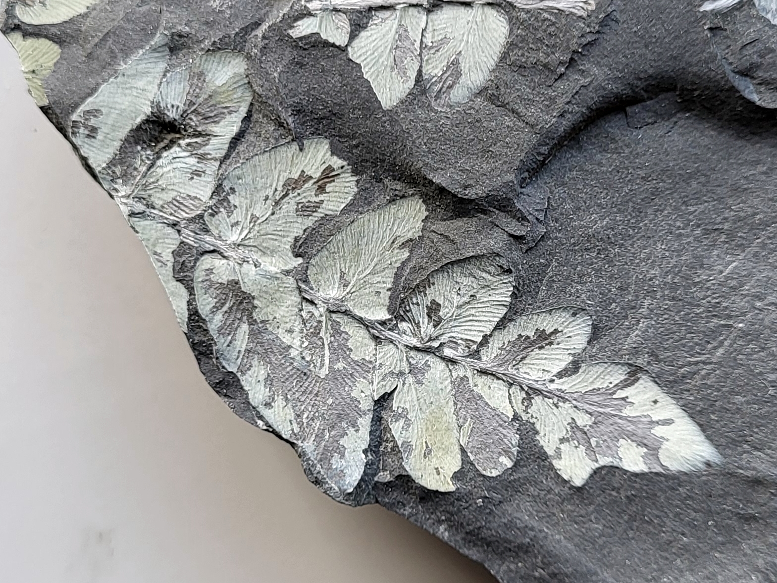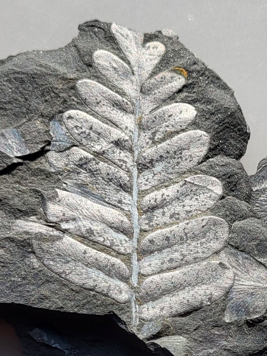 De laatste toevoeging aan deze draad is alweer even geleden, dus tijd voor iets nieuws. Onderstaande foto's tonen fragmenten van een andere neuropteride bladvorm, Laveineopteris dussartii (Laveine) Laveine 2005. Ik moet altijd grinniken van deze naam, met driemaal "Laveine". De soort werd oorspronkelijk tot Neuropteris gerekend en beschreven als N. dussarti door Laveine (1967). Later introduceerden Cleal et al. (1990) het genus Laveineopteris, voor vormen met cyclopteride "schaduwbladeren". Echter lieten zij N. dussarti buiten beschouwing. Later schreef Laveine (2005) een kritische analyse, waarin hij het genus Laveineopteris aanpaste (cyclopteride bladeren zijn niet langer het karakteristieke kenmerk voor dit geslacht, want andere neuropteride bladvormen hebben ze ook). In het paper uit 2005 werd ook N. dussarti overgeheveld naar deze "nieuwe definititie van Laveineopteris". Eindresultaat: Laveineopteris dussartii (Laveine) Laveine 2005.