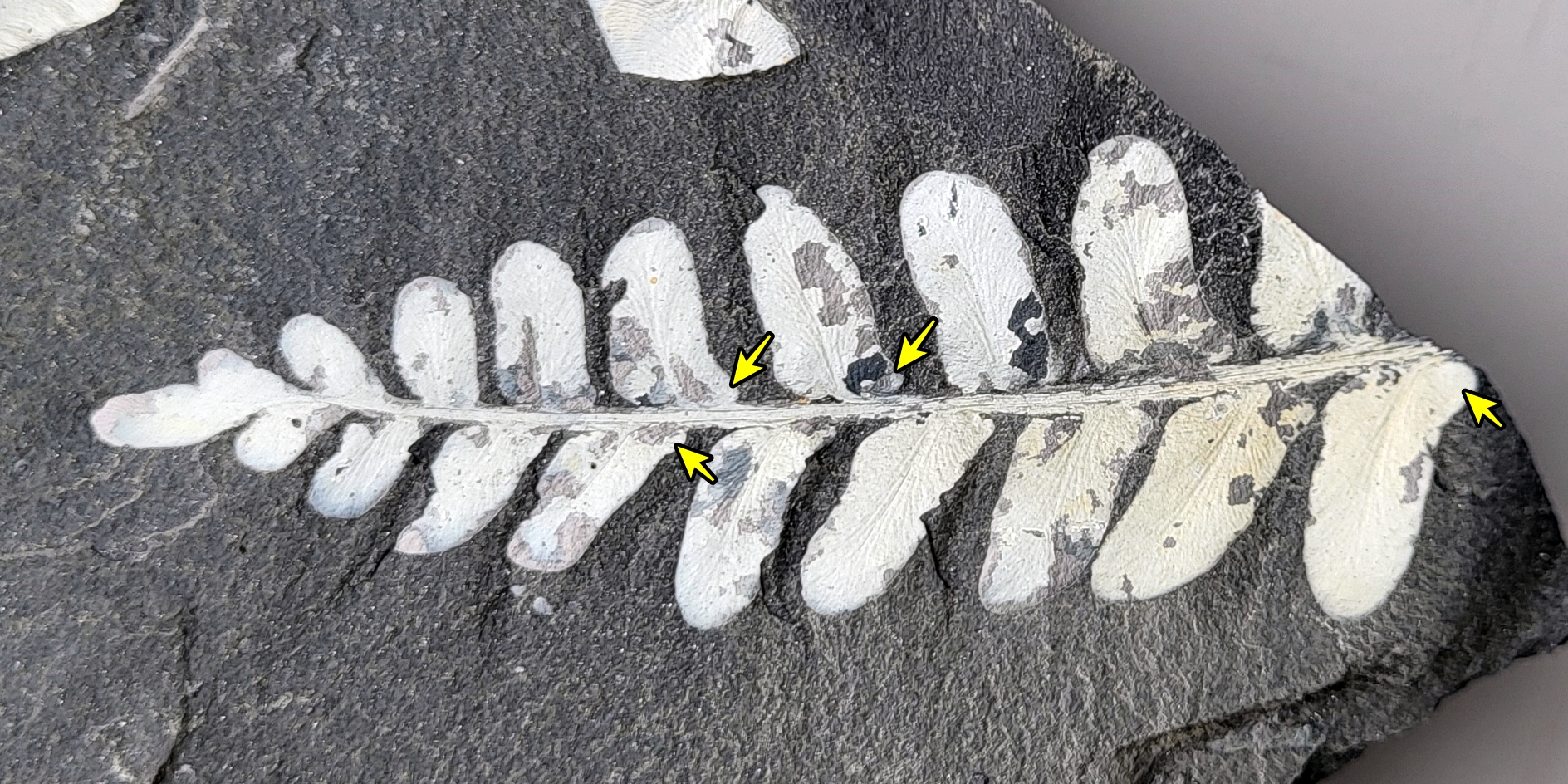 Laat ik direct weer eens een soort toevoegen aan deze draad. Dankzij de pinnulae met kenmerkende "oorlellen" (zie gele pijlen in eerste foto) is Neuropteris ovata Hoffmann 1826 is een relatief gemakkelijk te herkennen neuropteride bladvorm. Dichter naar het uiteinde van de pinna zijn de pinnulae vaak in meer of mindere mate vergroeid. In sommige gevallen, zeker bij de grotere, kunnen de pinnulae meer langwerpig driehoekig van vorm zijn.Dezelfde plant droeg ook "gerafelde" cyclopteride bladeren, Cyclopteris fimbriata Lesquereux 1858, waardoor je deze regelmatig samen met Neuropteris ovata Hoffmann 1826 tegenkomt (zie laatste foto).