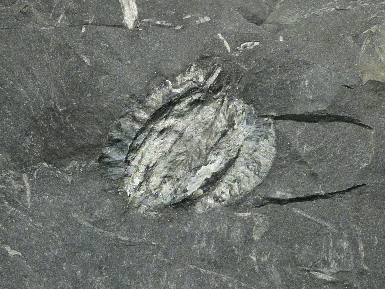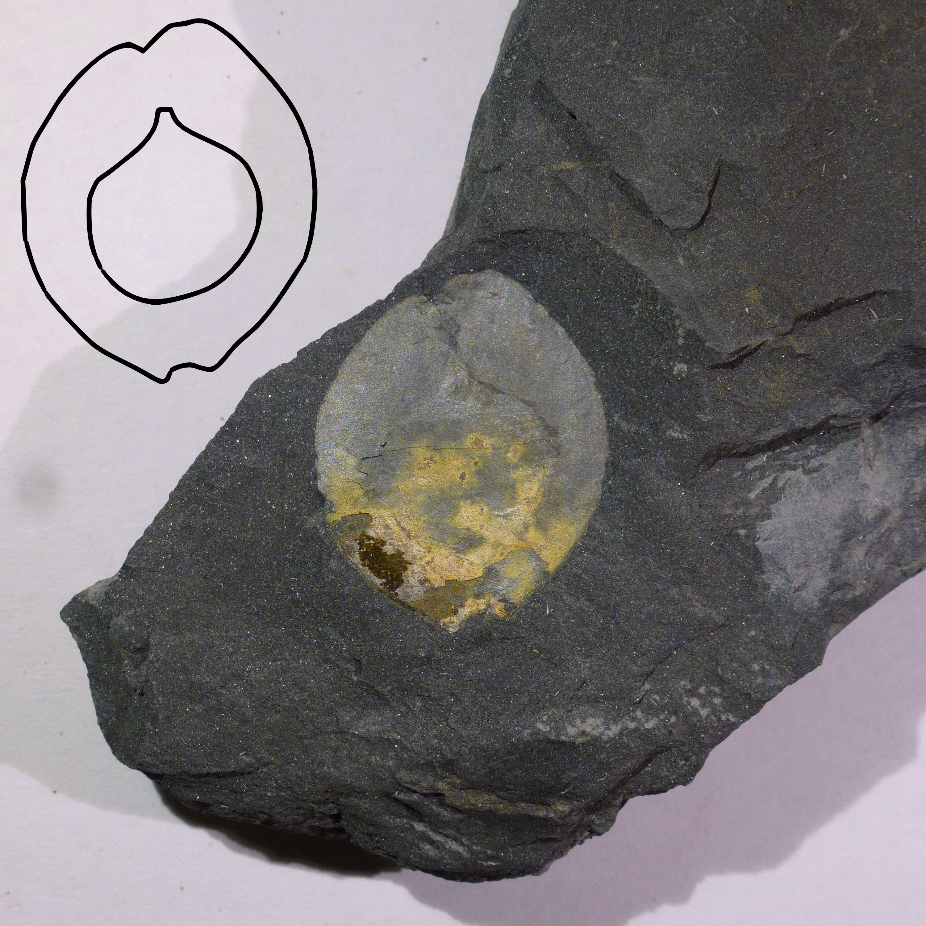 Onderstaande foto toont een 22 mm lang zaadje met een kenmerkende, volledig rondgaande vleugel (zie schetsje linksboven). Zaden van dit type worden tot Samaropsis gerekend. Dergelijke zaden worden soms in verband gebracht met Cordaites.