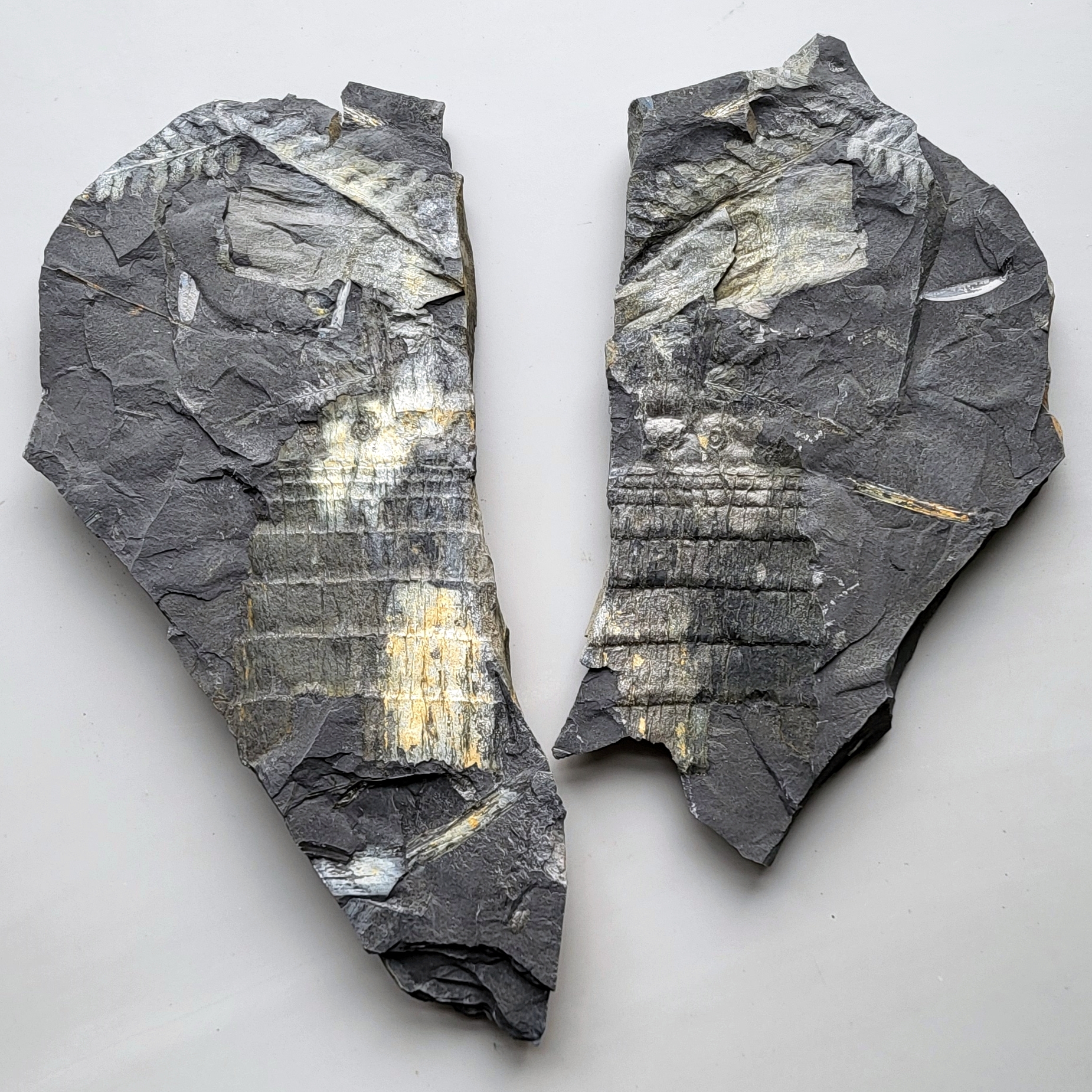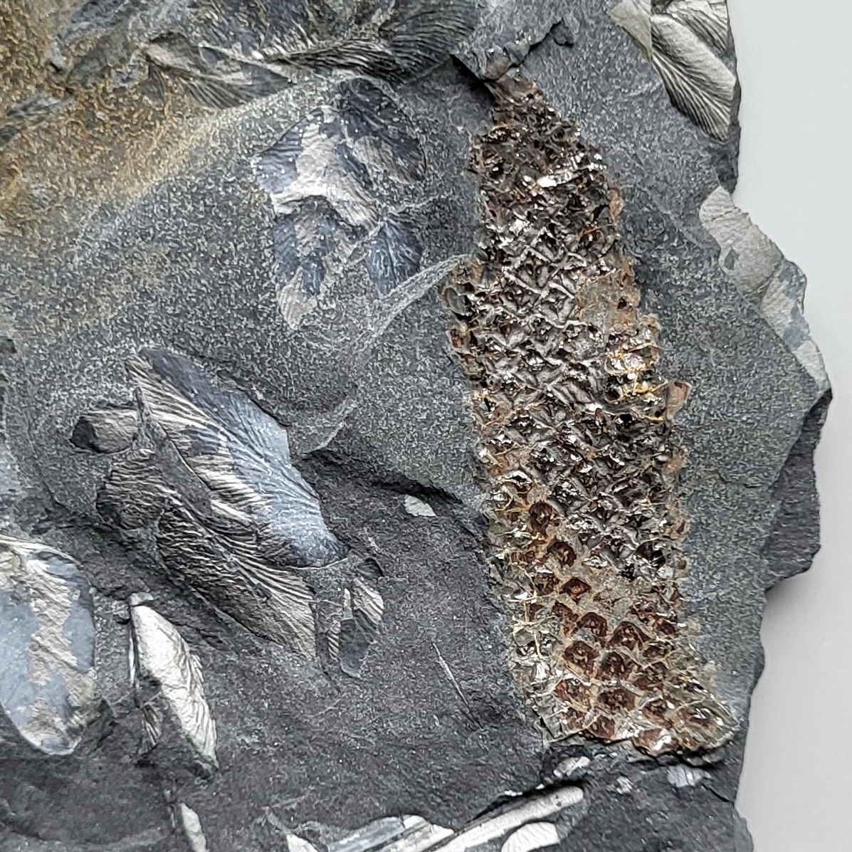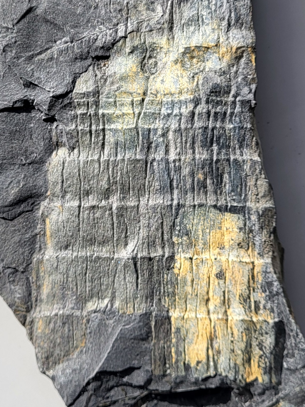Tot nu toe heb ik maar weinig lycopoden de revue laten passeren in deze draad. Tijd om daar wat aan te doen. Bijgevoegde foto's tonen vegetatieve assen van Lepidophloios acerosus (Lindley et Hutton) Kidston 1890. Het geslacht Lepidophloios wordt gekenmerkt door neerwaarts hangende bladkussens, waarbij het bladlitteken aan de basis van de uitpuiling zit. Volgens een recente revisie van Cleal en Thomas (2022) is er slechts één soortnaam voor de vegetatieve assen; kijk, dat vergemakkelijkt de determinatie aanzienlijk! De stukken van de Piesberg komen sowieso goed overeen met de omschrijving en afbeelding van Lepidophloios acerosus (zie Figuur 14 in de gelinkte PDF).