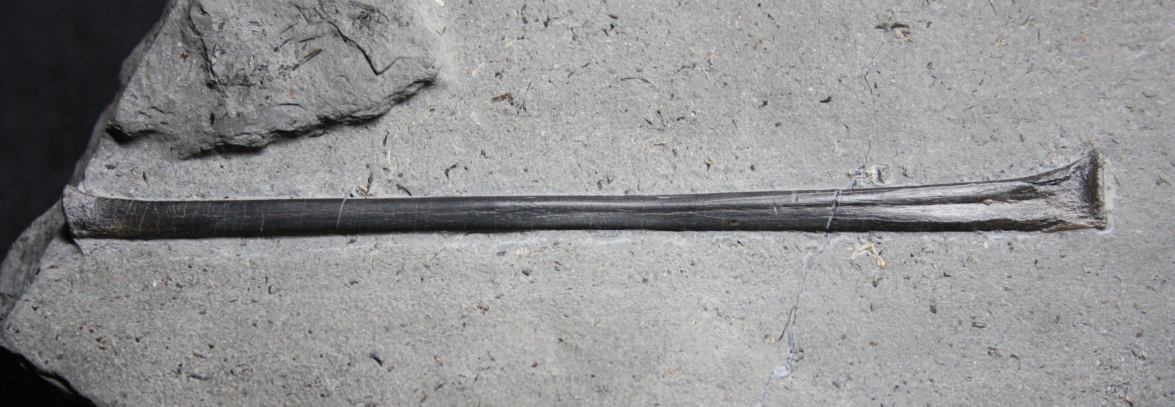 Deze was ook mooi, een botje (phalange) uit de vleugel van een pterosaurus, Jura van Schotland. Zie het botje in gele matrix en de vergelijking met een completer bot uit Duitsland.