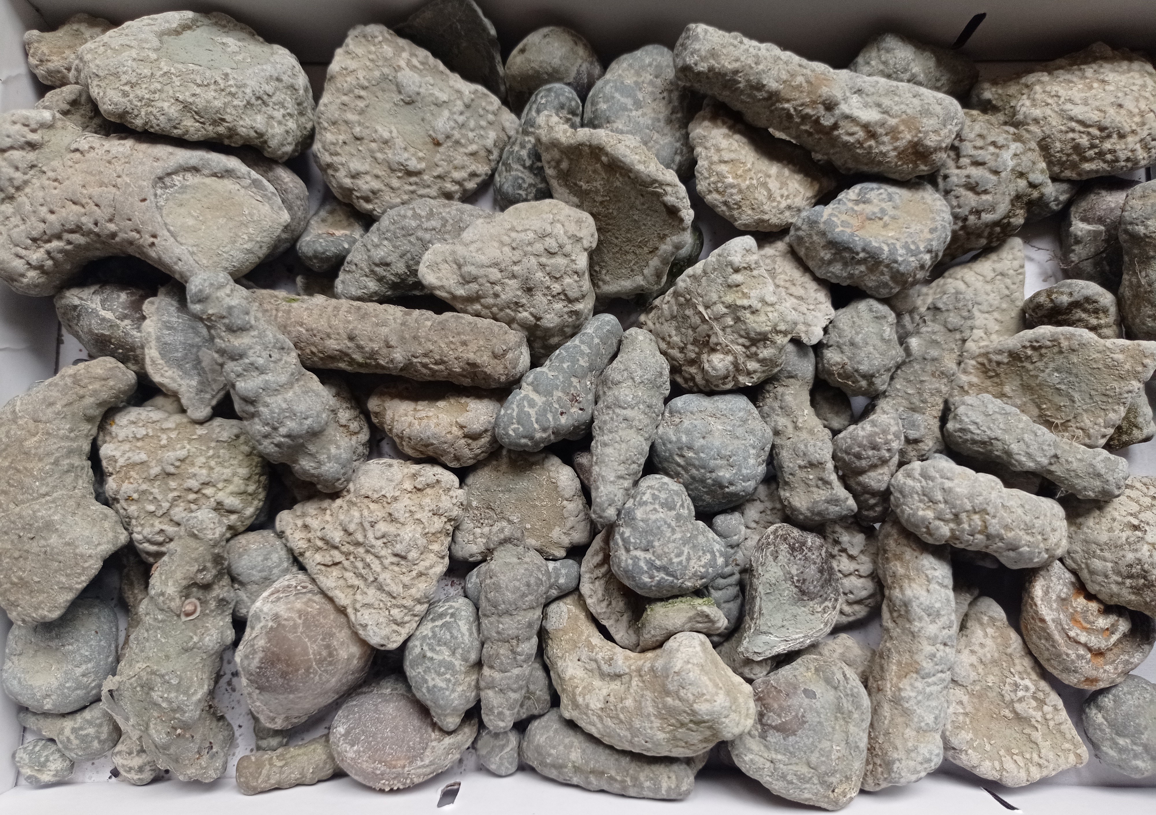 Vaak hebben deze als groeikern gediend voor cyanobacteriën, ingepakt door kalkalgen en zijn zgn. ‘oncoïden’ geworden. Aan de ene kant jammer dat je ze door de onregelmatige kalkkorsten niet meer goed kunt herkennen (lijken wel mummies), maar ook bijzonder interessant vanwege het Lau-event en de barre levensomstandigheden die zulk een uitbundige algenbloei mogelijk maakte.